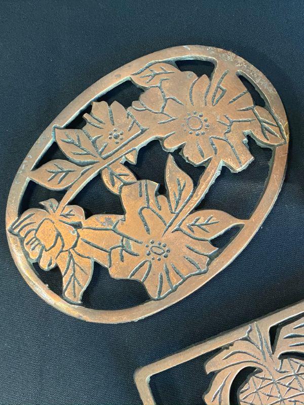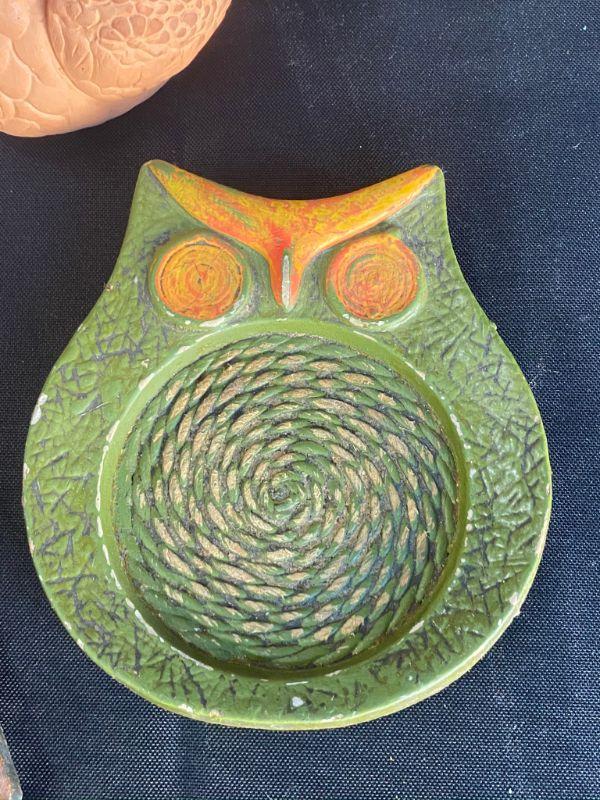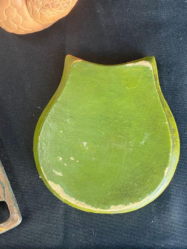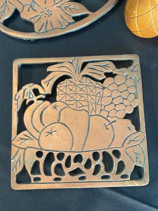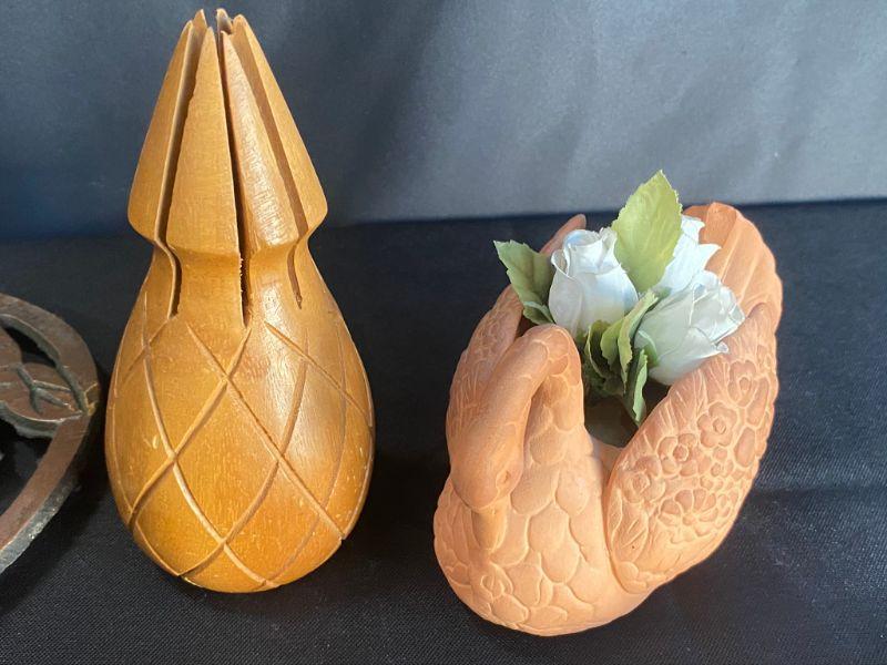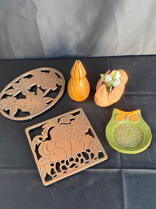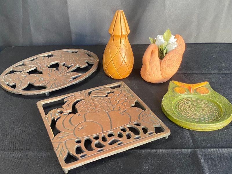 5 piece household decor lot. 2 copper trivets, an owl coaster, clay swan, and a pineapple.