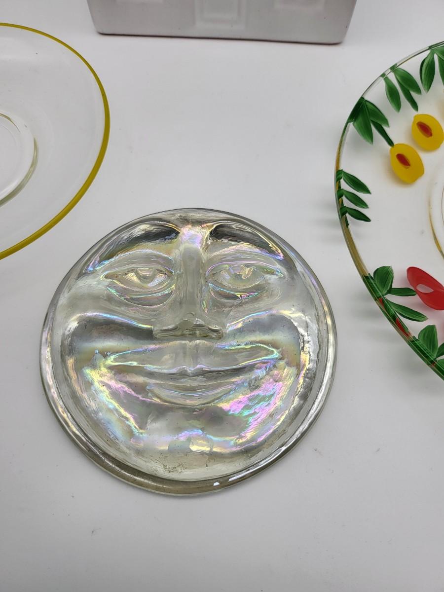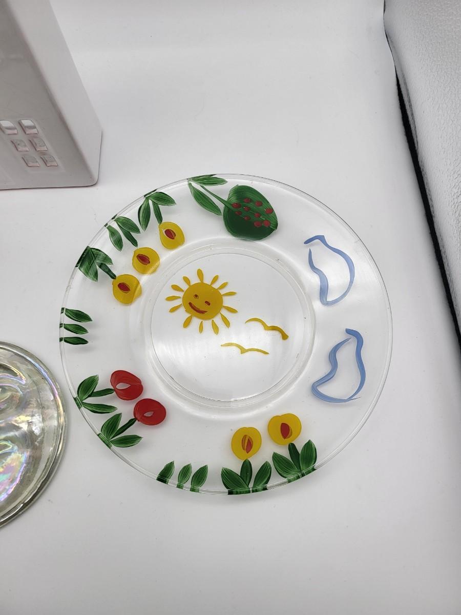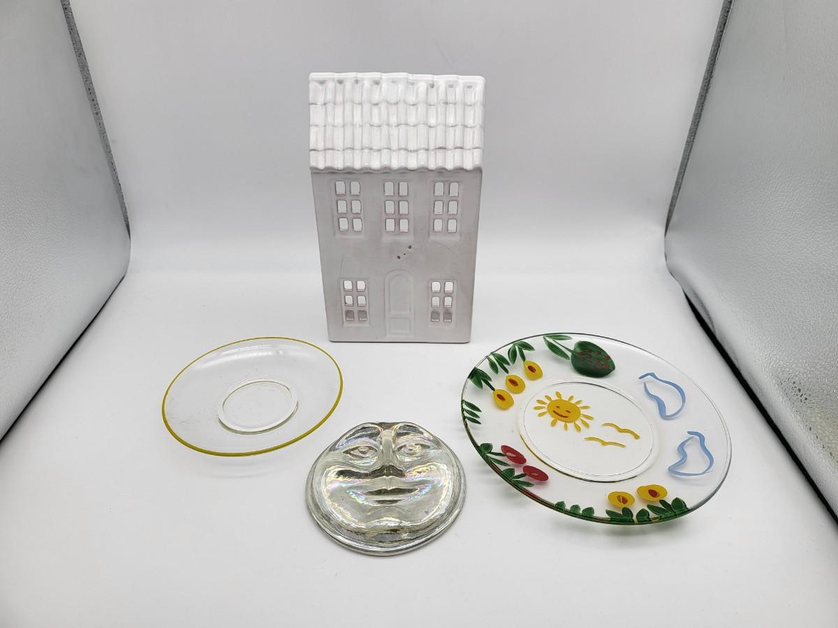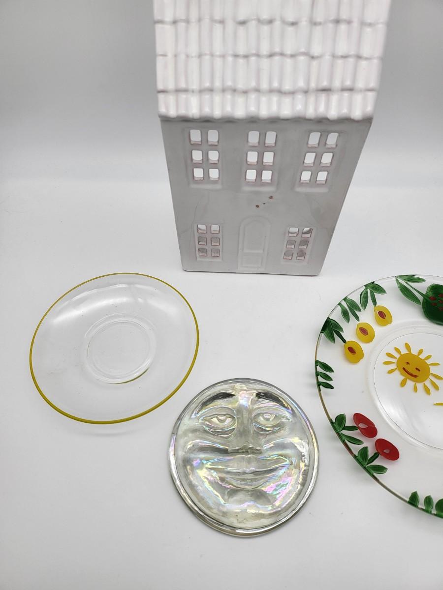 2 vintage child's plates, one hand painted, irridescent art glass paper weight, House candle Decor.