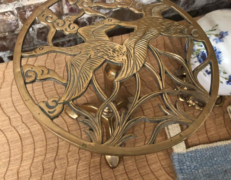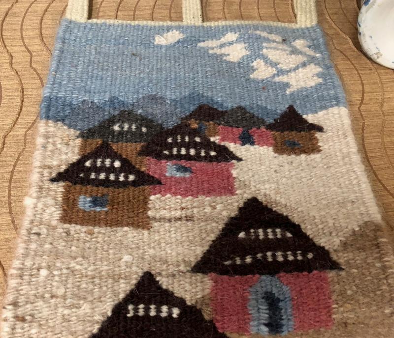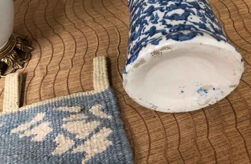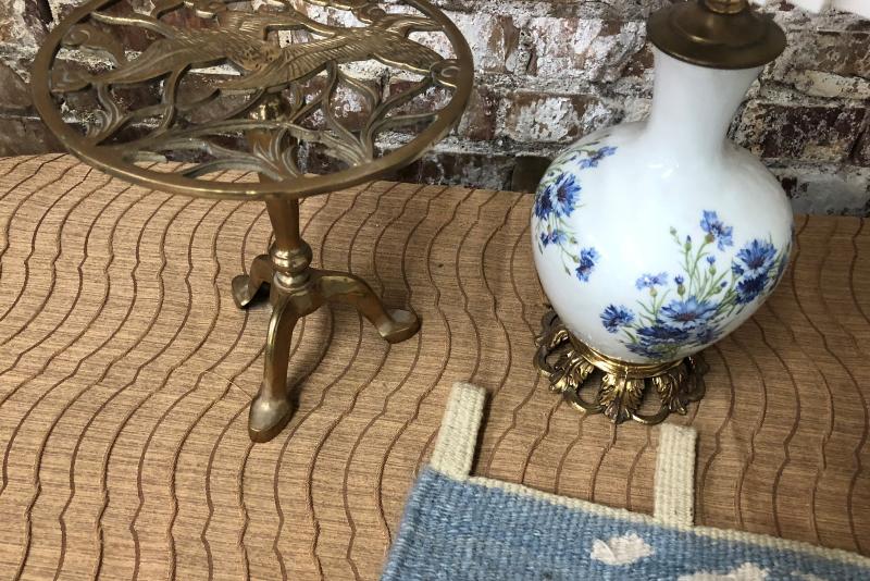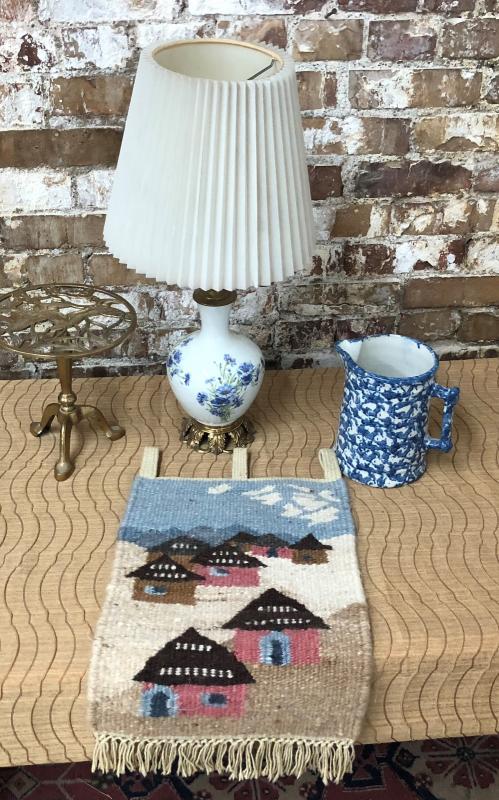 Both useful and decorative in this lot...a charming table lamp..sponge ware pitcher..antique style brass stand...and a woven textile wall hanging..