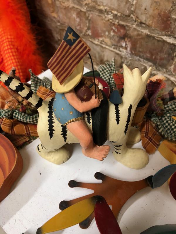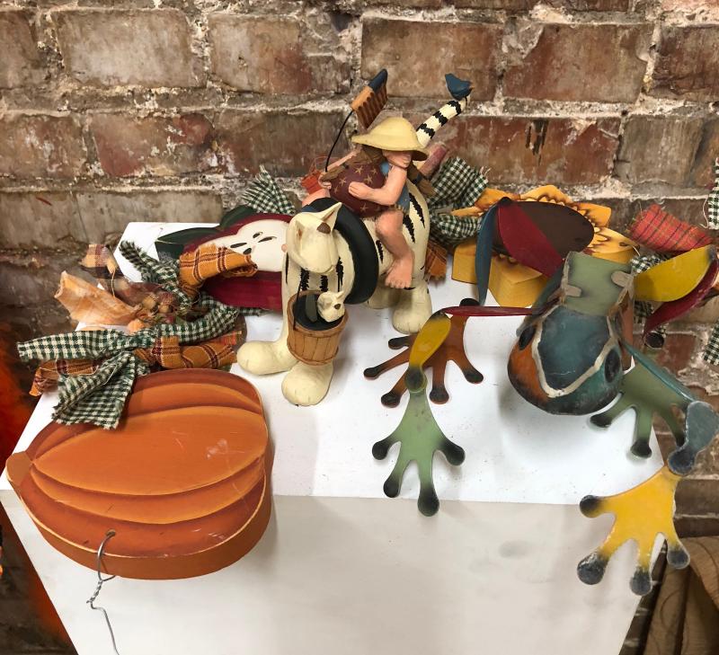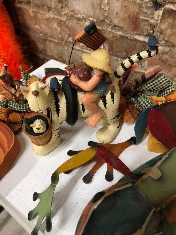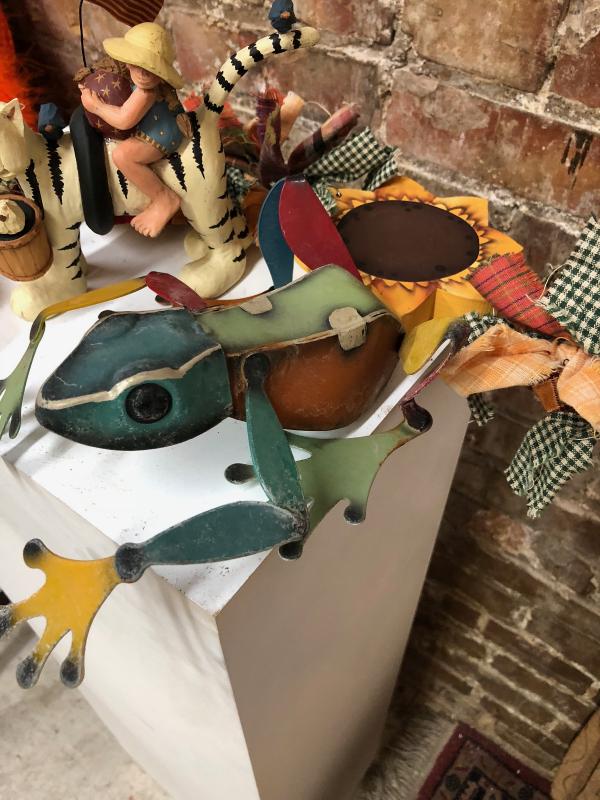 Here is a lot of whimsical household decor figures and a metal art frog...Like new condition...