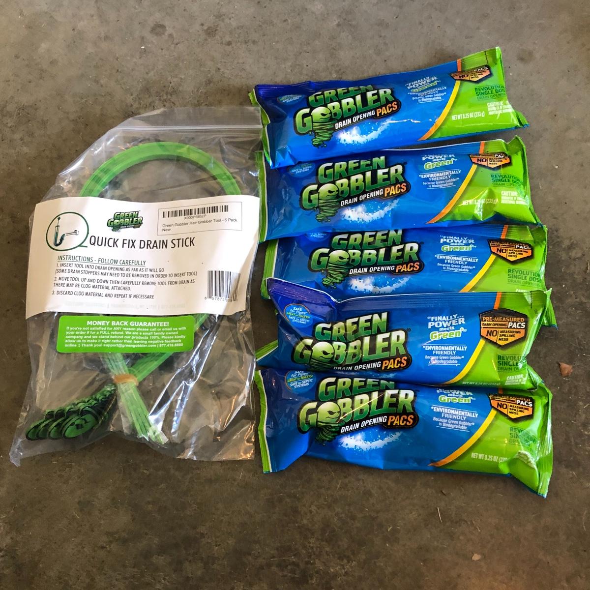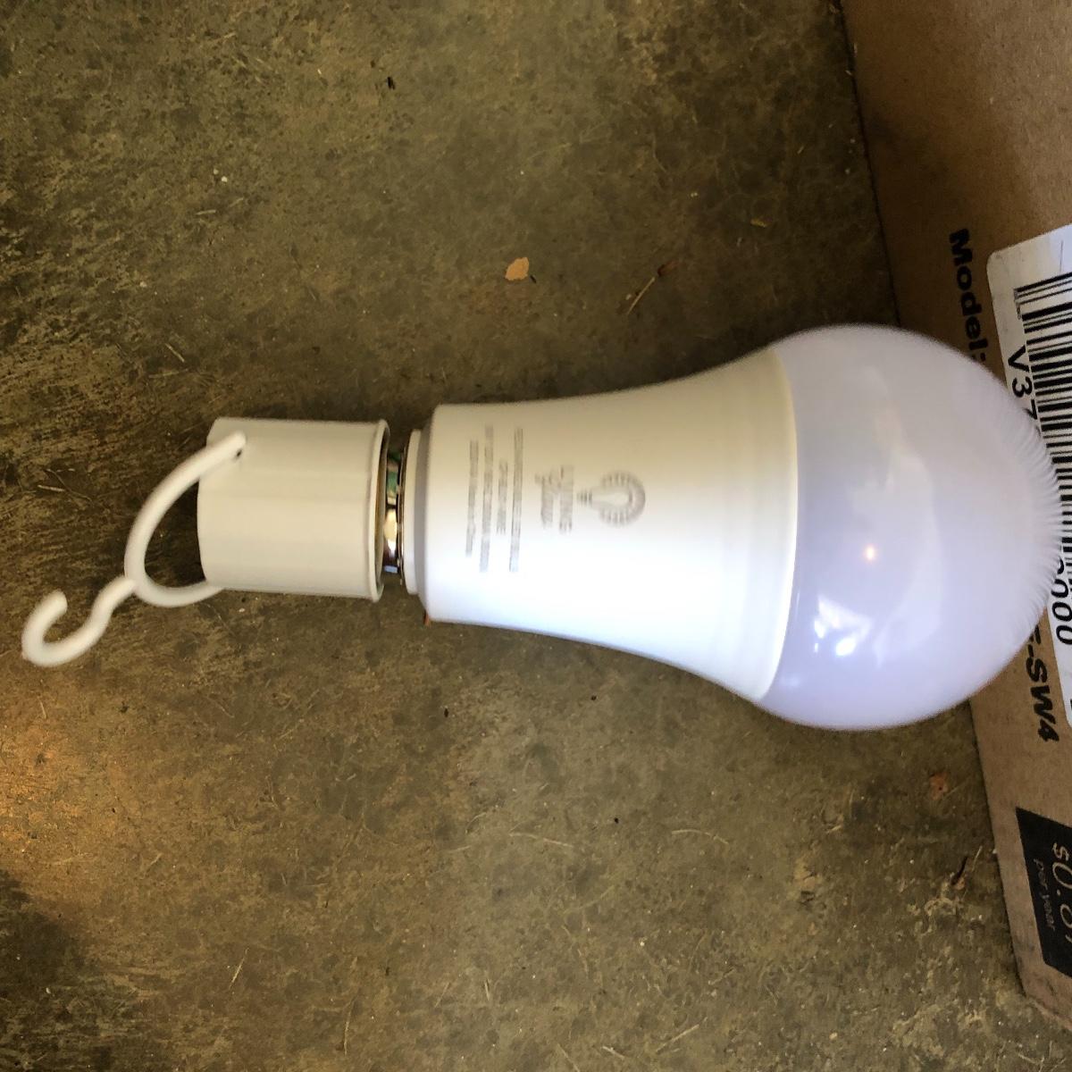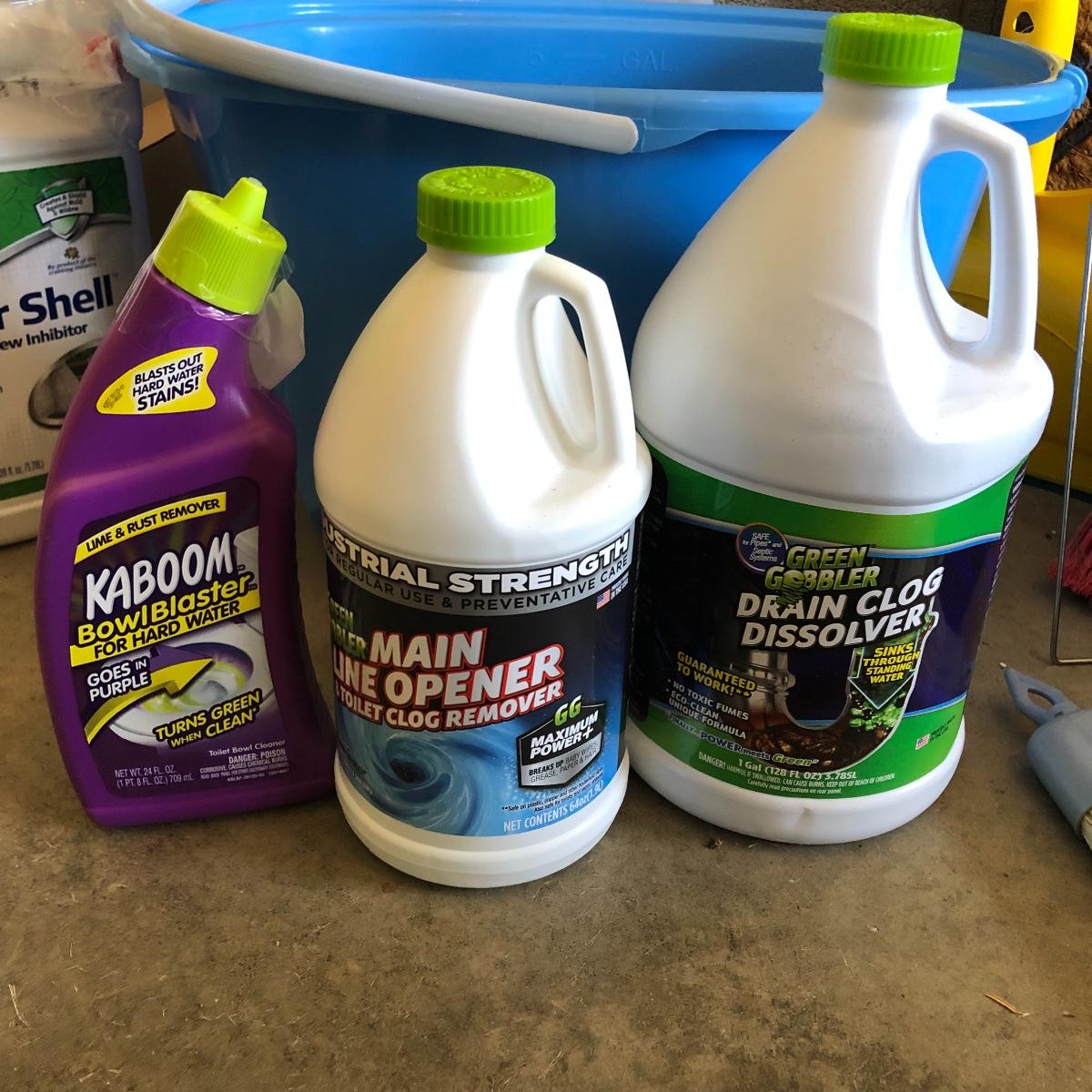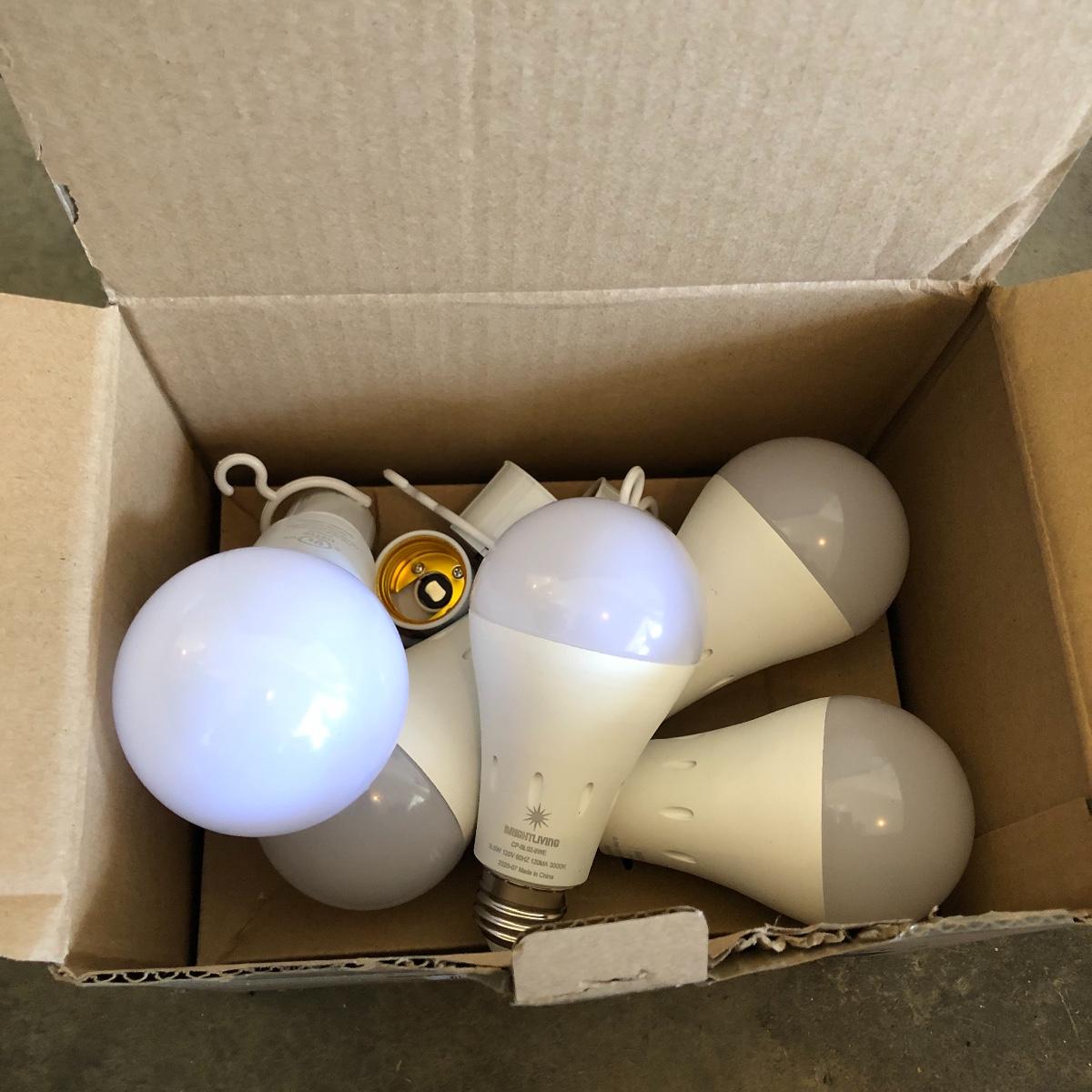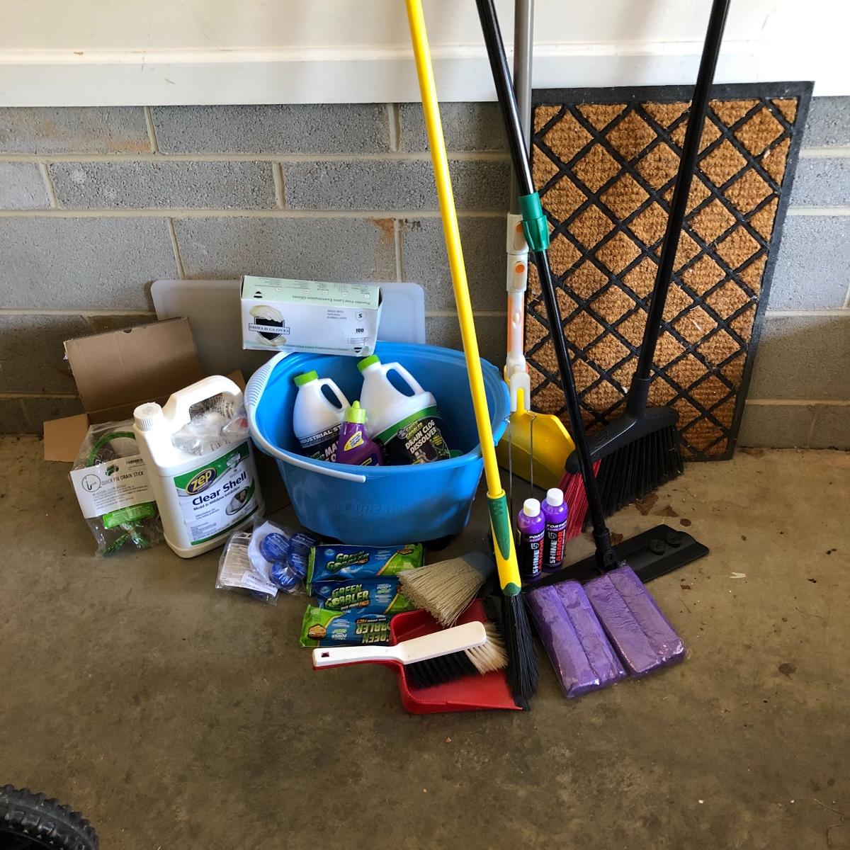 Lot includes two brooms, mop, doormat, five rechargeable light bulbs, pail, drain cleaner, dust pans, and more.