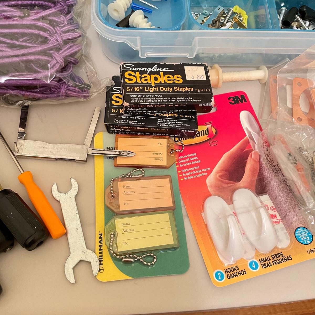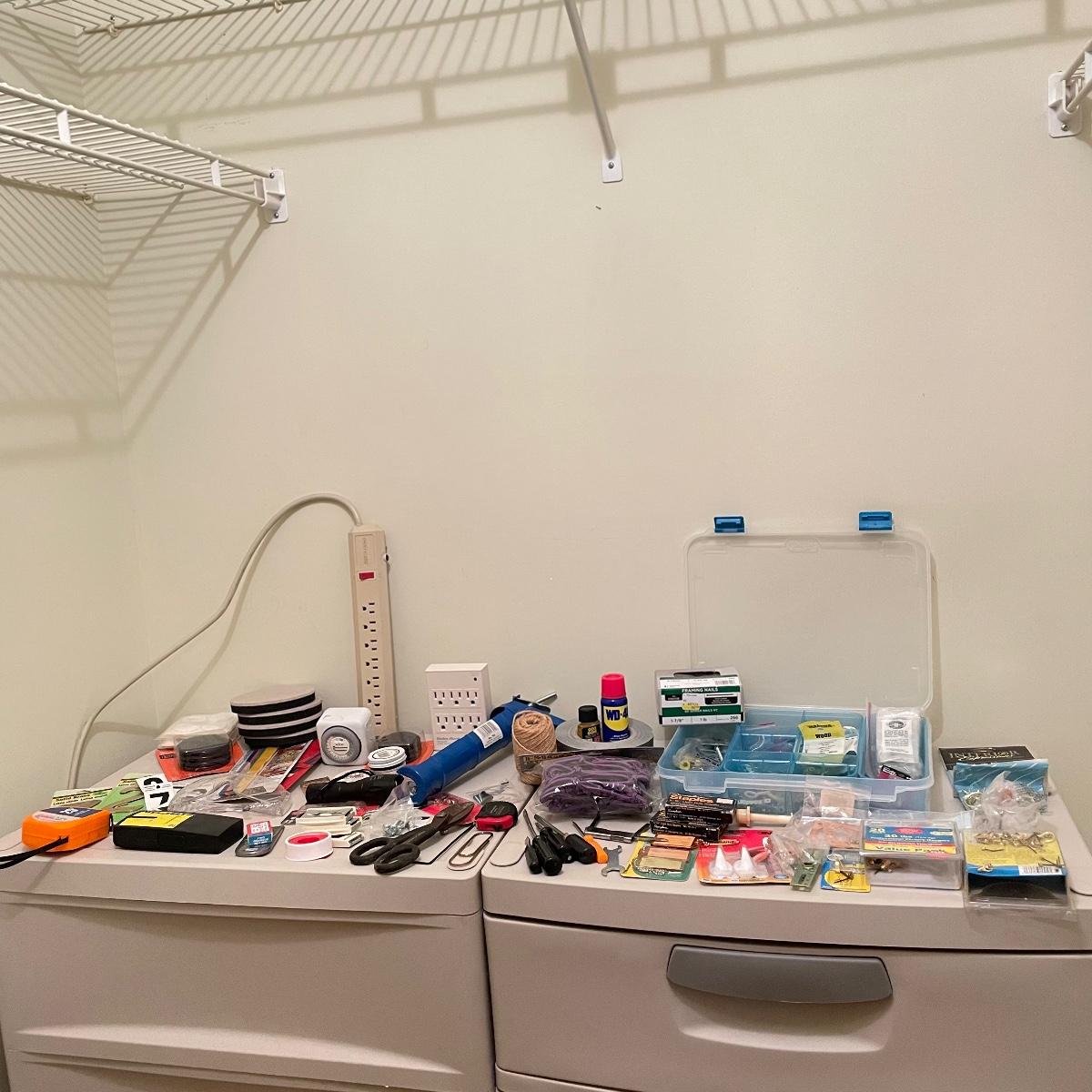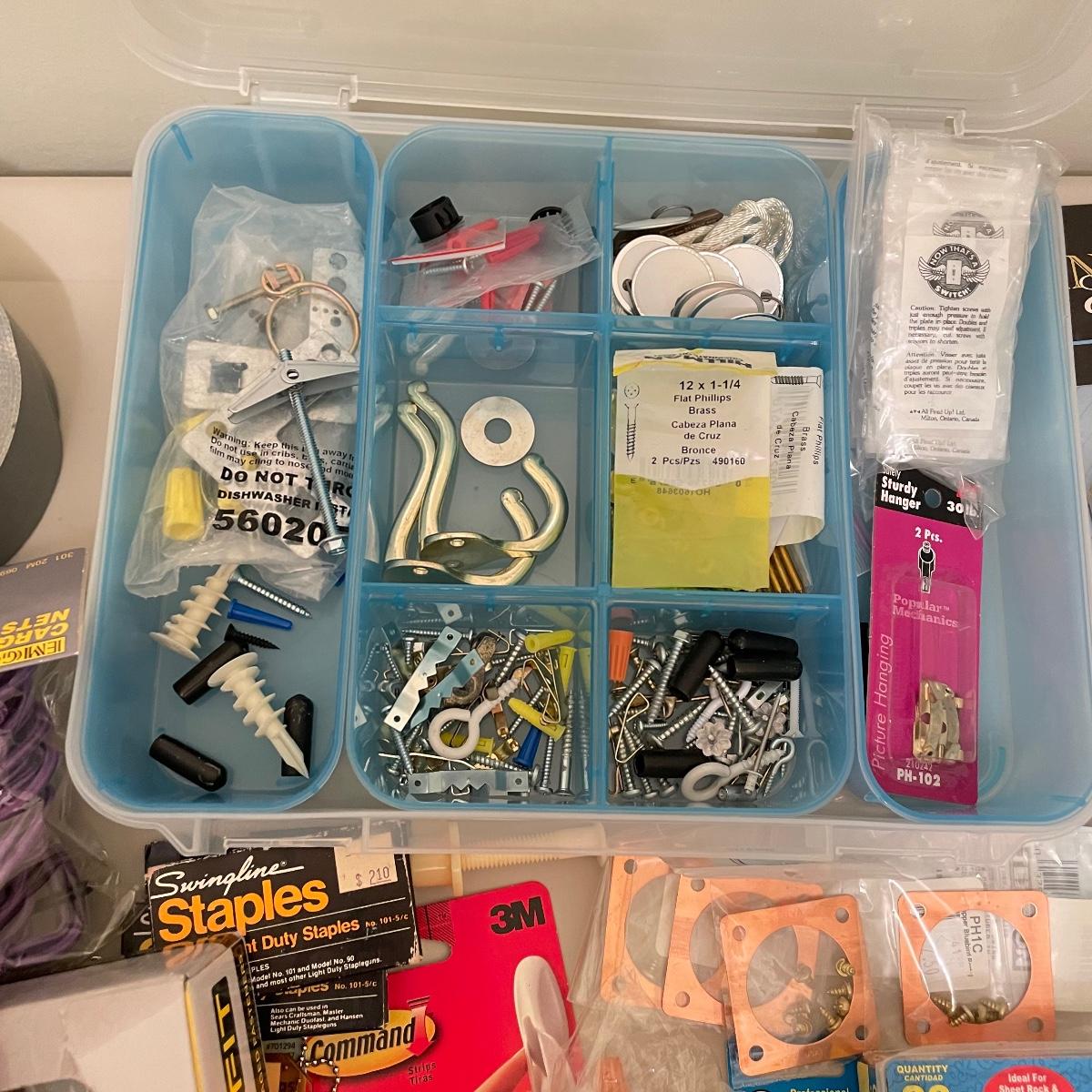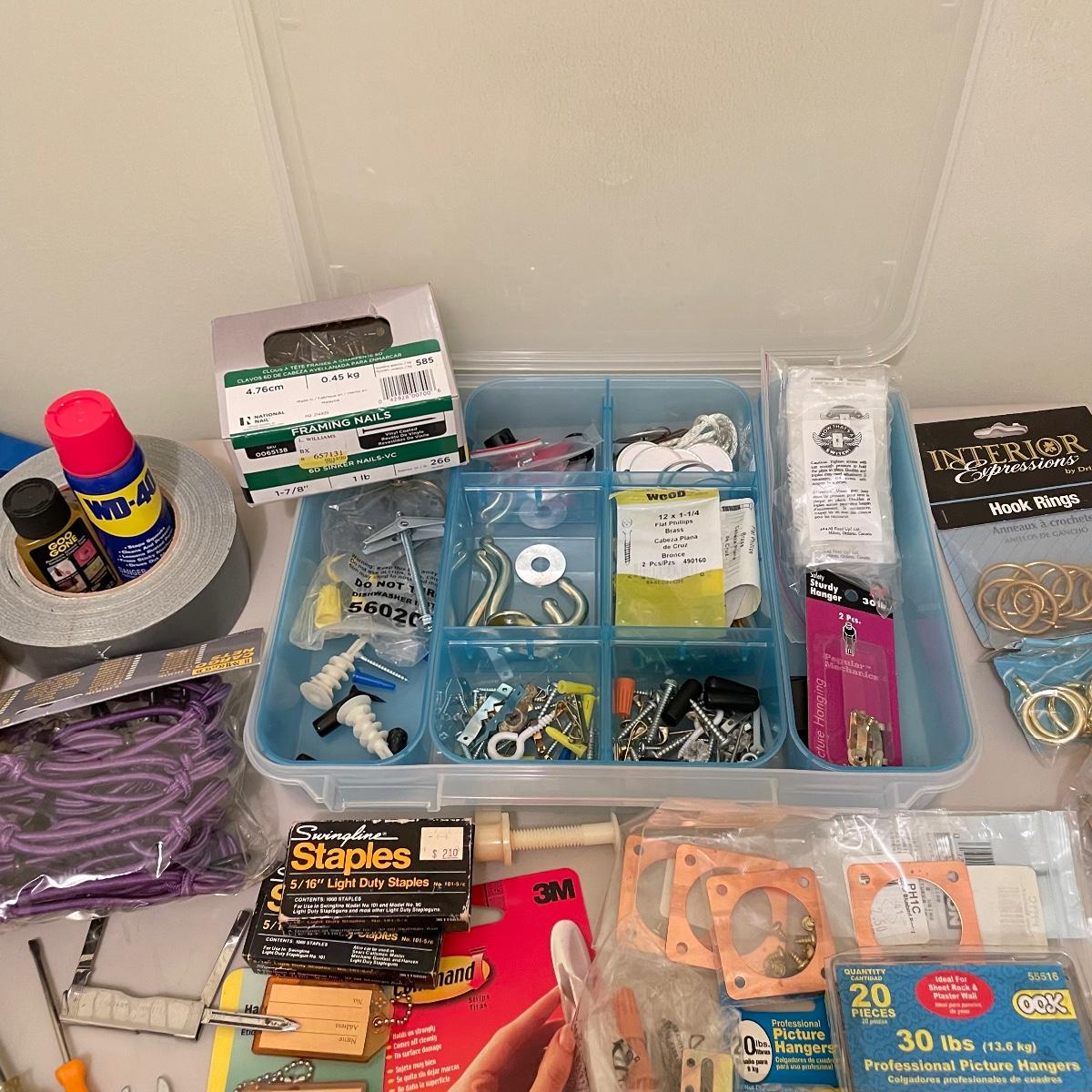 Lot full of household supplies. Five smaller flathead screwdrivers, an unopened box of approximately 266 framing nails, measuring tapes, hanging hardware, hook rings, 15”sq purple cargo net, surge protectors and more. See images. Zircon studsensor 3.0 was not tested and requires a 9V battery, all vintage and liquid products were not tested and cannot be verified to hold the contents on their labels. The two white cabinets are not included. Local pick up only.