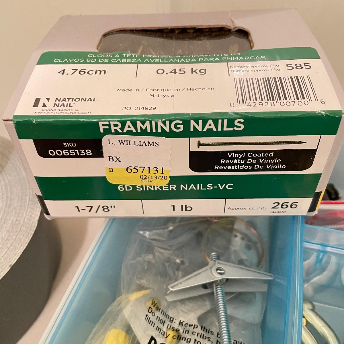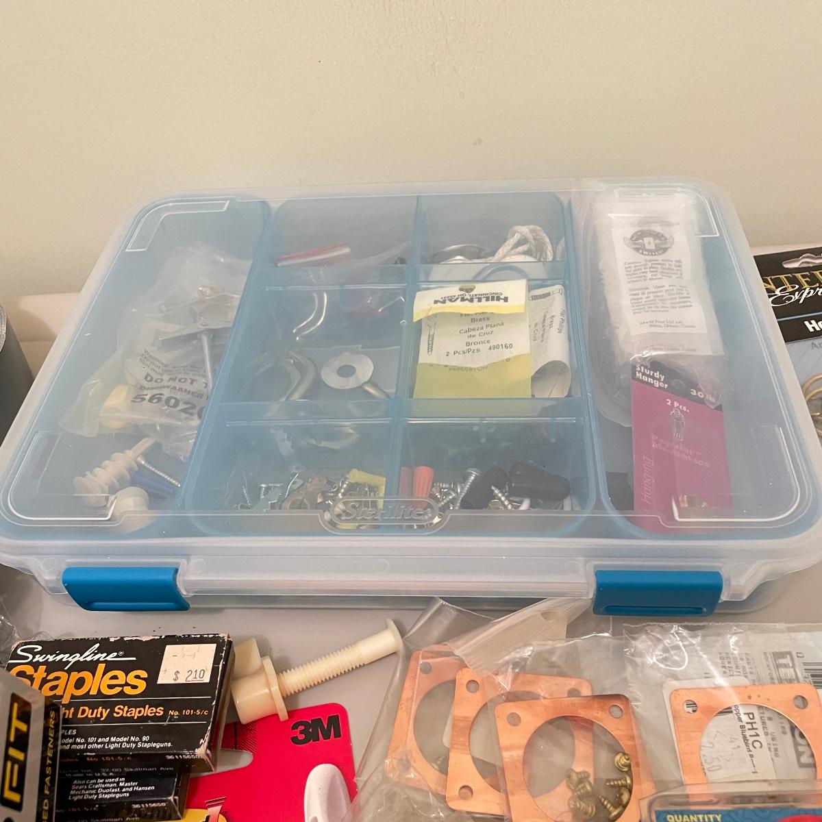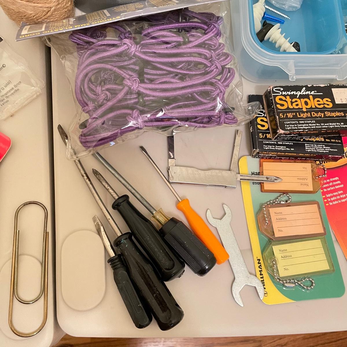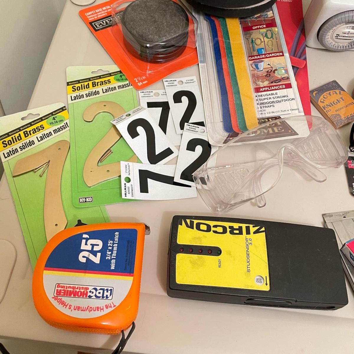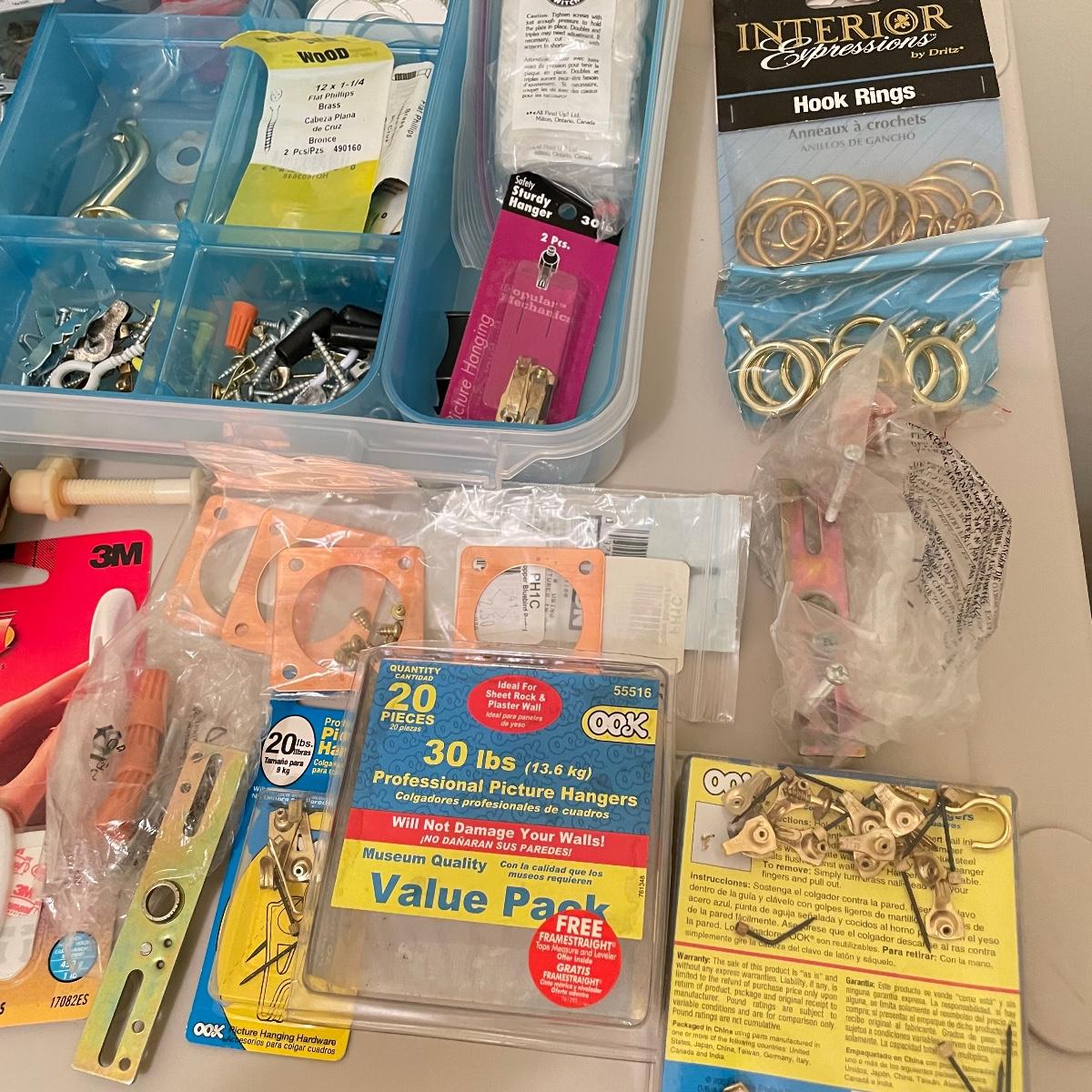 Lot full of household supplies. Five smaller flathead screwdrivers, an unopened box of approximately 266 framing nails, measuring tapes, hanging hardware, hook rings, 15”sq purple cargo net, surge protectors and more. See images. Zircon studsensor 3.0 was not tested and requires a 9V battery, all vintage and liquid products were not tested and cannot be verified to hold the contents on their labels. The two white cabinets are not included. Local pick up only.