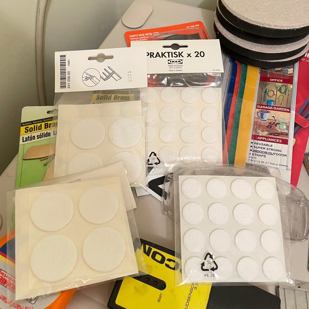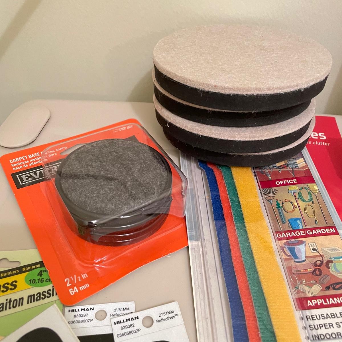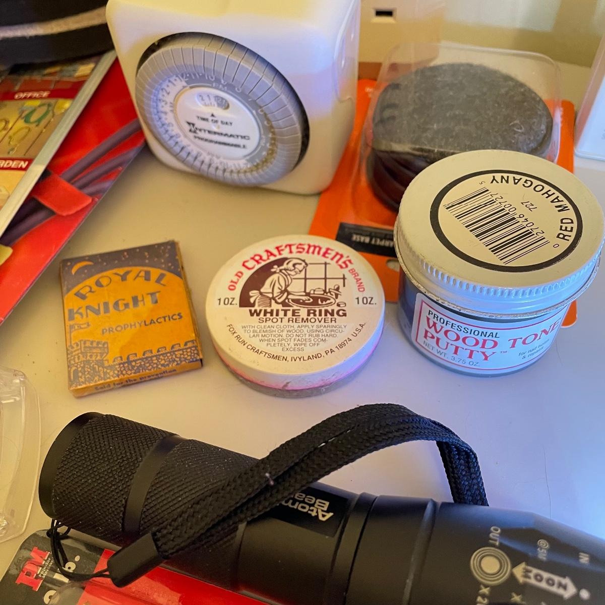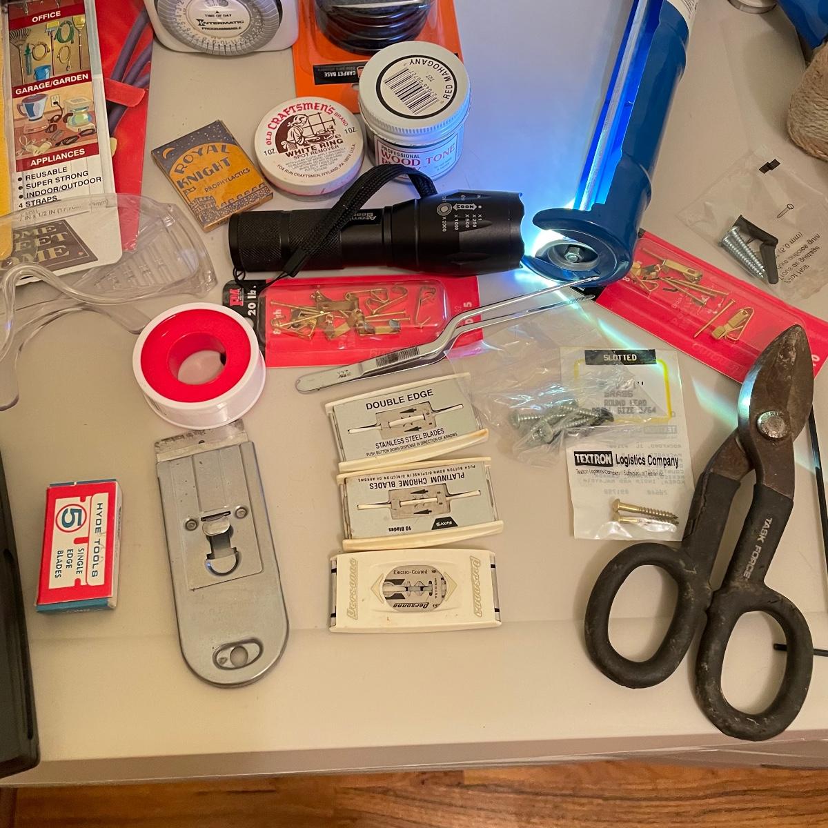 Lot full of household supplies. Five smaller flathead screwdrivers, an unopened box of approximately 266 framing nails, measuring tapes, hanging hardware, hook rings, 15”sq purple cargo net, surge protectors and more. See images. Zircon studsensor 3.0 was not tested and requires a 9V battery, all vintage and liquid products were not tested and cannot be verified to hold the contents on their labels. The two white cabinets are not included. Local pick up only.