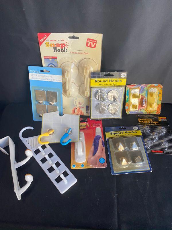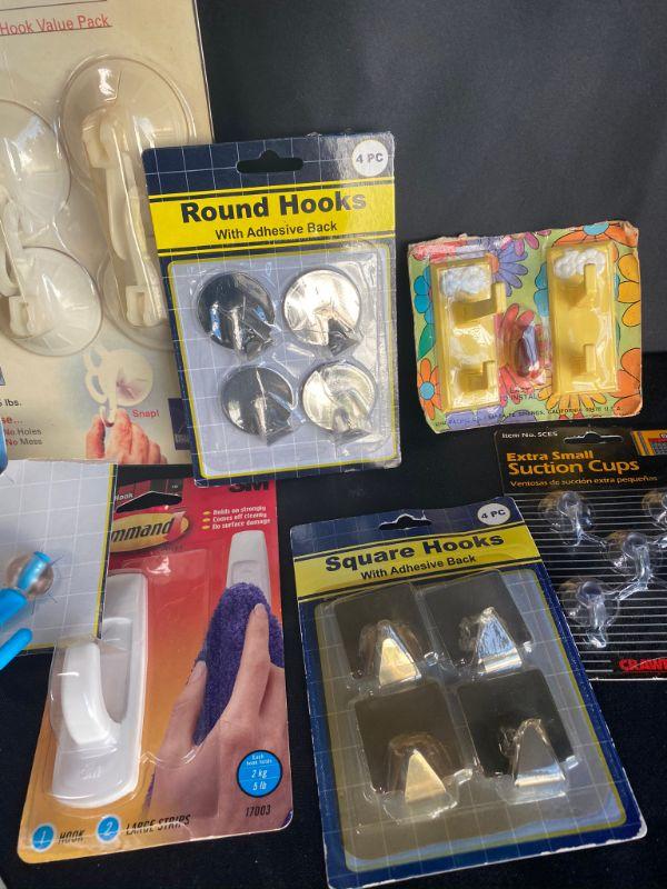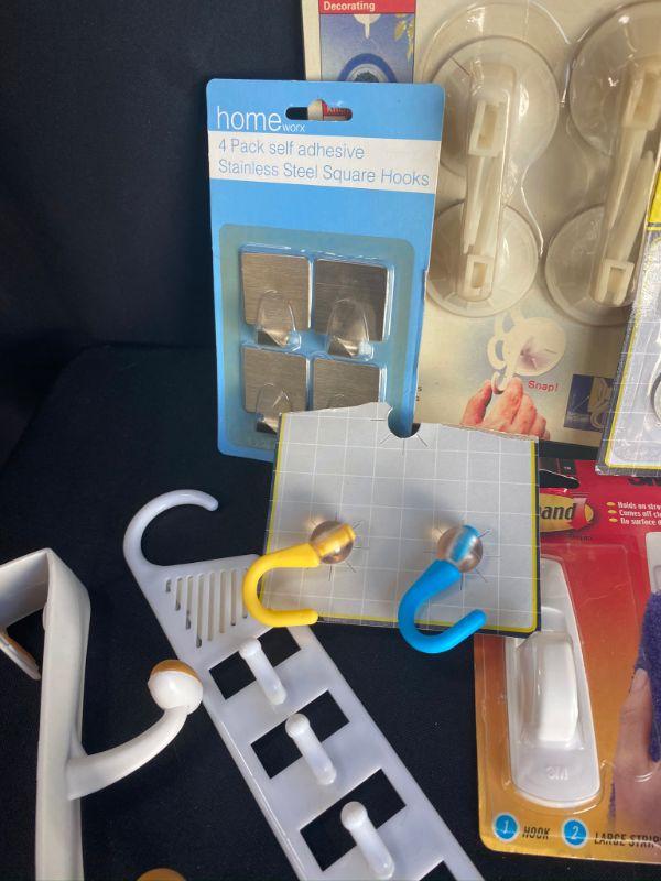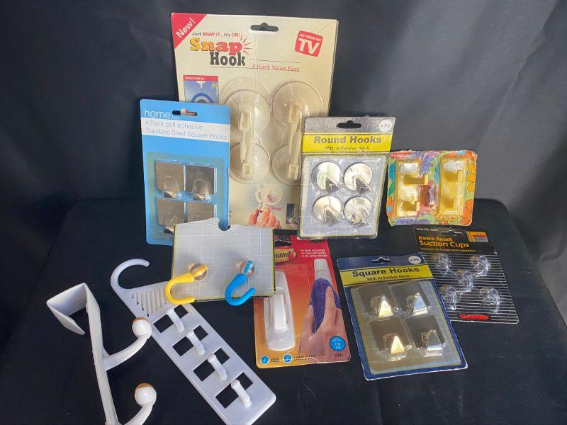 Variety of hooks. Suction, stick on, over the door, and closet rod hanger.