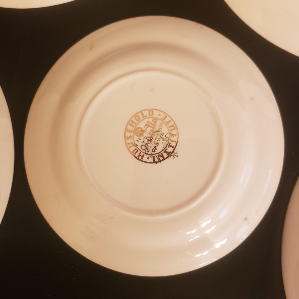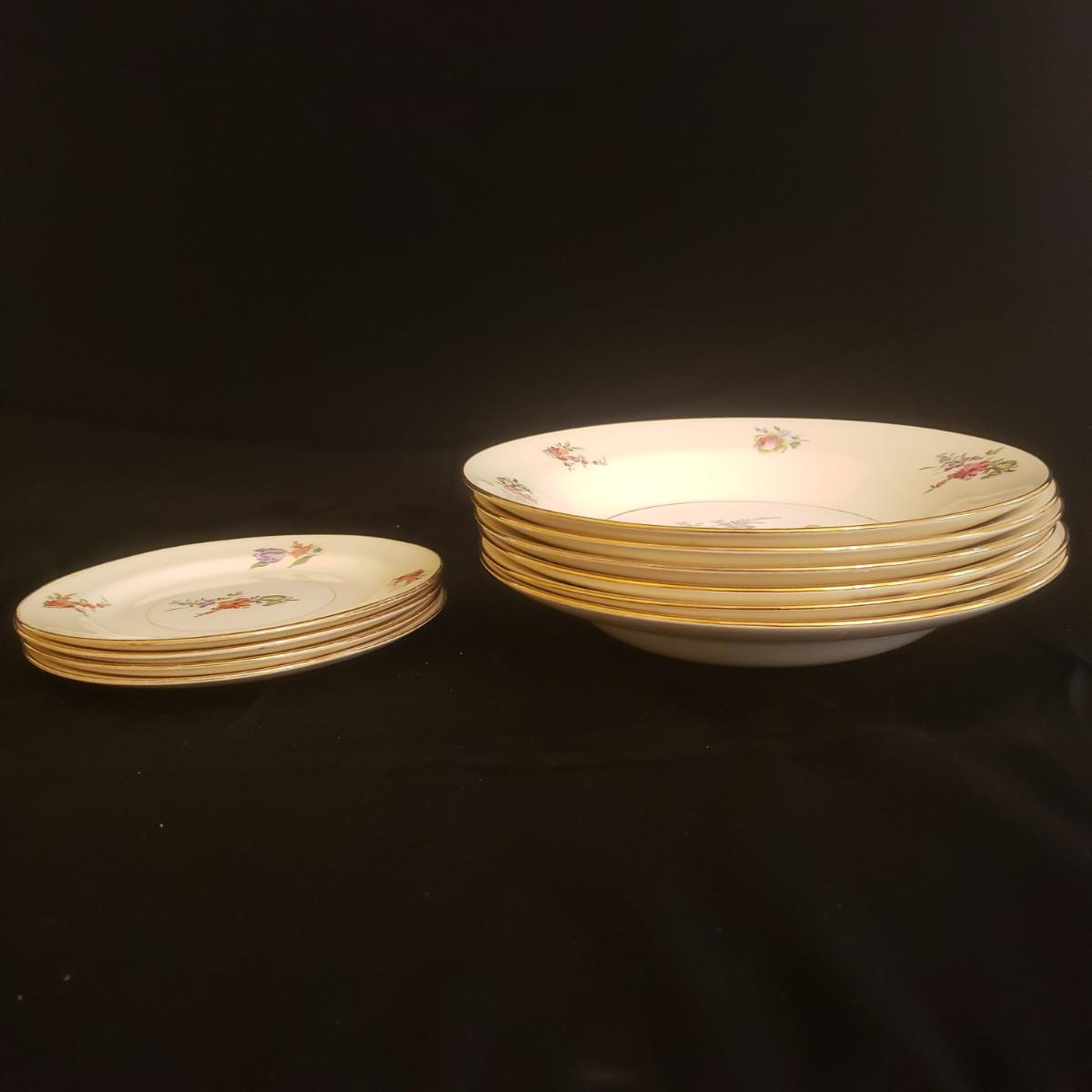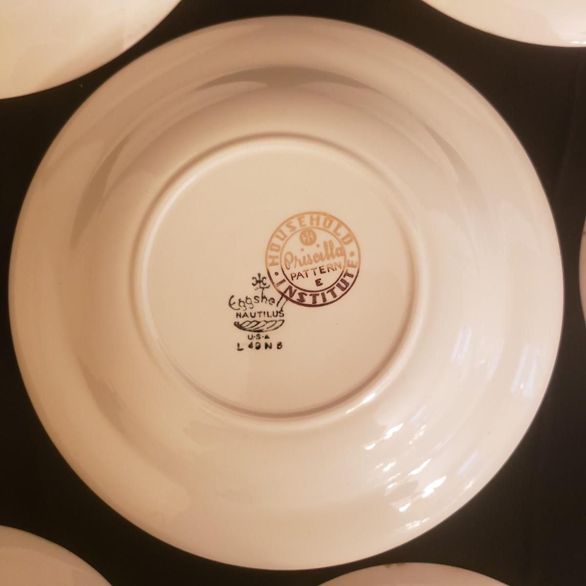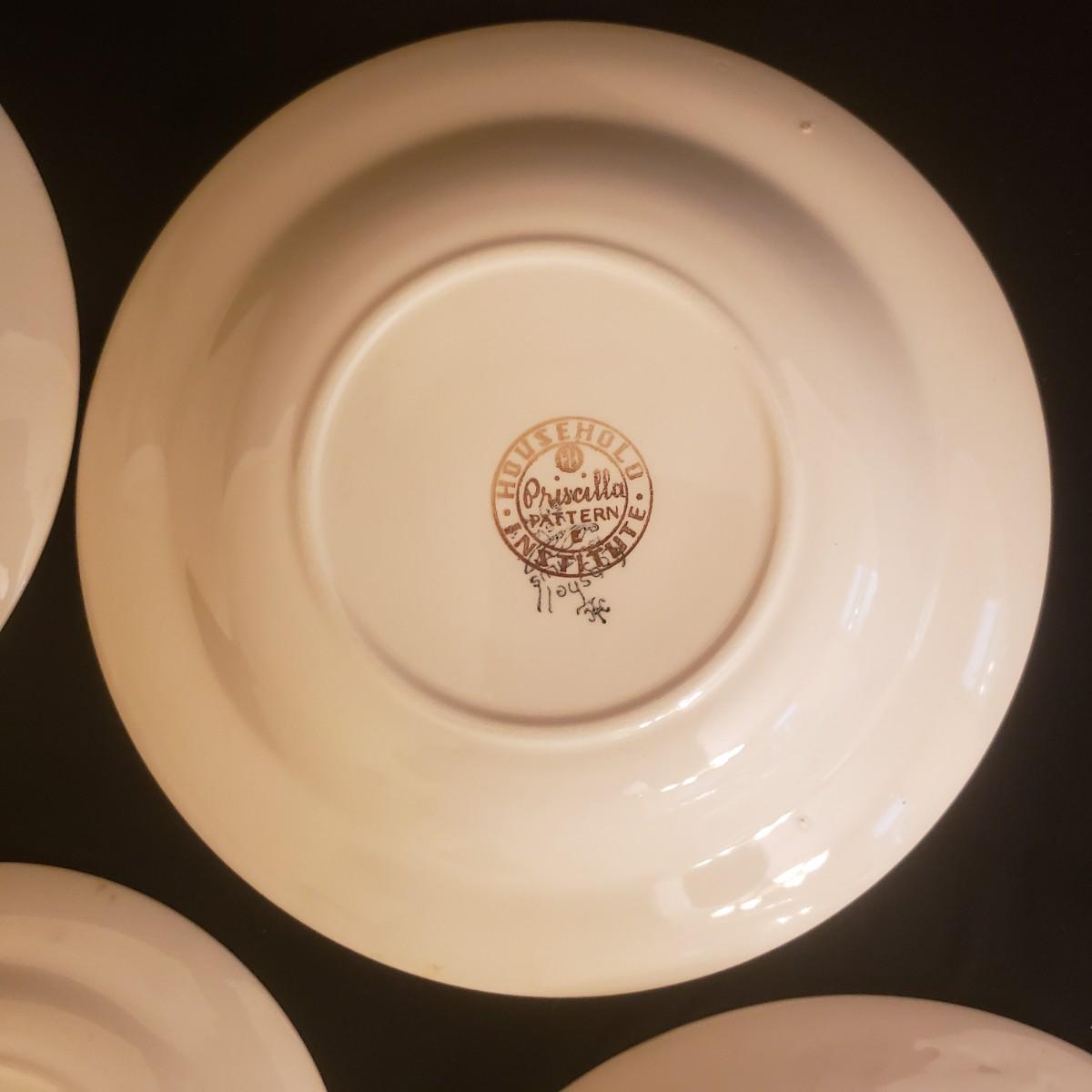 This lot features Household Institute Priscilla pattern China bowls and plates. There are six 8.5" bowls and four 6.5" plates. They have a cream base, with a floral pattern and gold rims. Some of the plates have wear on the gold rims and one plate has a small chip, see pictures.