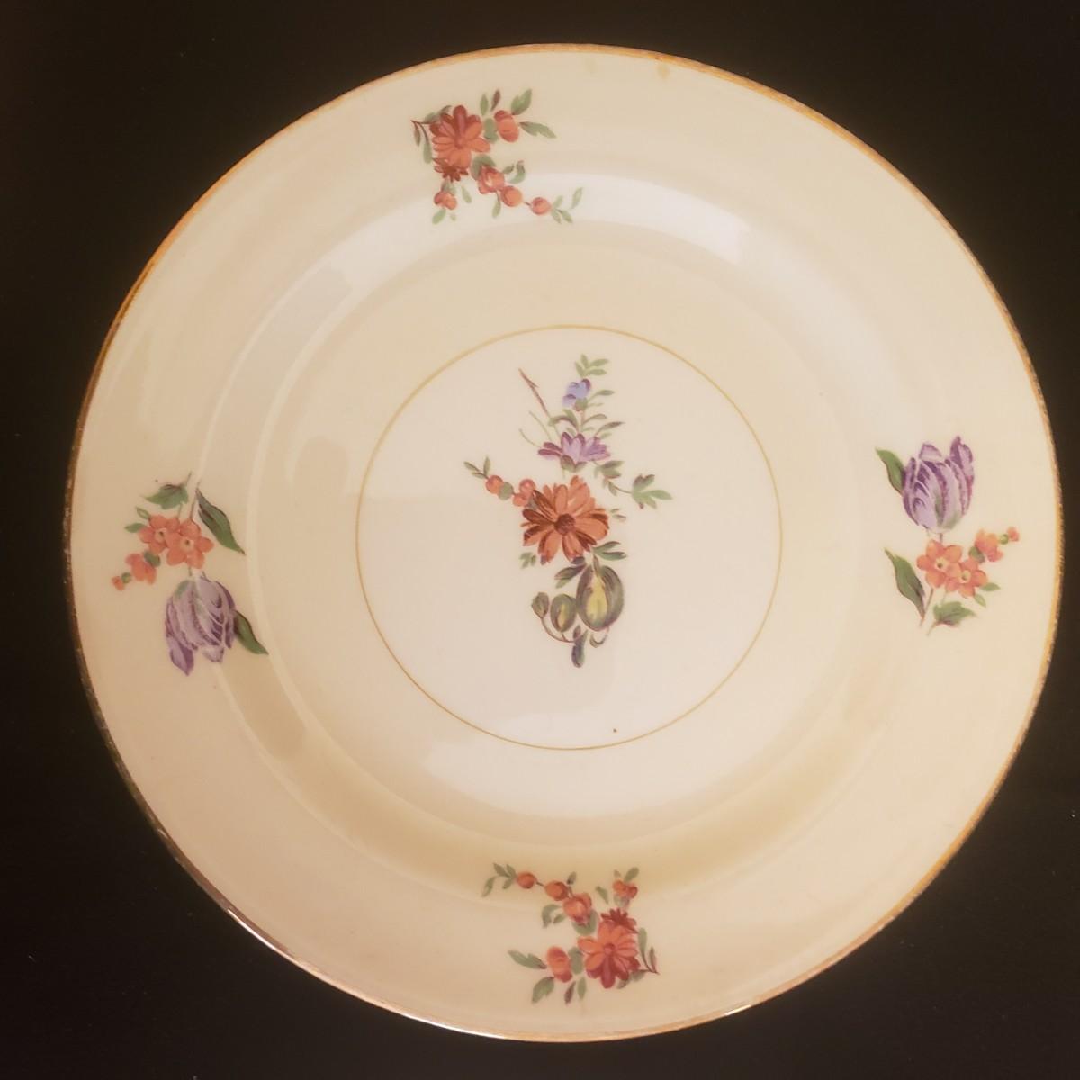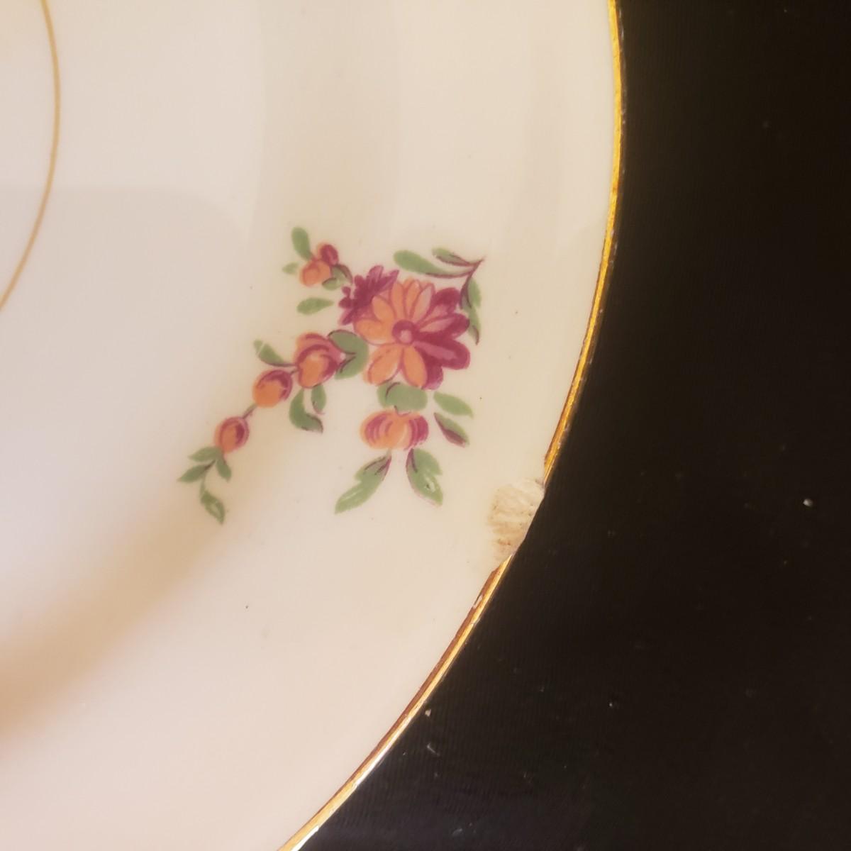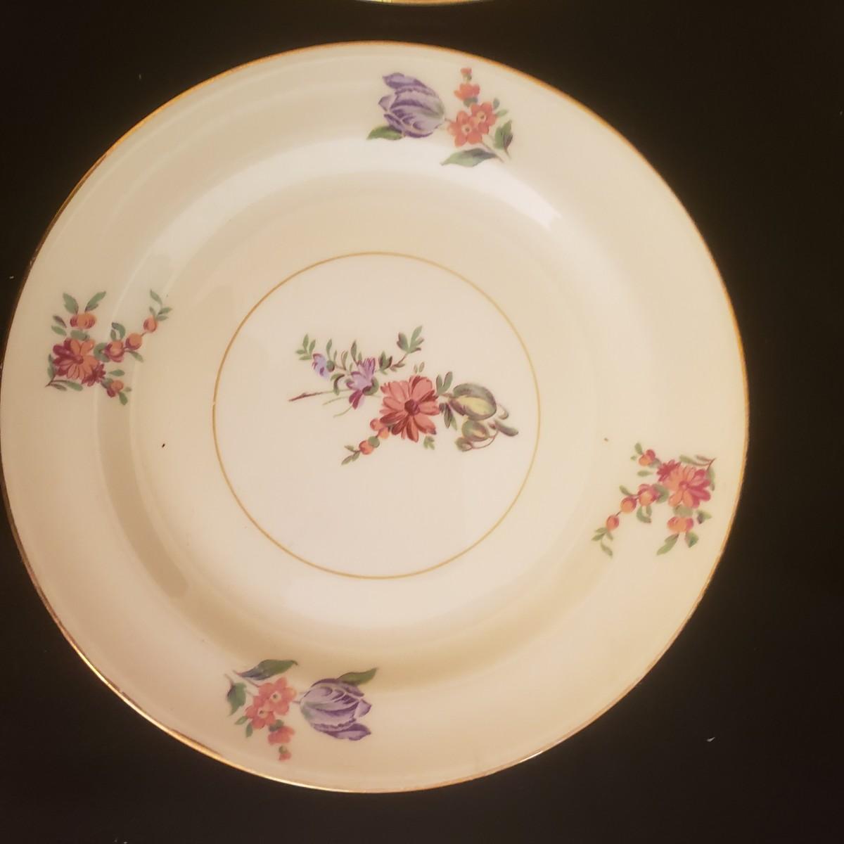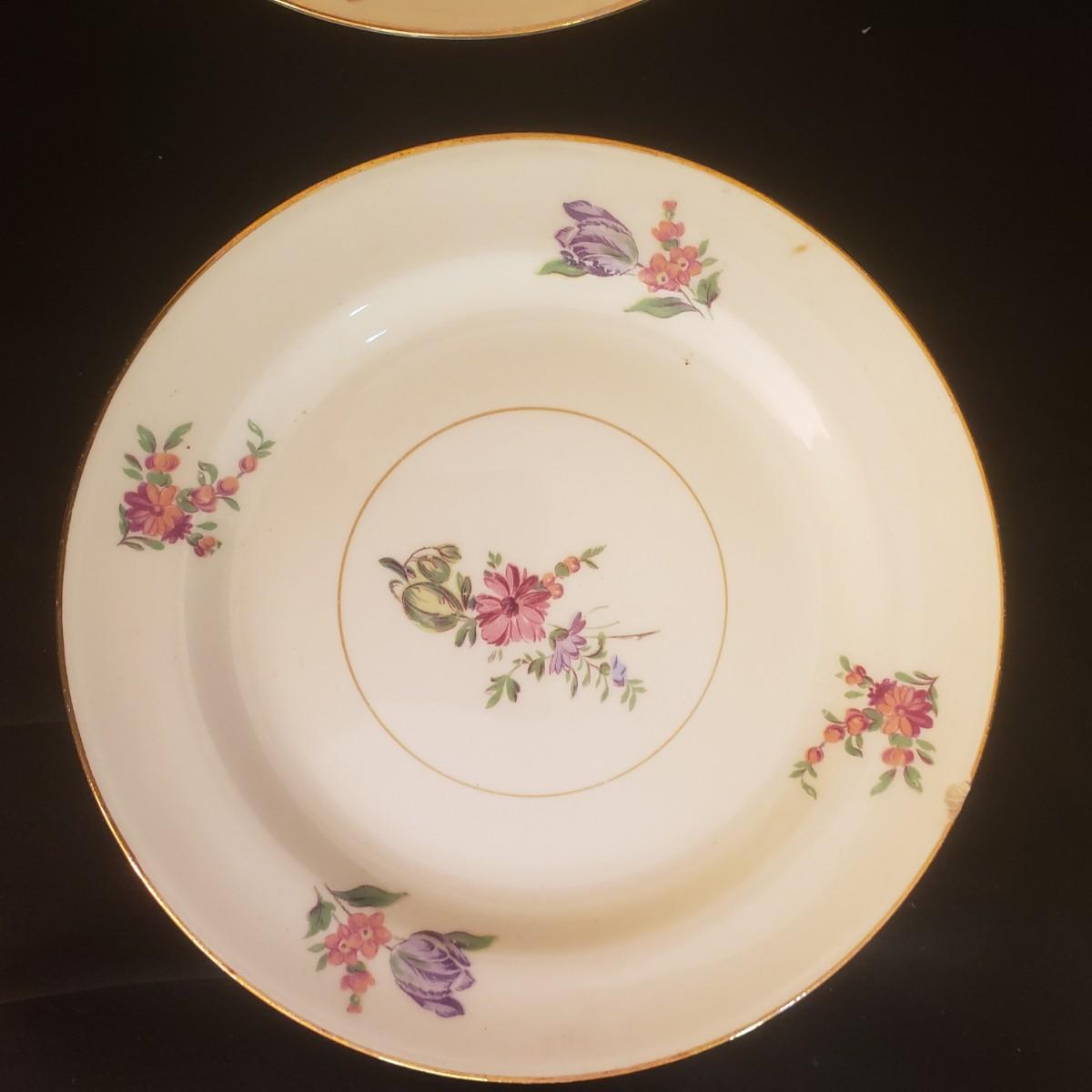 This lot features Household Institute Priscilla pattern China bowls and plates. There are six 8.5" bowls and four 6.5" plates. They have a cream base, with a floral pattern and gold rims. Some of the plates have wear on the gold rims and one plate has a small chip, see pictures.
