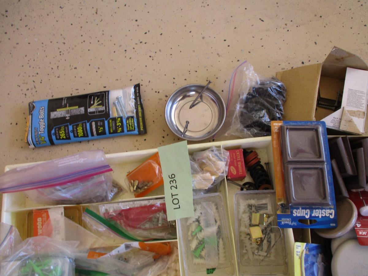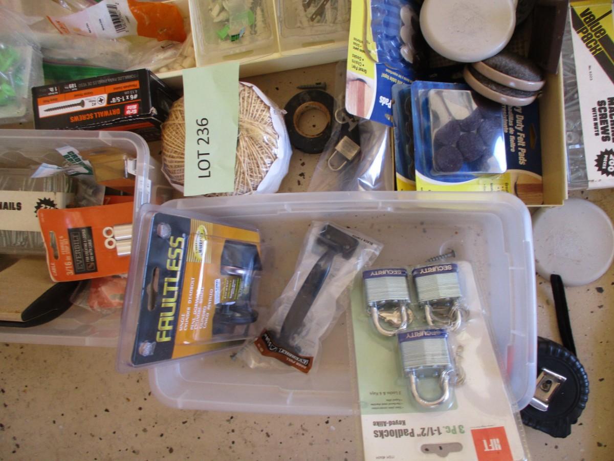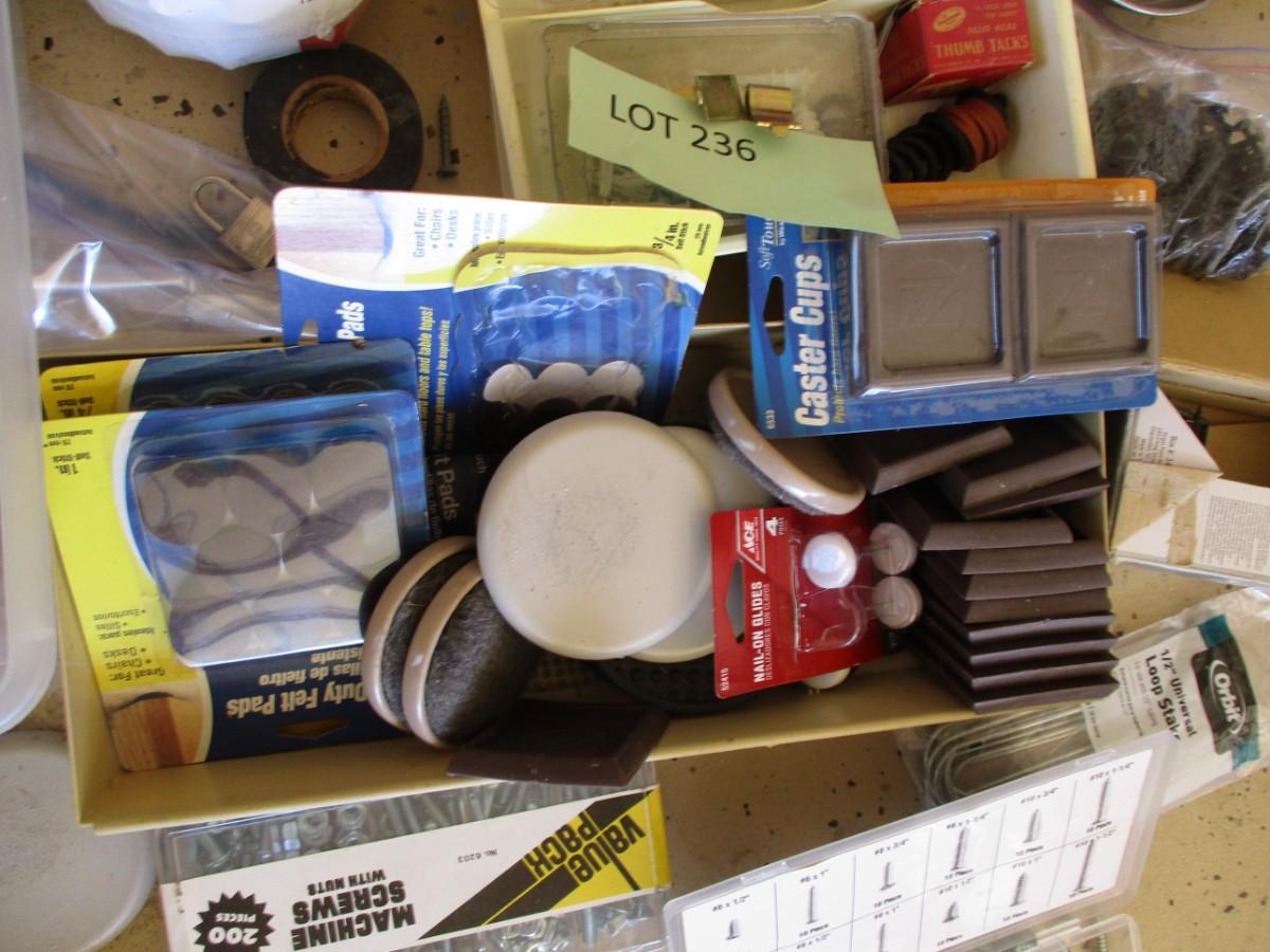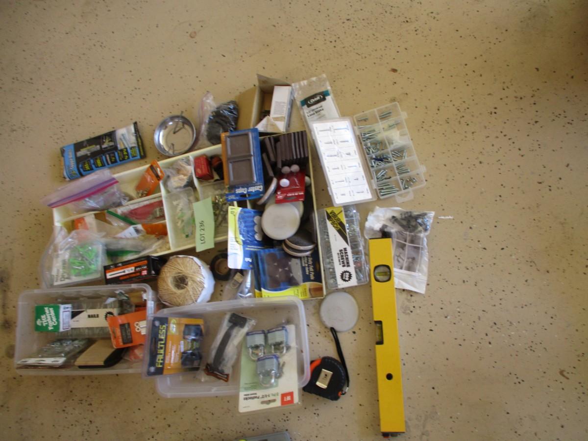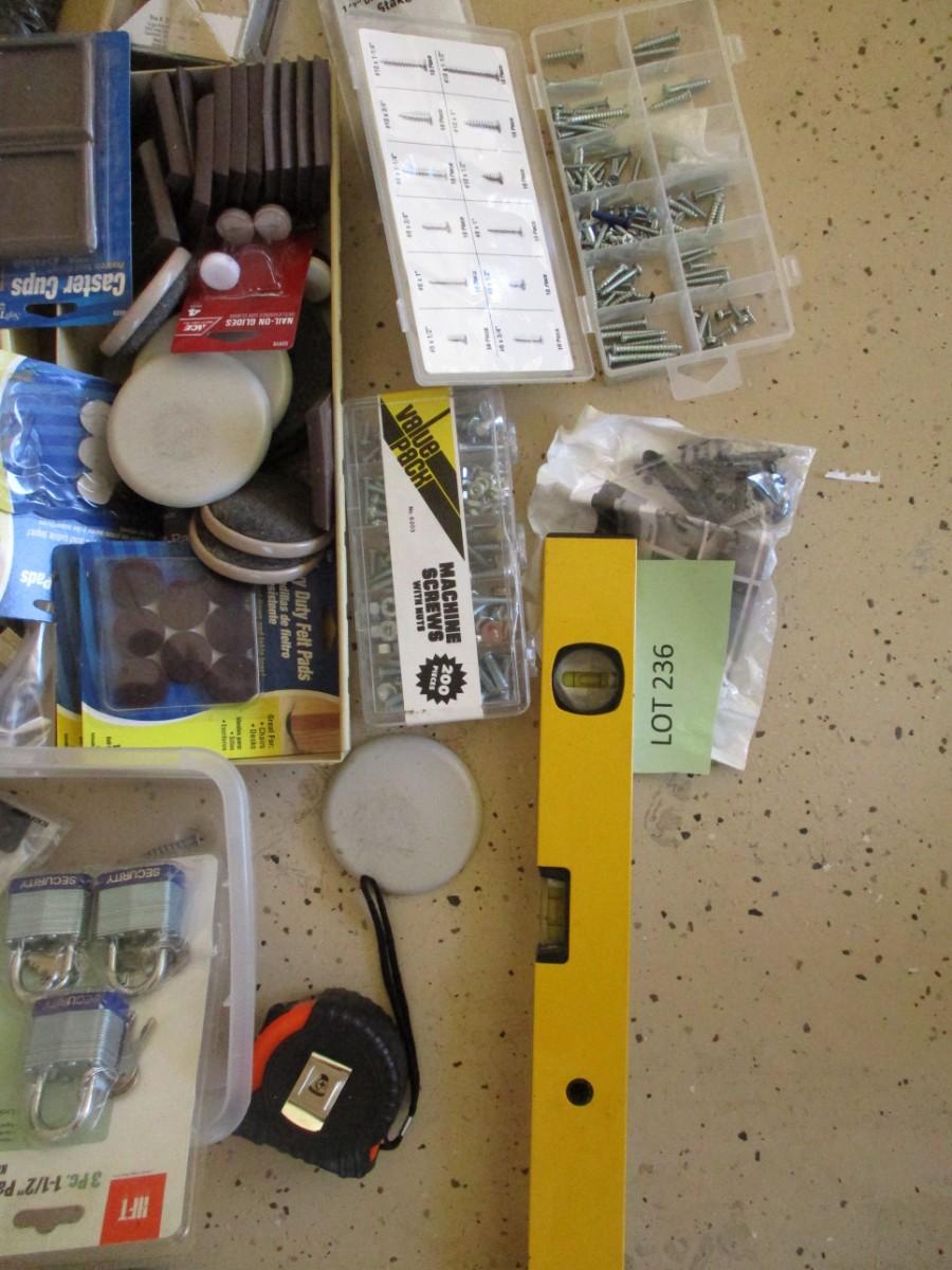 Miscellaneous-- furniture sliders, leveler, screws, measuring tape, nails