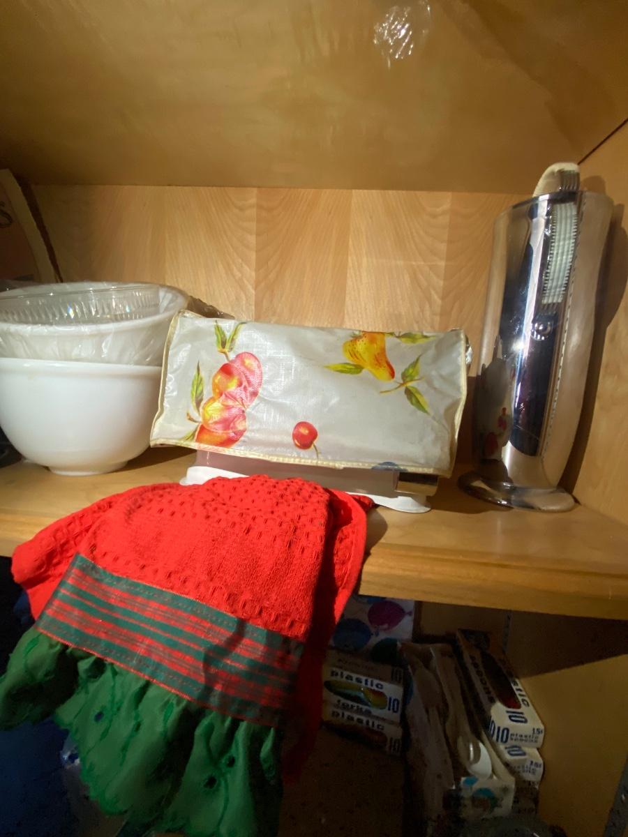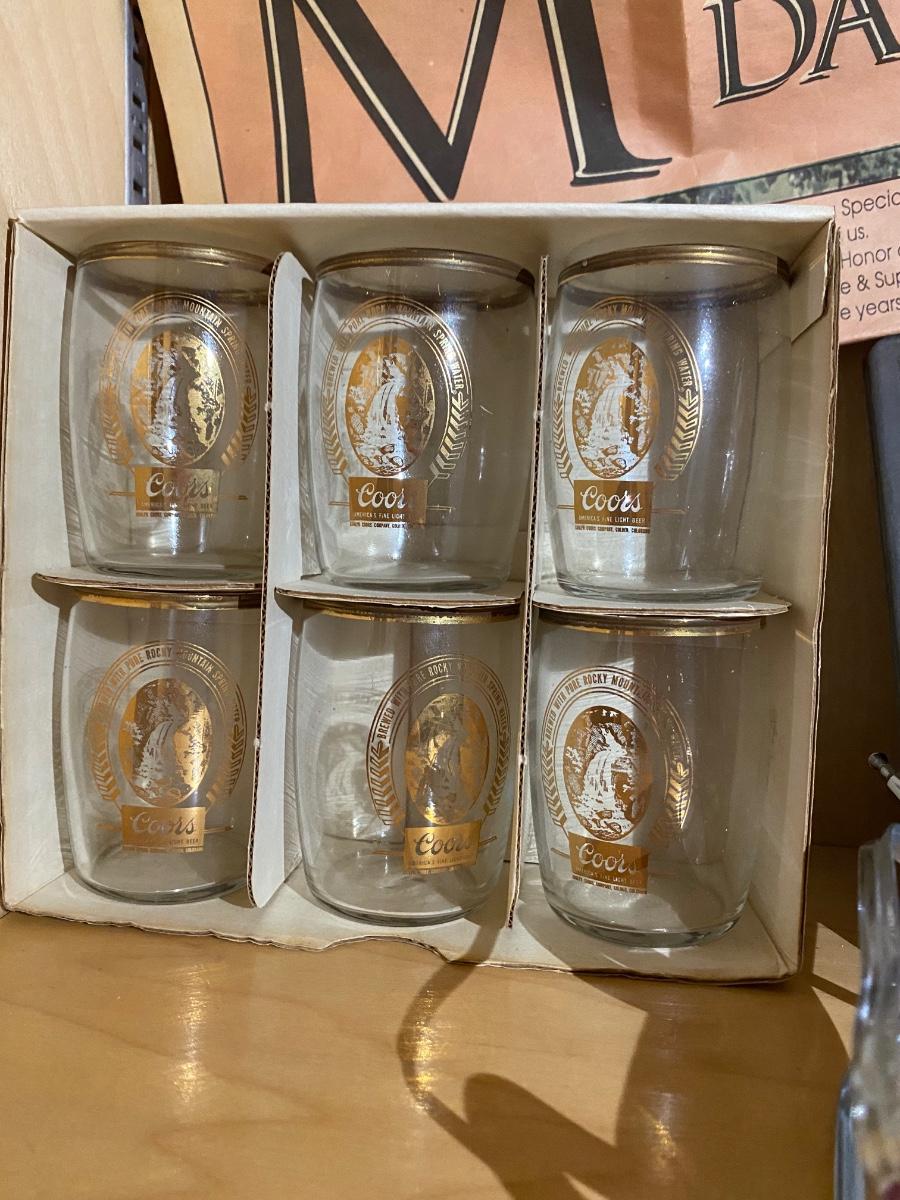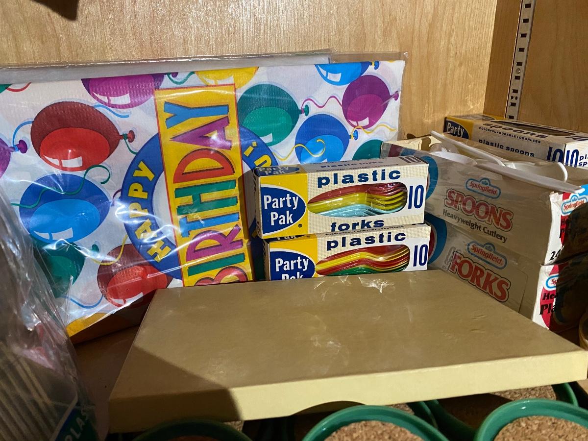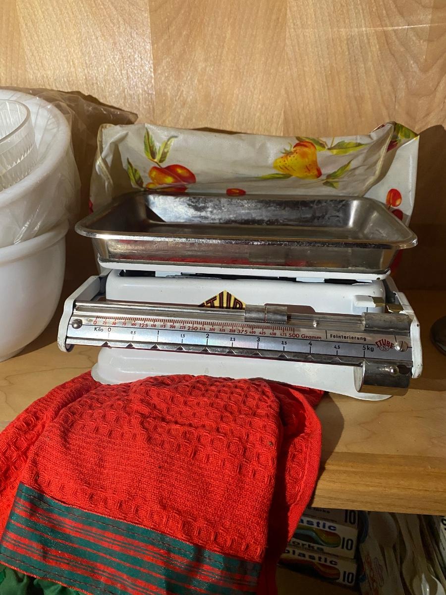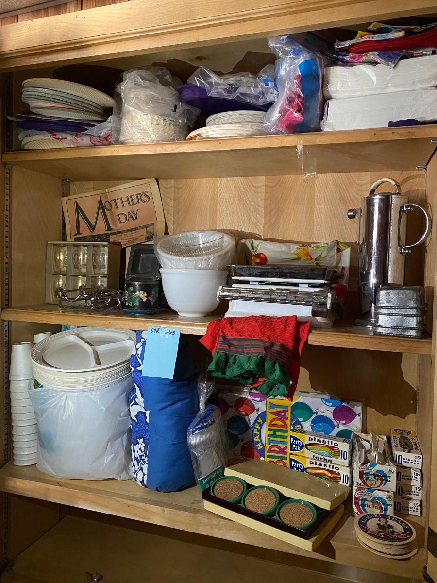 Vintage stube scale, Manning Bowman cocktail shaker, paper plates, foam cups, plastic forks, set of Coors beer cups and more.