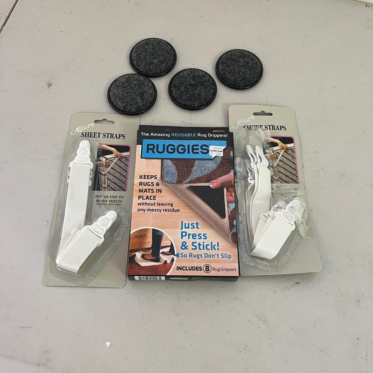 Lot includes rug pads, smoke detectors, furniture slides, lightbulb remover, wooden shims, razor knives, hooks, bed risers, grabbers and more. Please see photos for inventory.