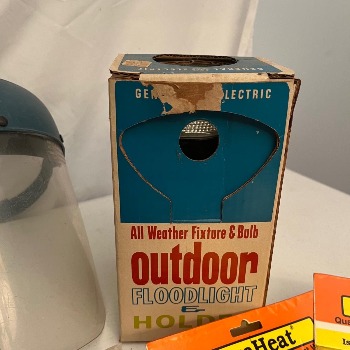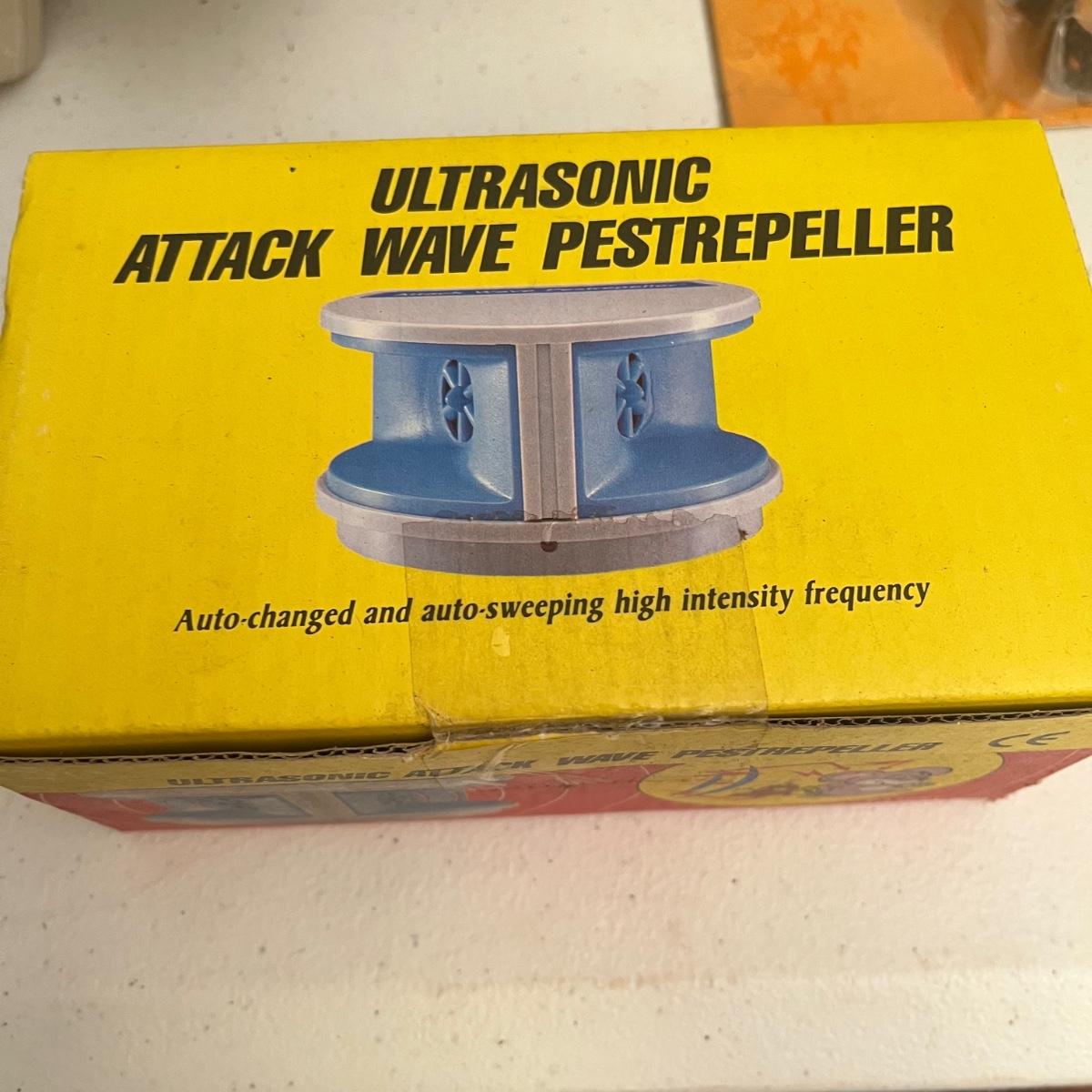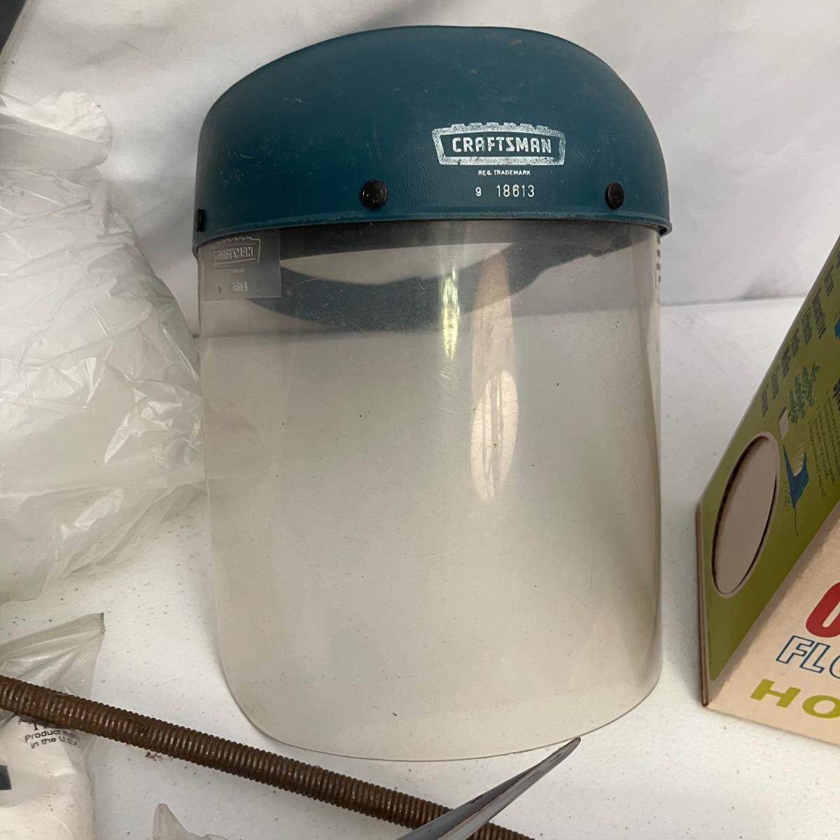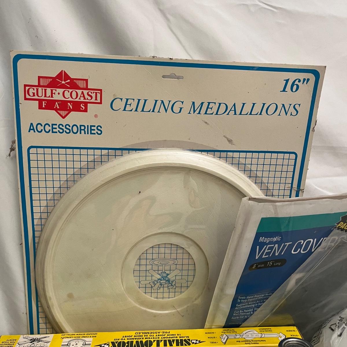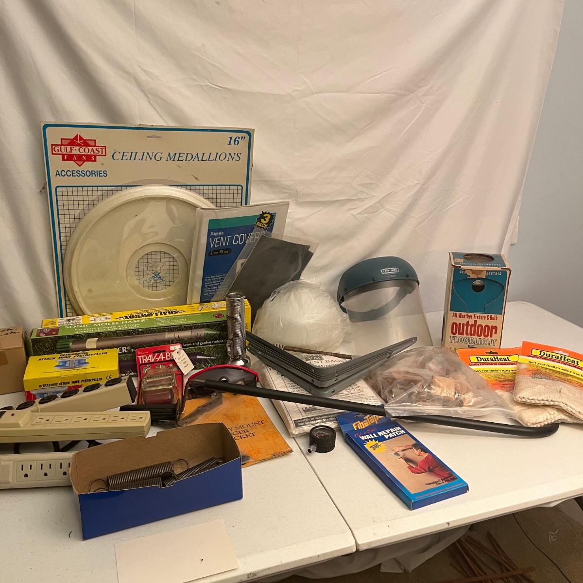 Lot includes ceiling medallion, ultrasonic pest repeller, shelf mounts, Craftsman shield, sonic mole chasers, power strips, wooden drawer knobs, flashlight and more.