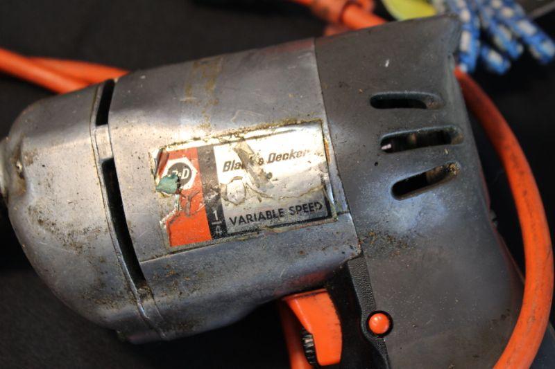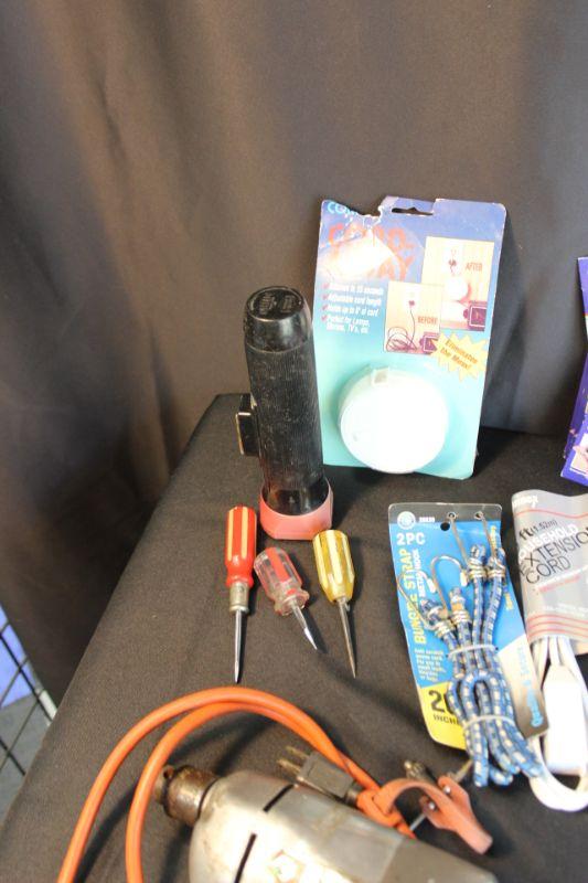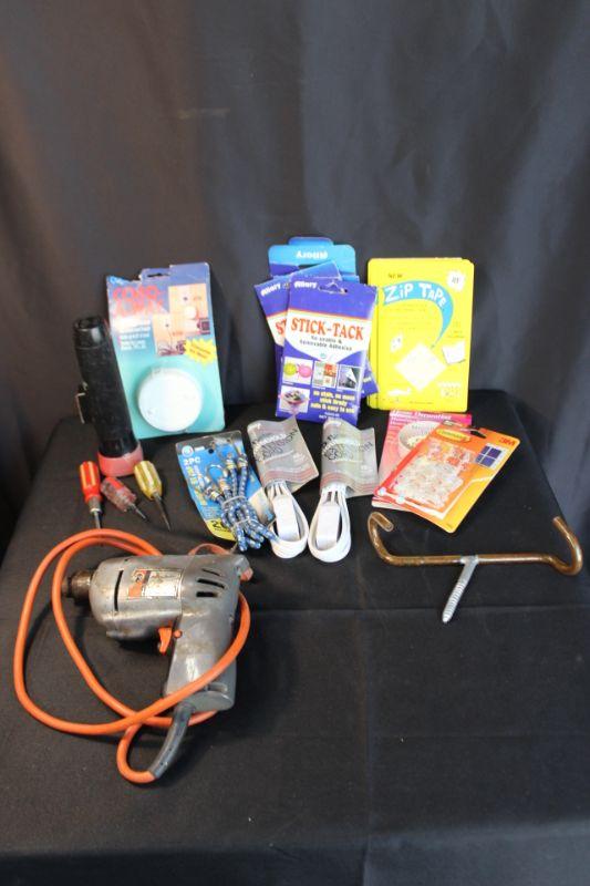 Miscellaneous household items lot. Includes everything pictured. Drill is a Black n Decker, it is working. Flashlight works but batteries are dying.