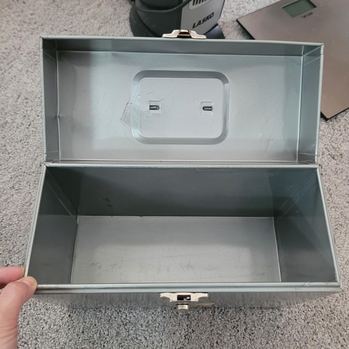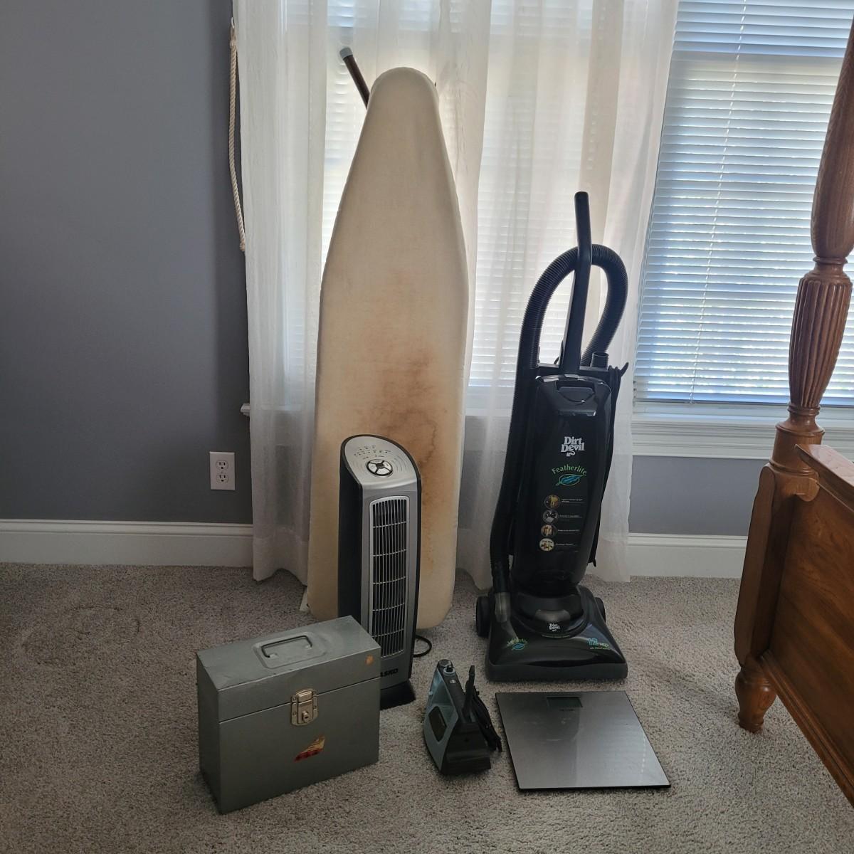 This lot of household items includes an ironing board, Black and Decker steam iron, Dirt Devil vacuum, Lasko heater, Taylor digital scale and metal storage box. Local pick up only.