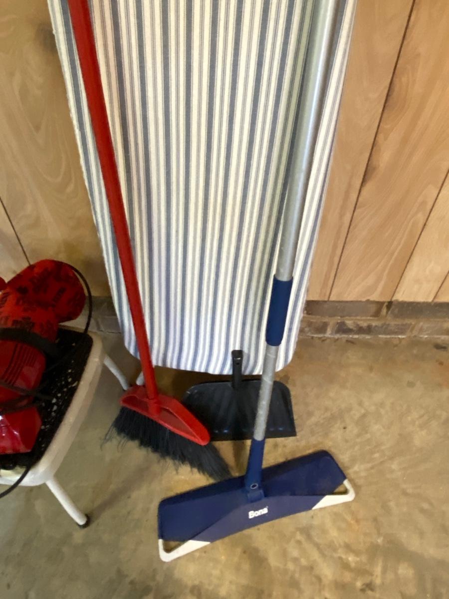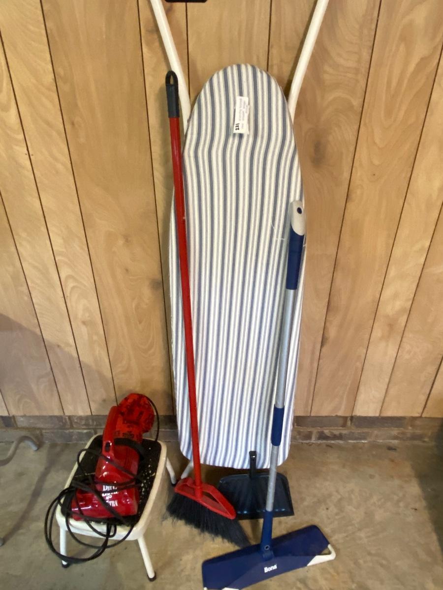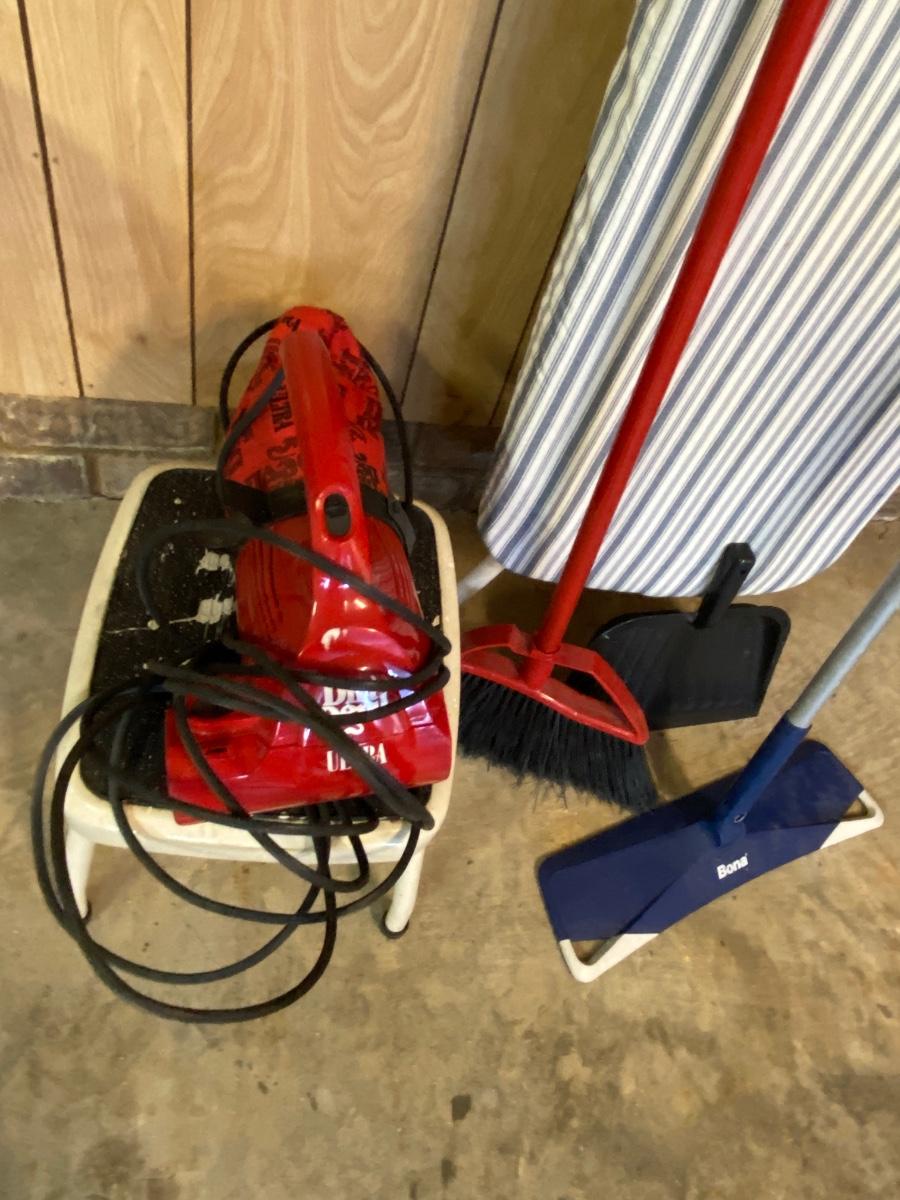 Broom, Ironing Board, Bona Floor Cleaner, Dirt Devil Vacuum, Foot Stool, and Dust Pan