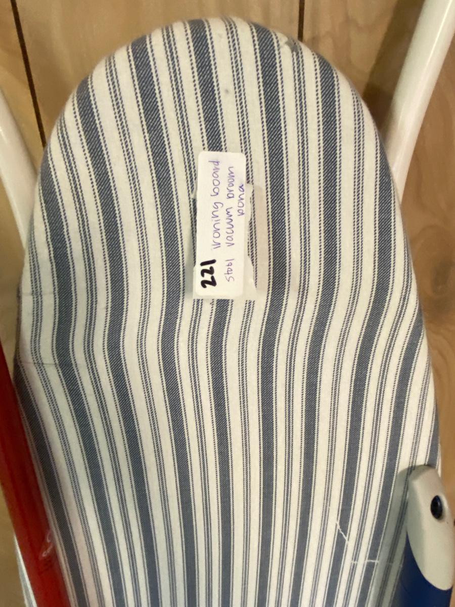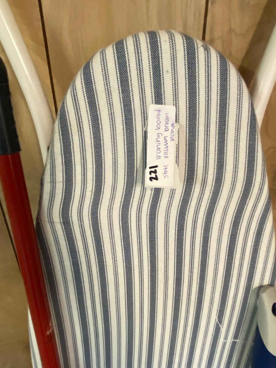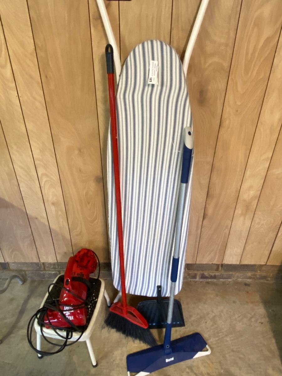 Broom, Ironing Board, Bona Floor Cleaner, Dirt Devil Vacuum, Foot Stool, and Dust Pan