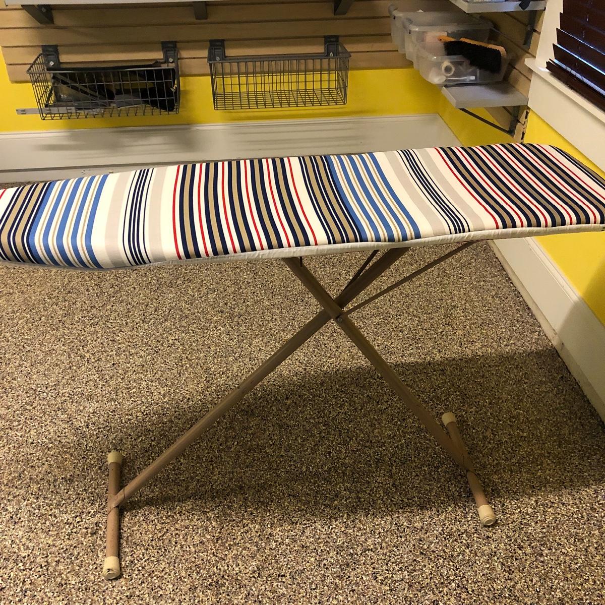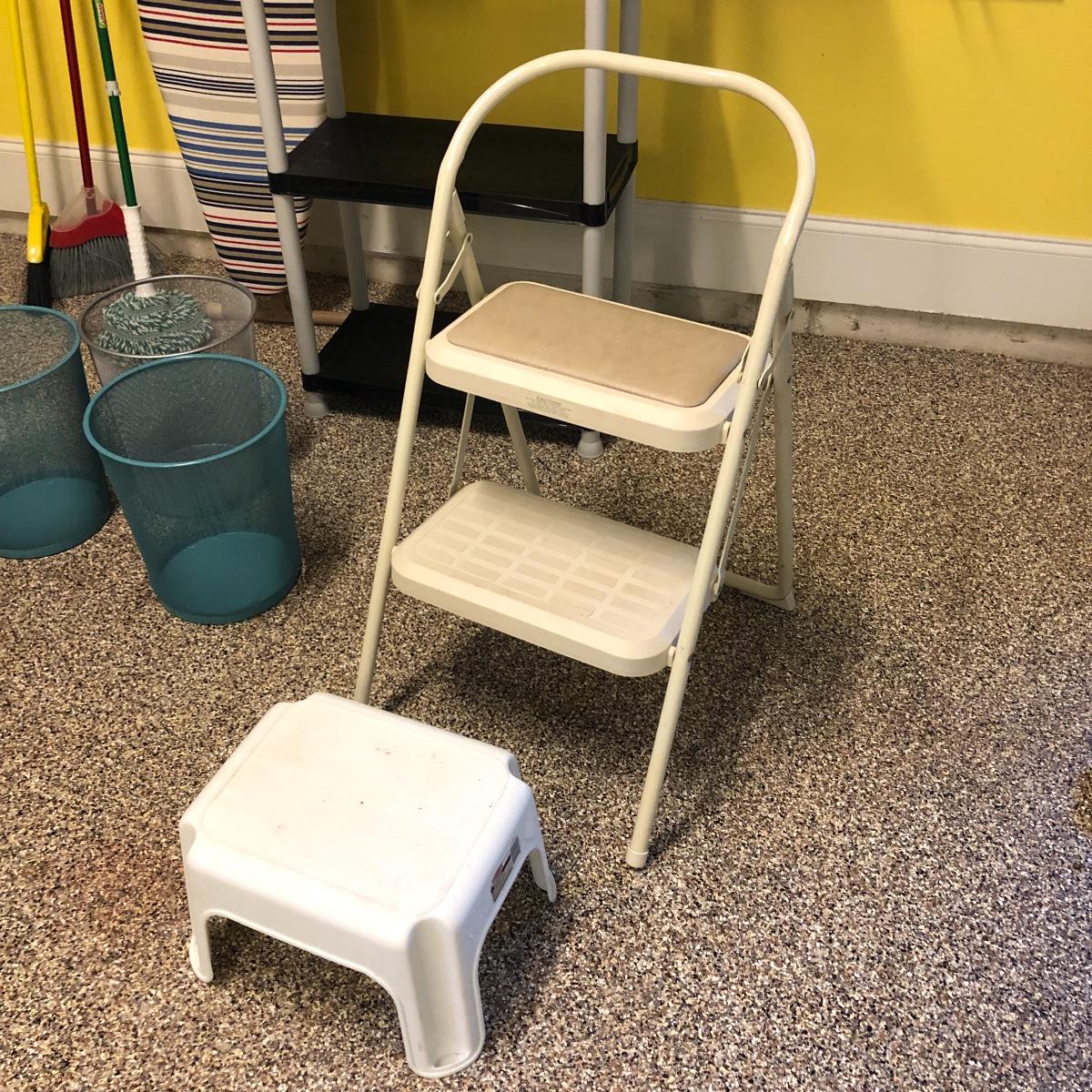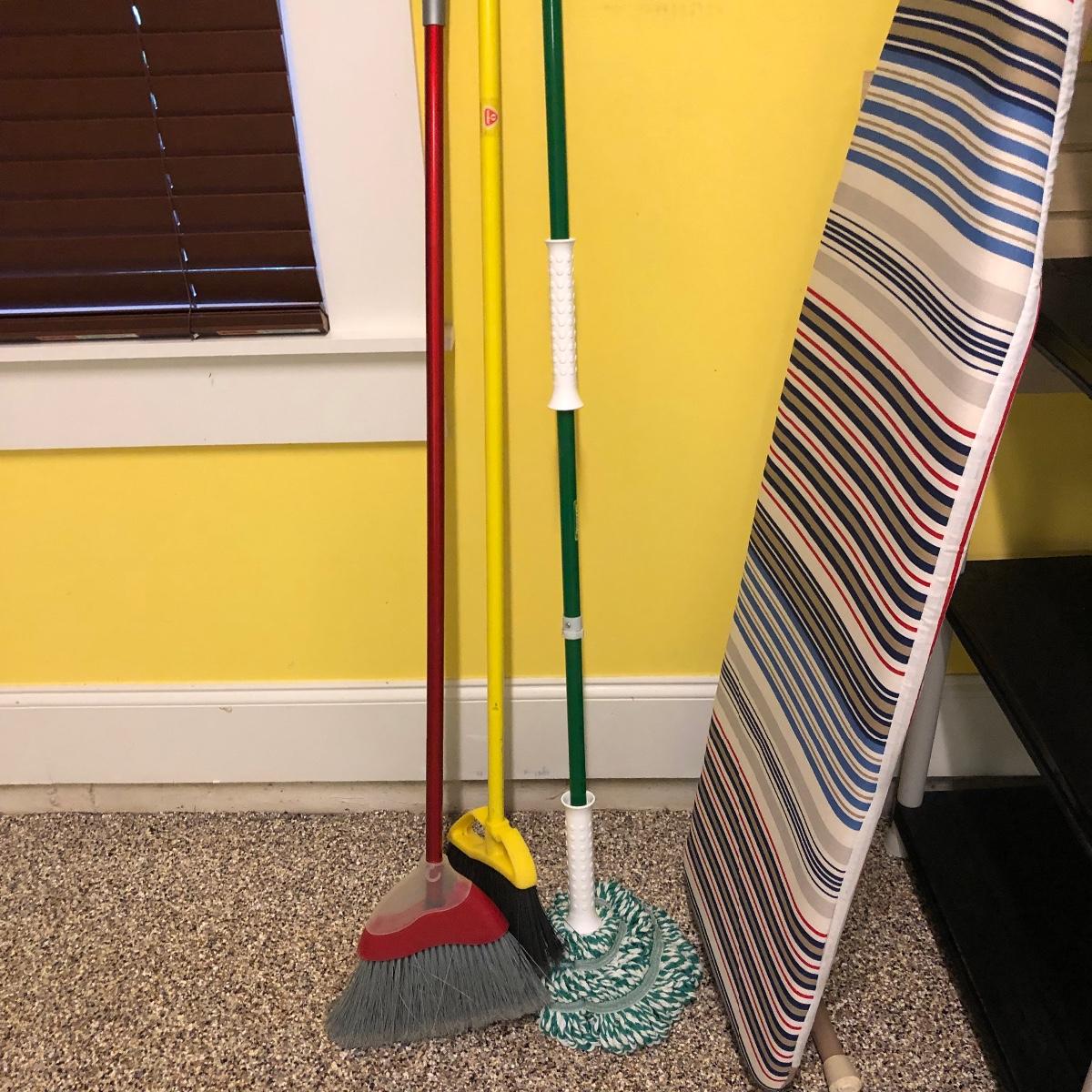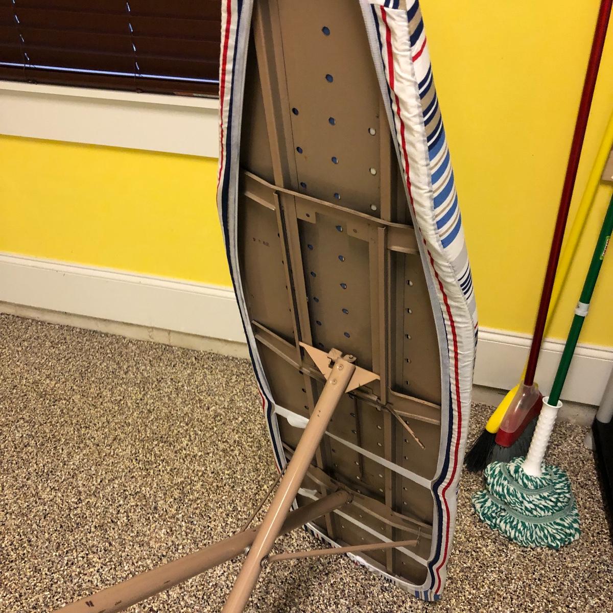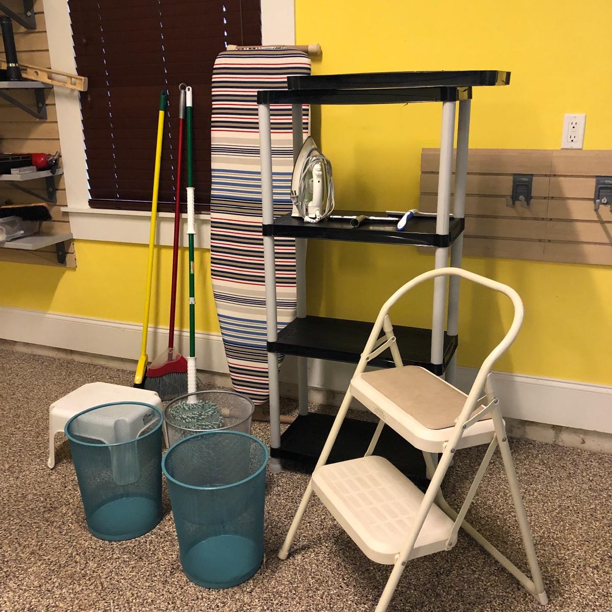 This lot includes an iron, ironing board, one shelving unit, one step stool and folding two step stool, three metal trash cans, two brooms and a mop. The iron powered on when plugged in. Local pick up only.
