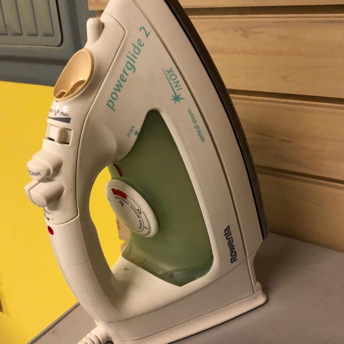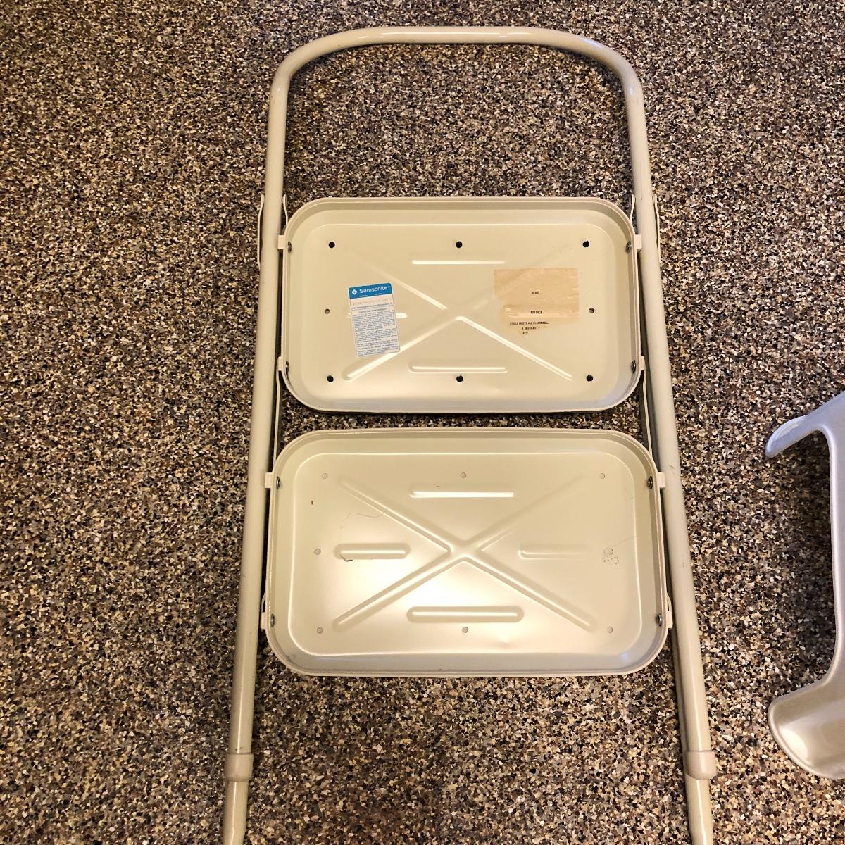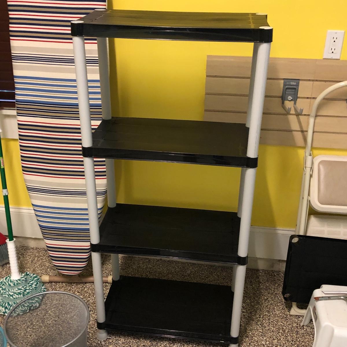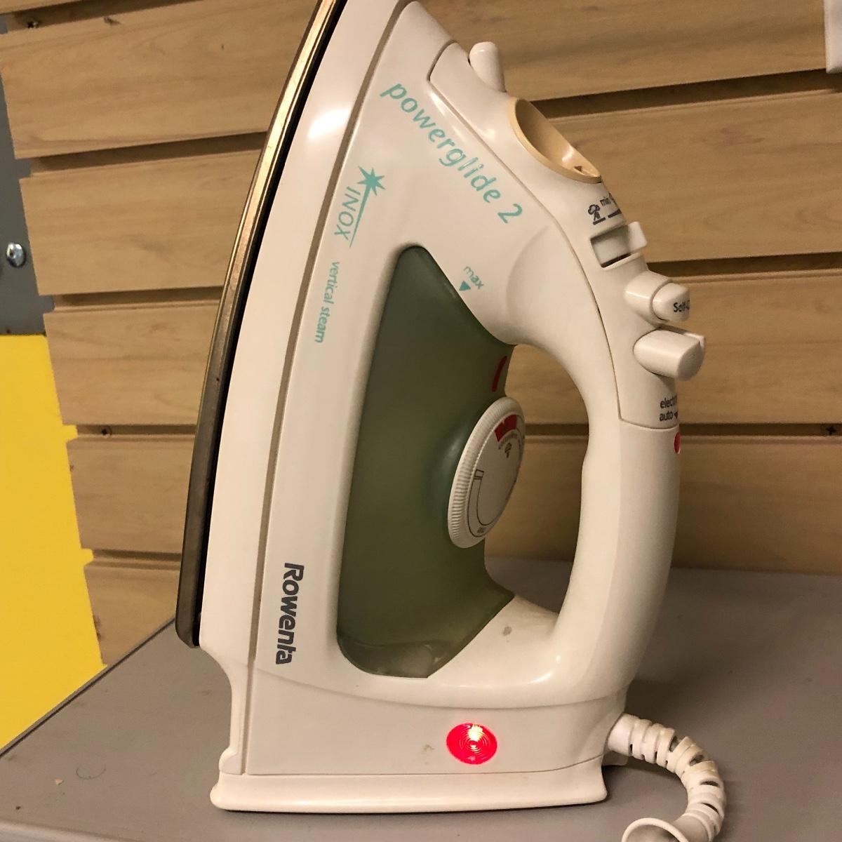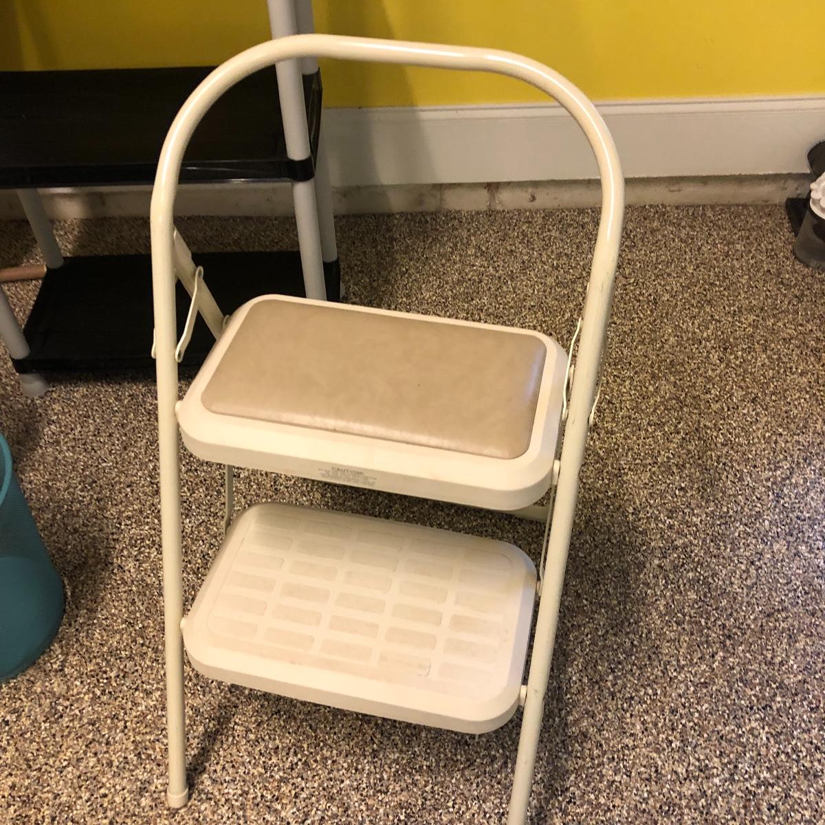 This lot includes an iron, ironing board, one shelving unit, one step stool and folding two step stool, three metal trash cans, two brooms and a mop. The iron powered on when plugged in. Local pick up only.