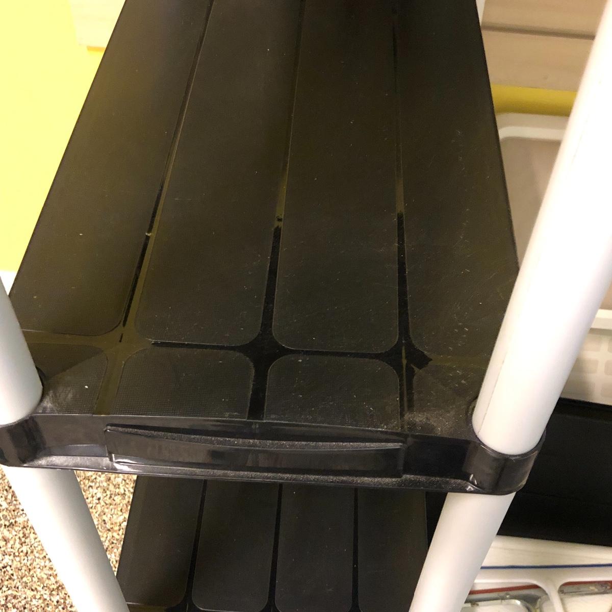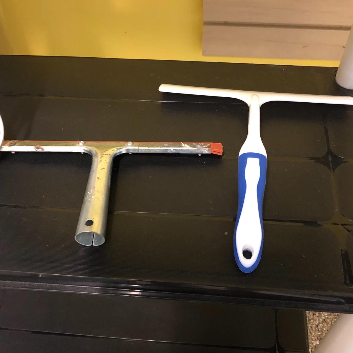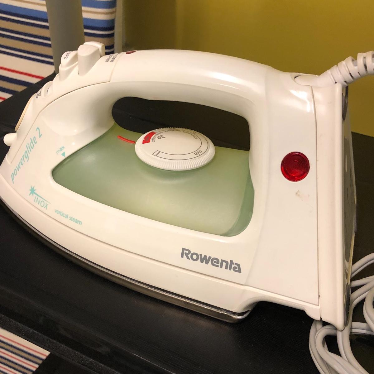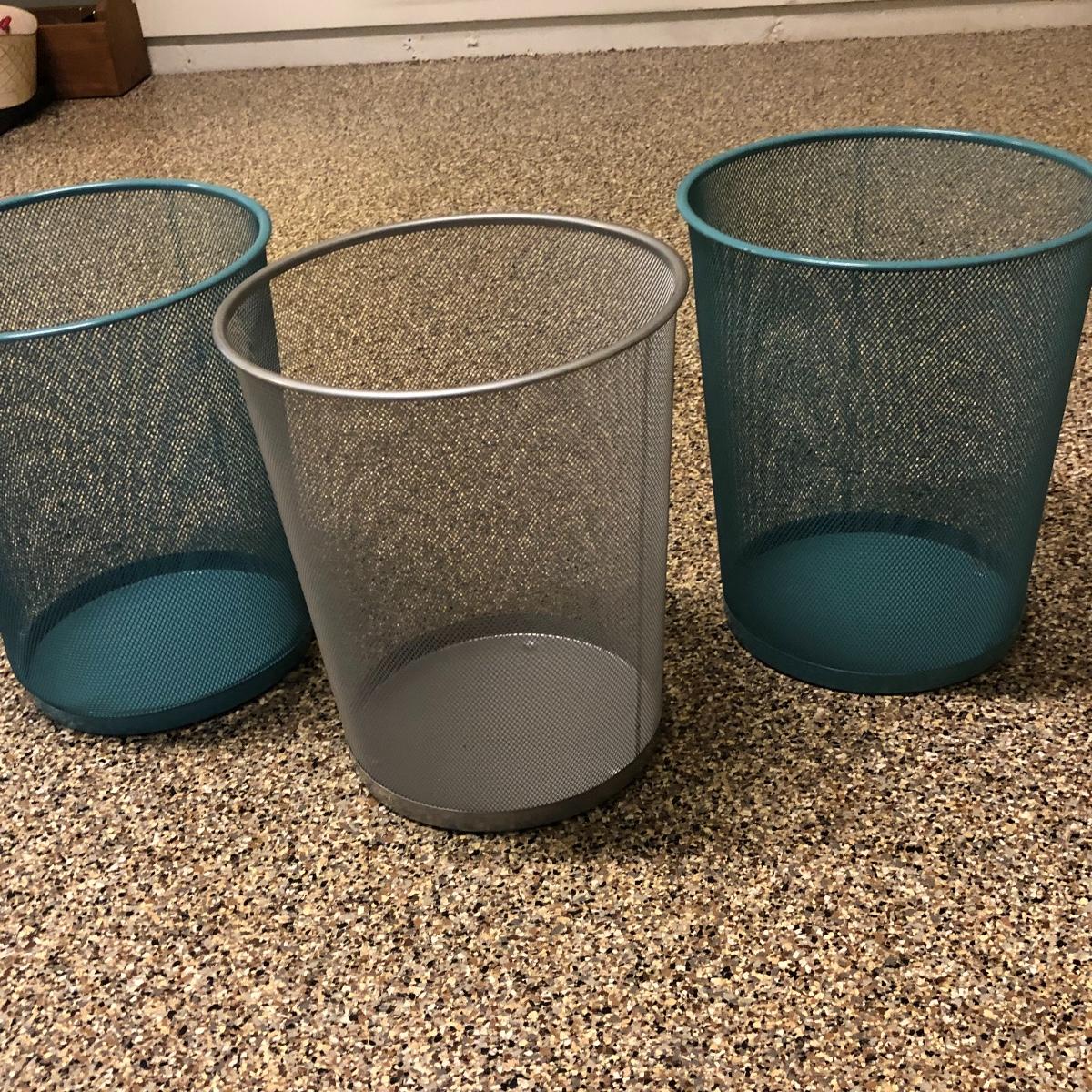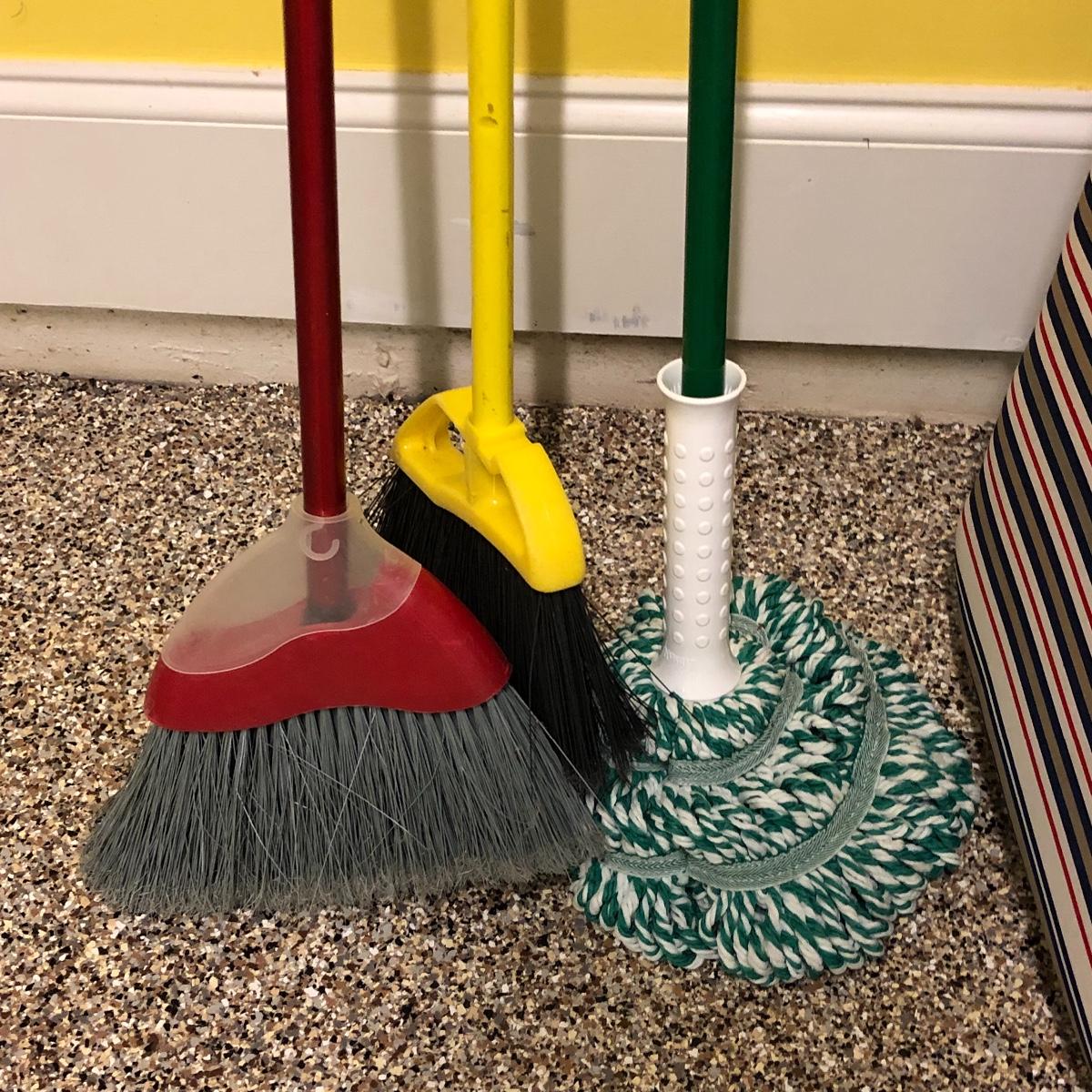 This lot includes an iron, ironing board, one shelving unit, one step stool and folding two step stool, three metal trash cans, two brooms and a mop. The iron powered on when plugged in. Local pick up only.