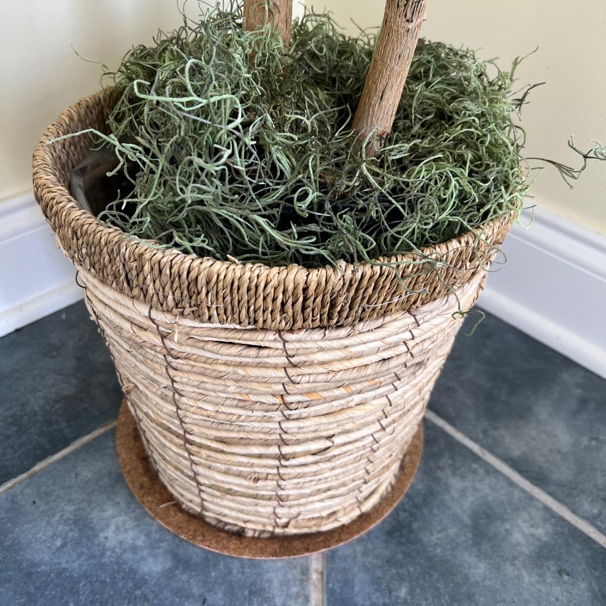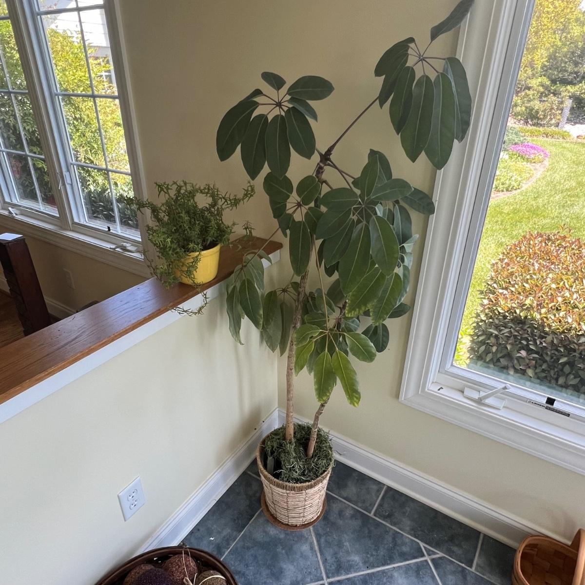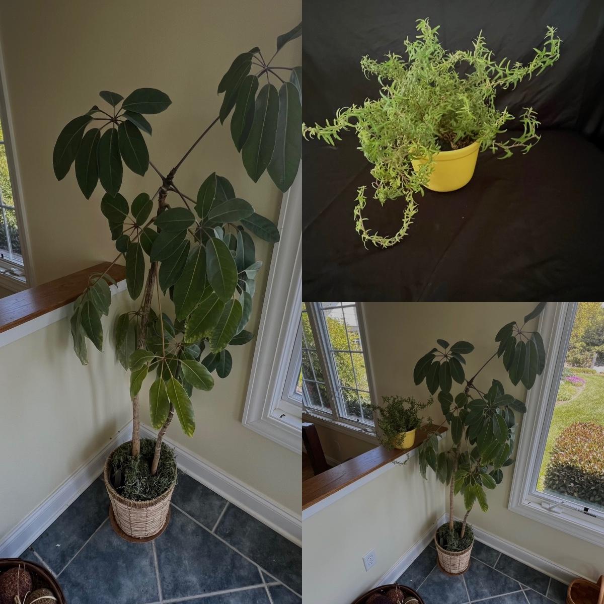 Two houseplants includes a tall Schefflera and an English Ivy plant potted in a pretty yellow ceramic pot (makers mark is indecipherable except it is USA made). The Schefflera is overdue for a new and larger pot and is need of fertilizing but should improve with some TLC. The basket pot that the pot sits in, measures 8.5” x 9.5”H; it has quite a bit of wear. Cork mat is included. Plant is 50”H from top of pot to top of plant.
