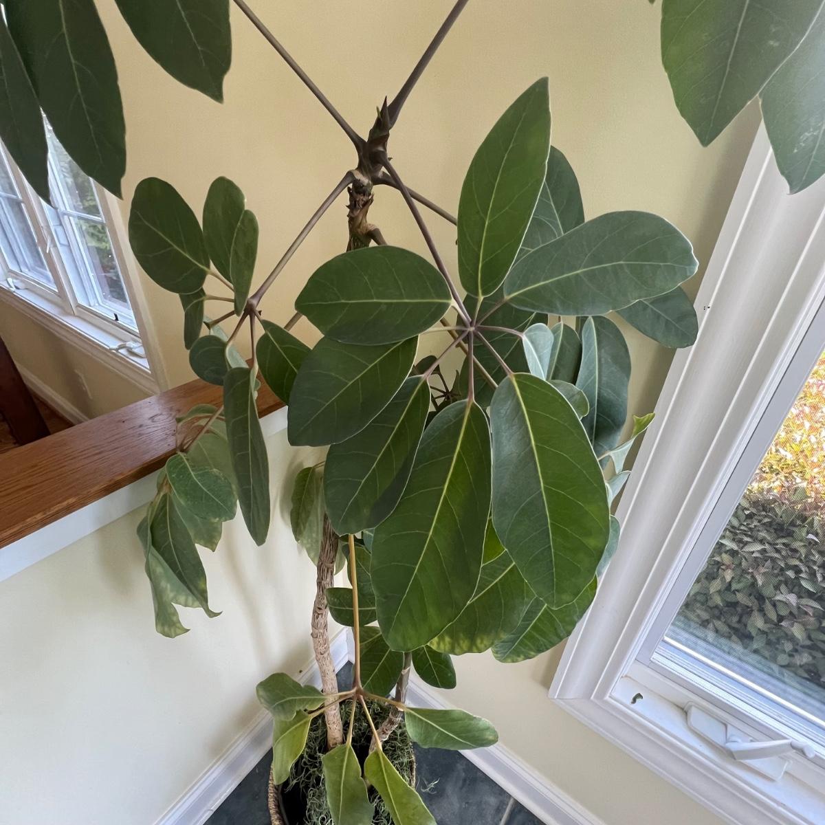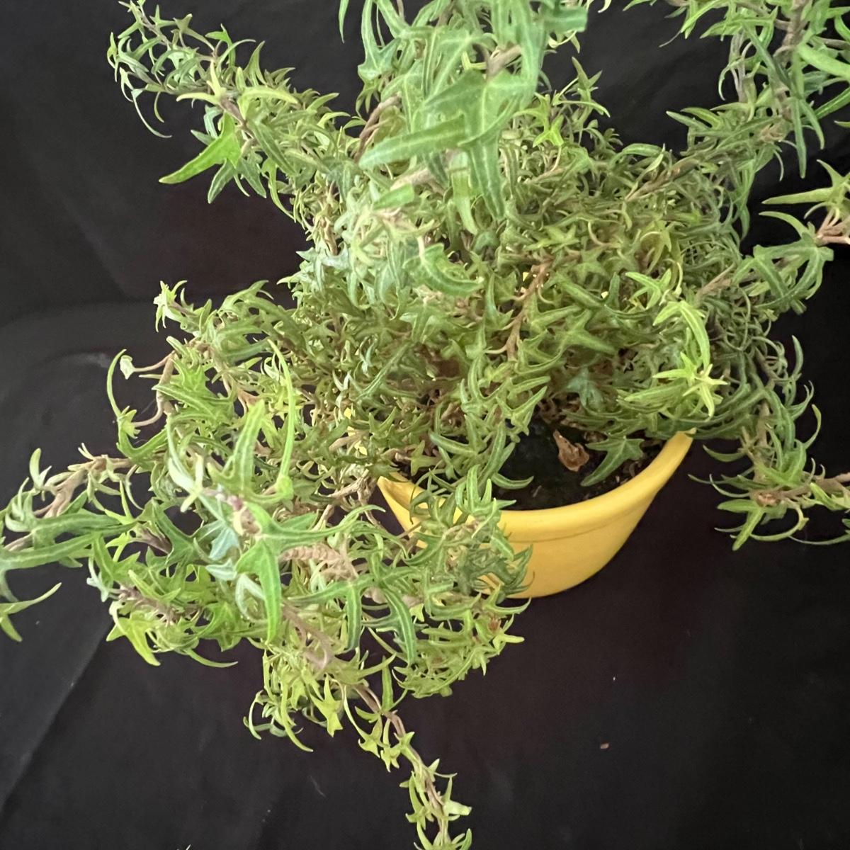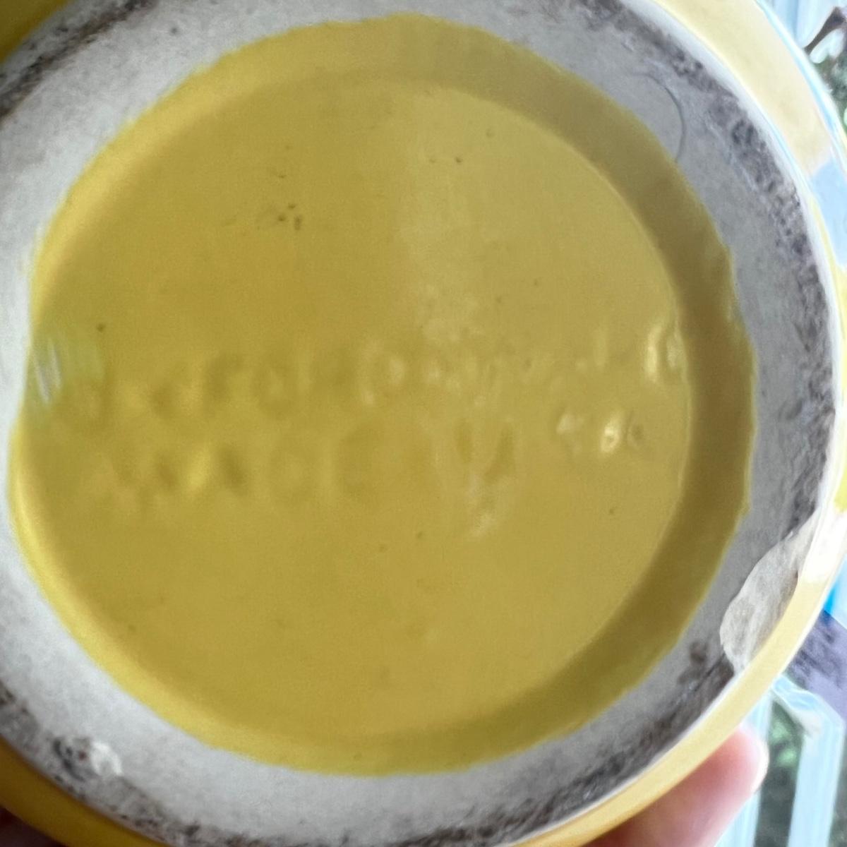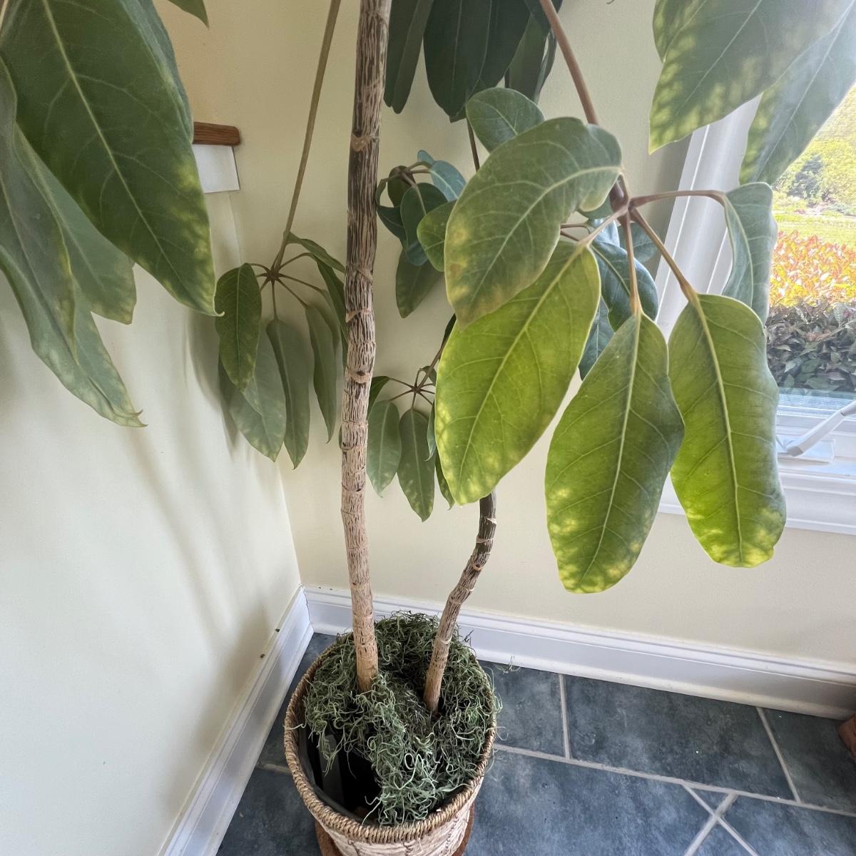 Two houseplants includes a tall Schefflera and an English Ivy plant potted in a pretty yellow ceramic pot (makers mark is indecipherable except it is USA made). The Schefflera is overdue for a new and larger pot and is need of fertilizing but should improve with some TLC. The basket pot that the pot sits in, measures 8.5” x 9.5”H; it has quite a bit of wear. Cork mat is included. Plant is 50”H from top of pot to top of plant.