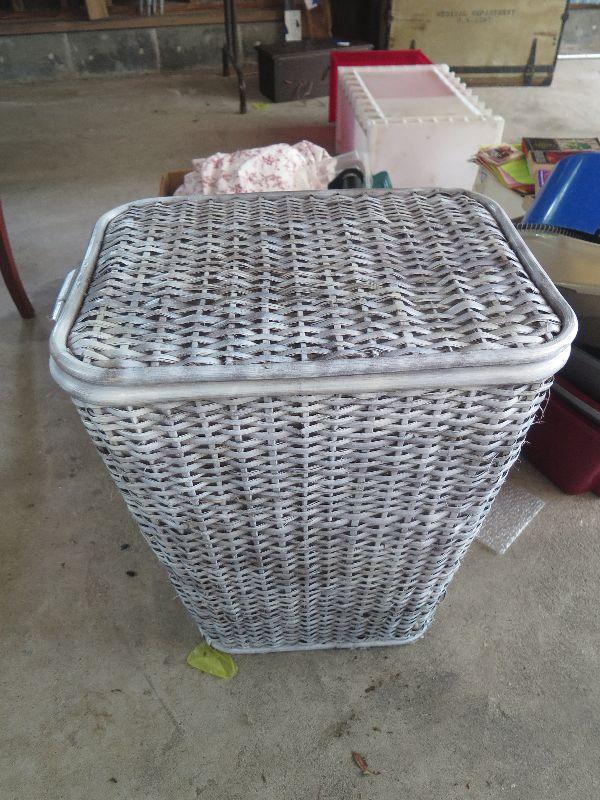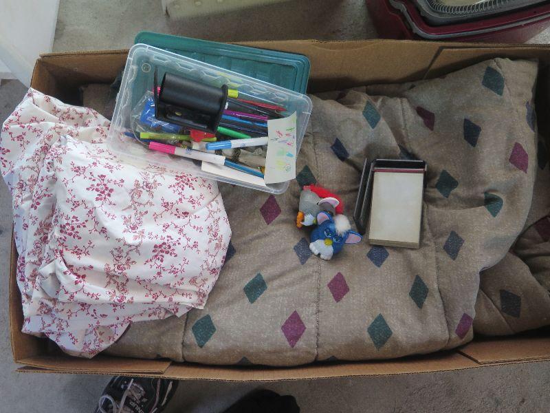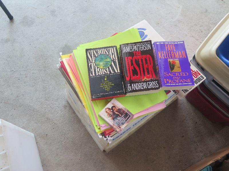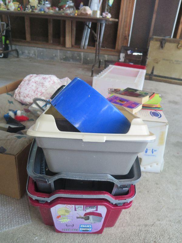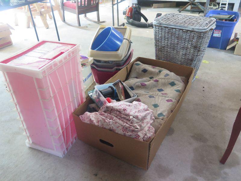Wicker hamper, plastic storage bin, kitty litter bins, books, office supplies, heated water bowl, and more. Bring help to move.