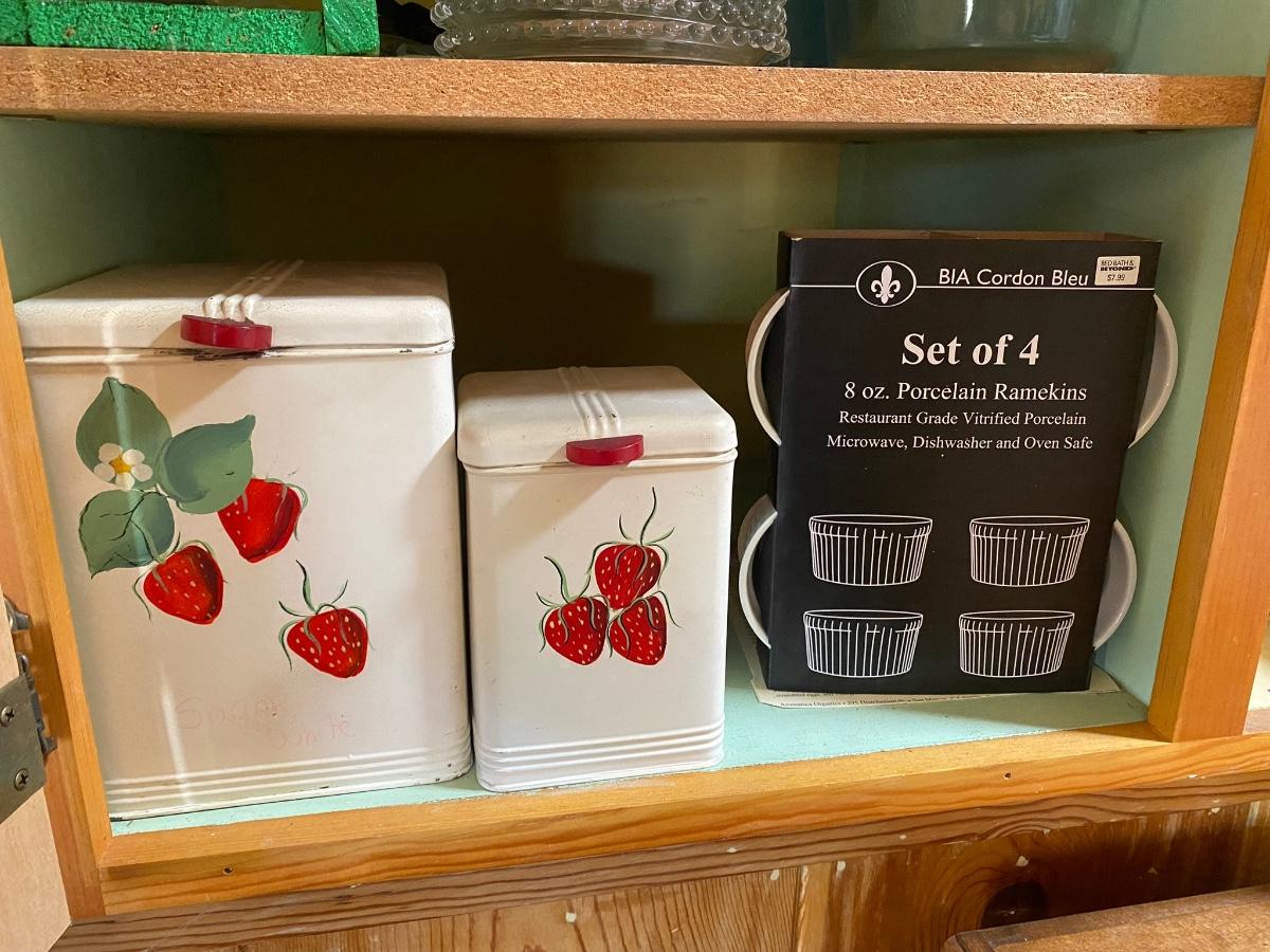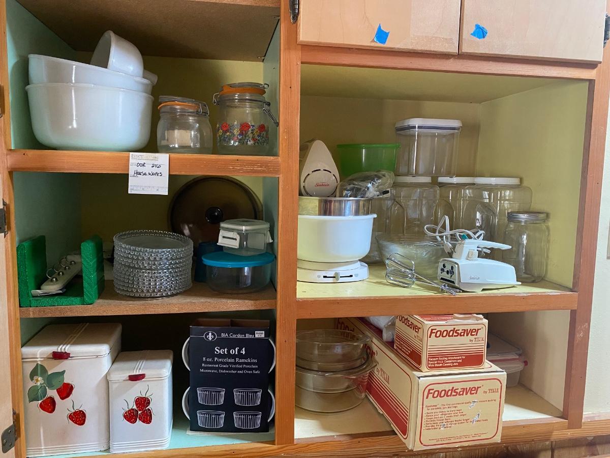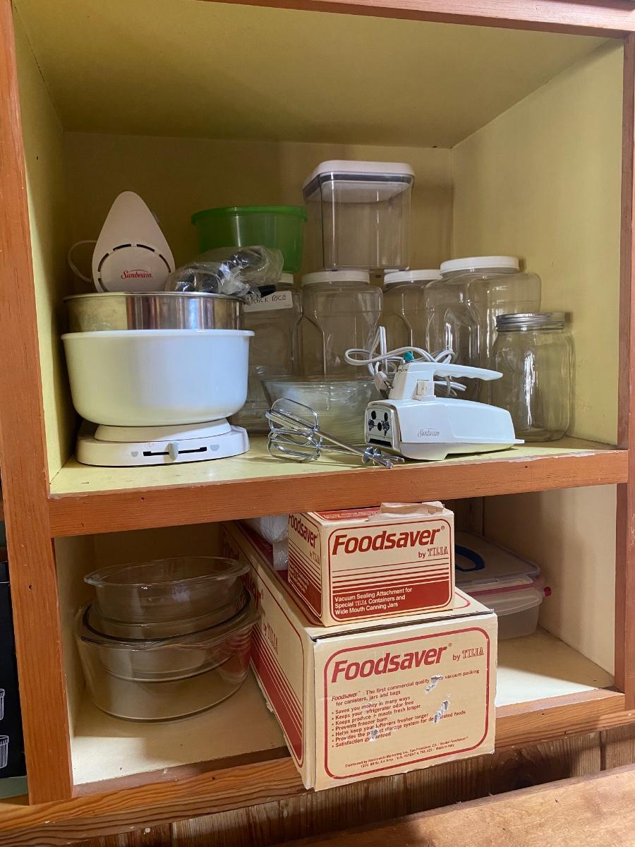 Sunbeam mixer, canisters, sunbeam hand mixer, ramekins and mixing bowls.