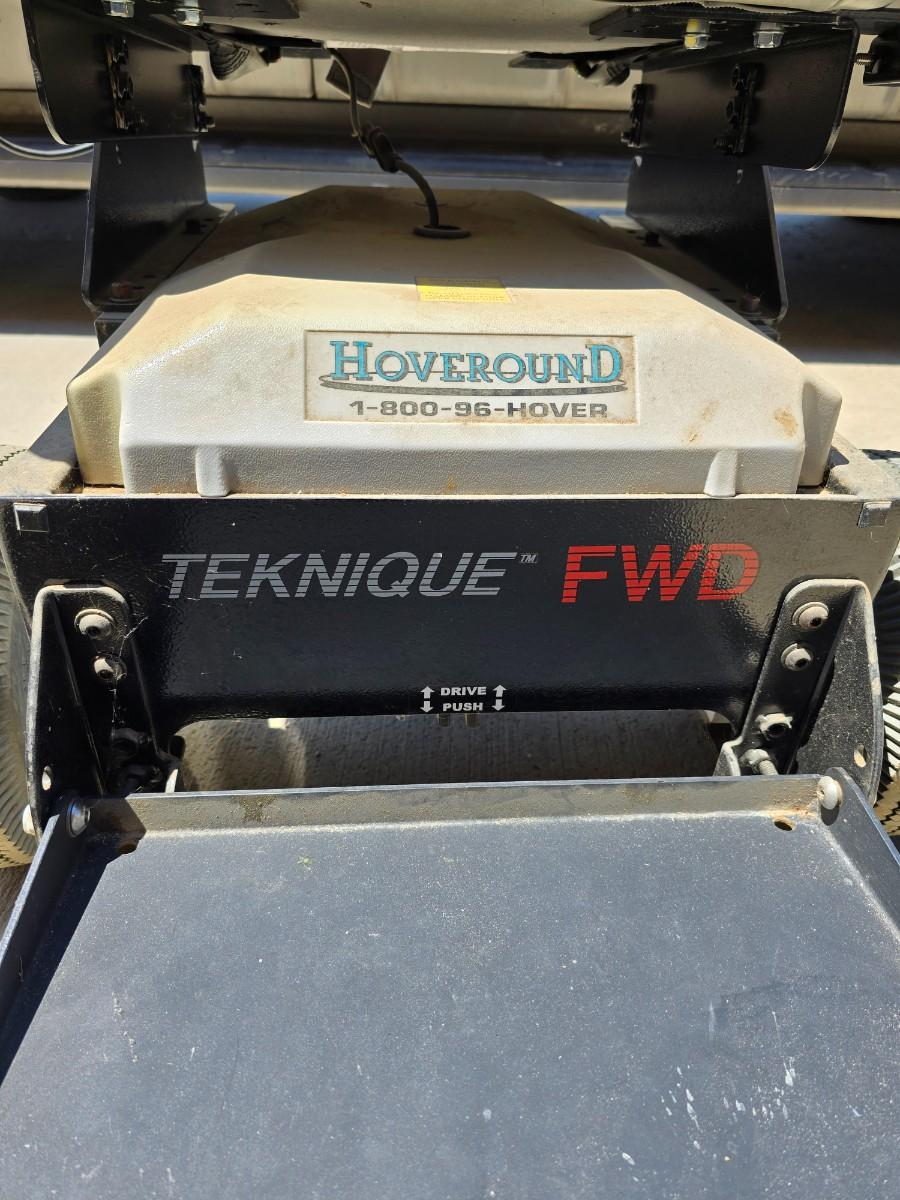 Heavy-duty front-wheel drive power chair by Hoveround. This Teknique FWD model features a rugged design with strong tires, padded armrests, joystick controller, and cushioned seat. Includes extendable mounting arms (one with clamp-style bracket) and a removable seat base. Signs of use and dust from storage, but overall solid condition. - UNTESTED but client says it works and was hardly used.