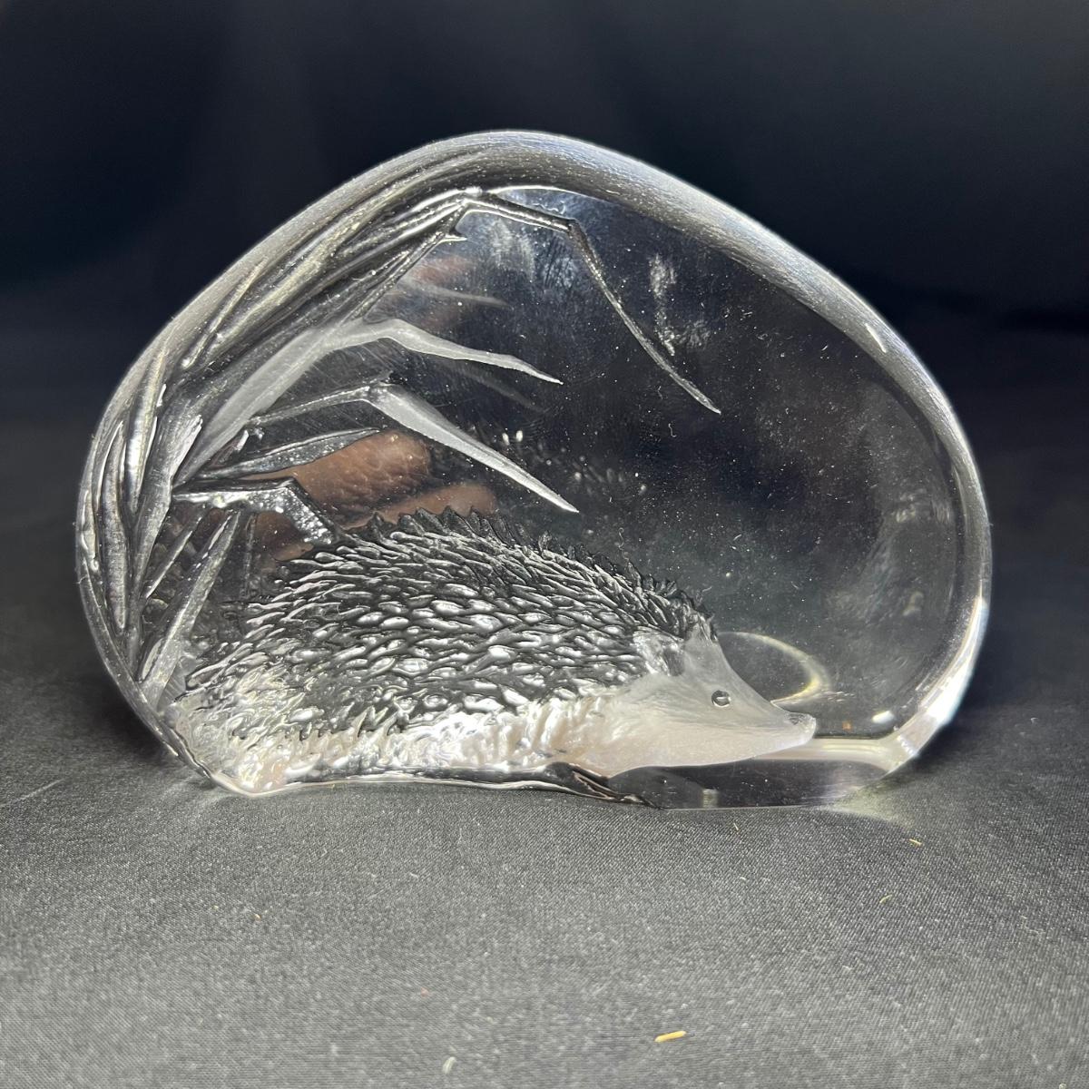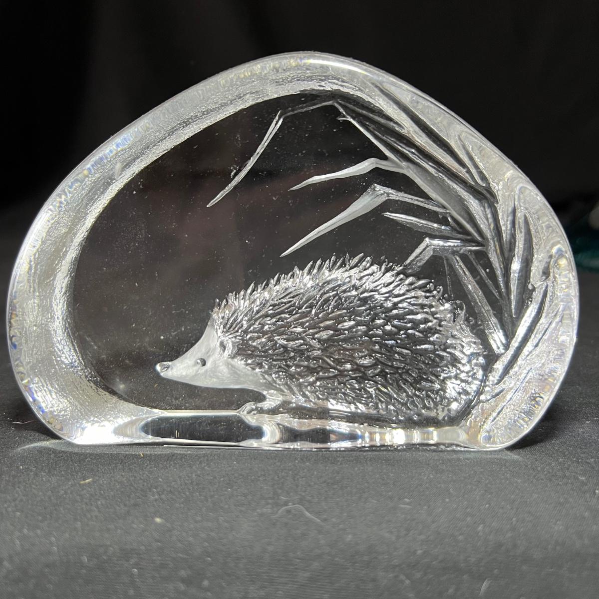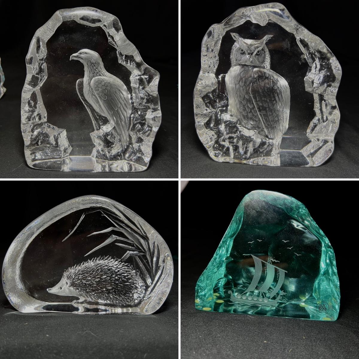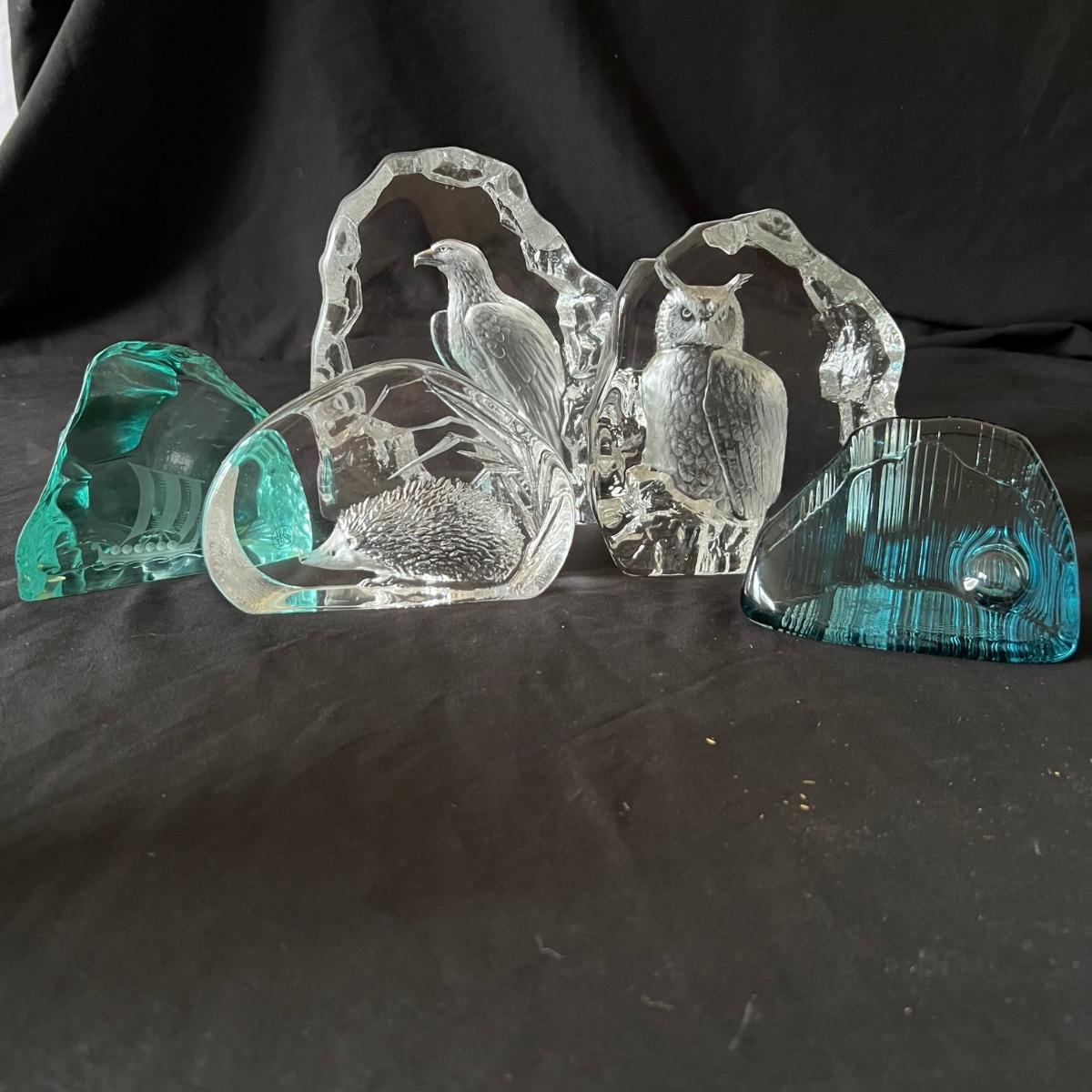 This collection of five glass paperweights includes a blue etched Viking ship that is signed and has its Hovmantorp sticker; the signature is extremely small and hard to read but the words Handmade and Sweden are decipherable. The two birds of prey are possibly lead crystal and Mats Jonasson, but no signatures or stickers; the hawk is the largest item and measures 5” x 2” x 6.5”H. The hedgehog is signed, the fifth paper weight which is a pretty blue color has no markings.