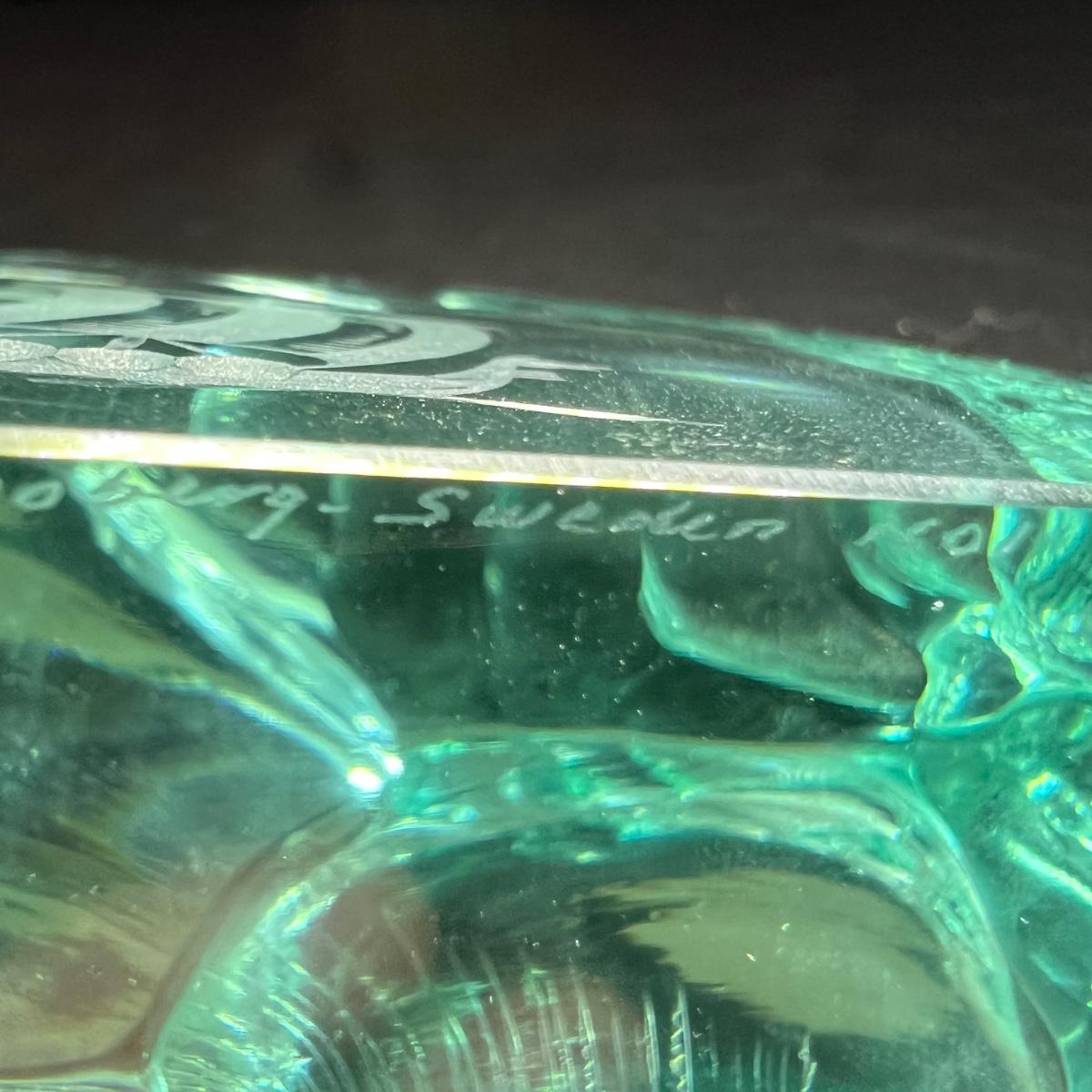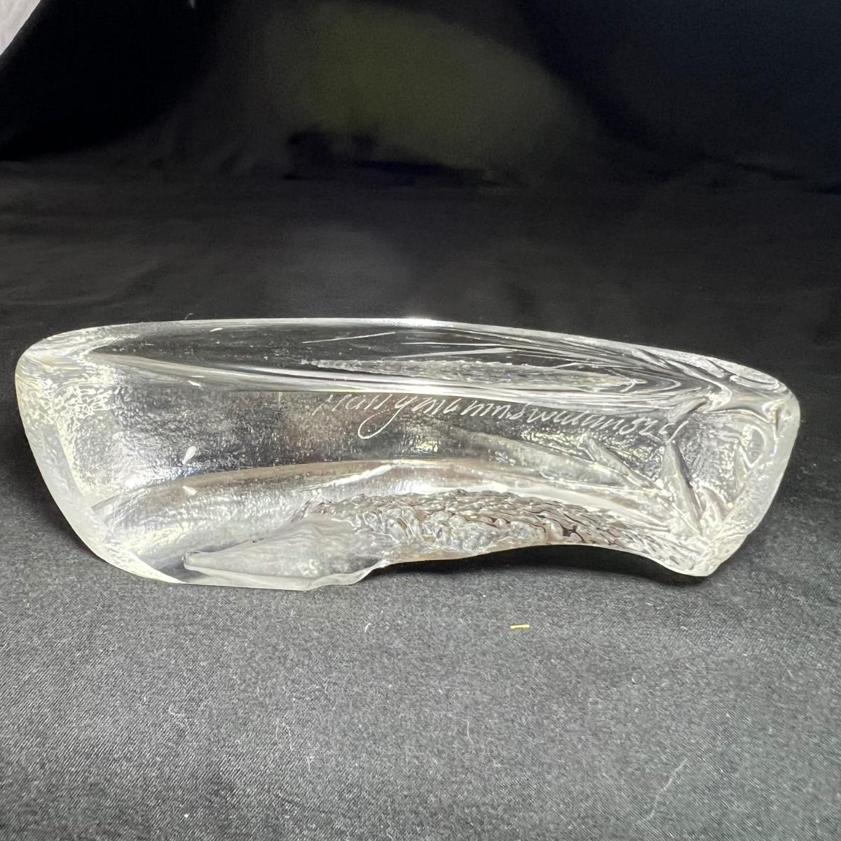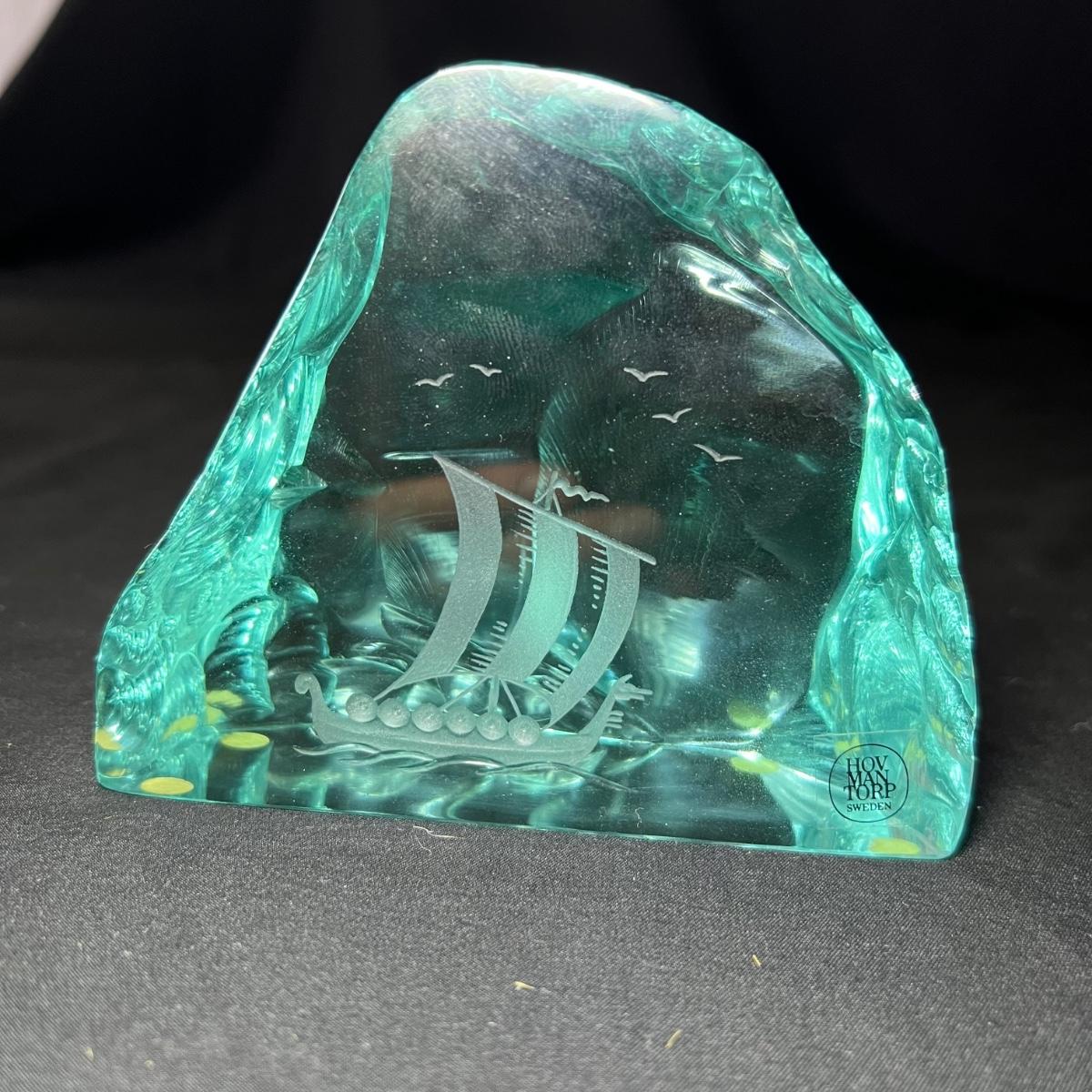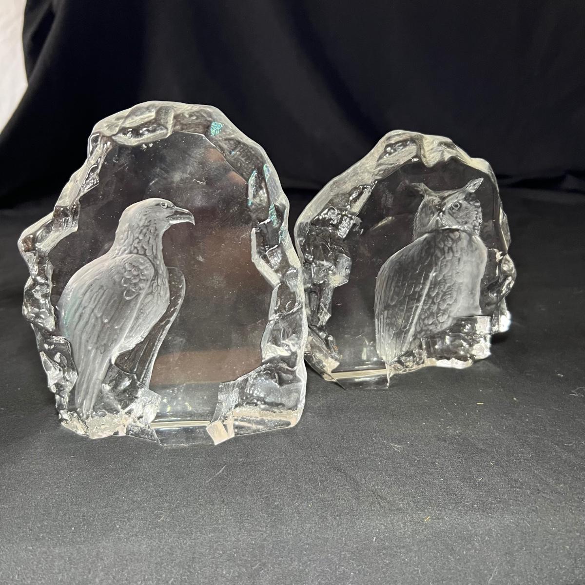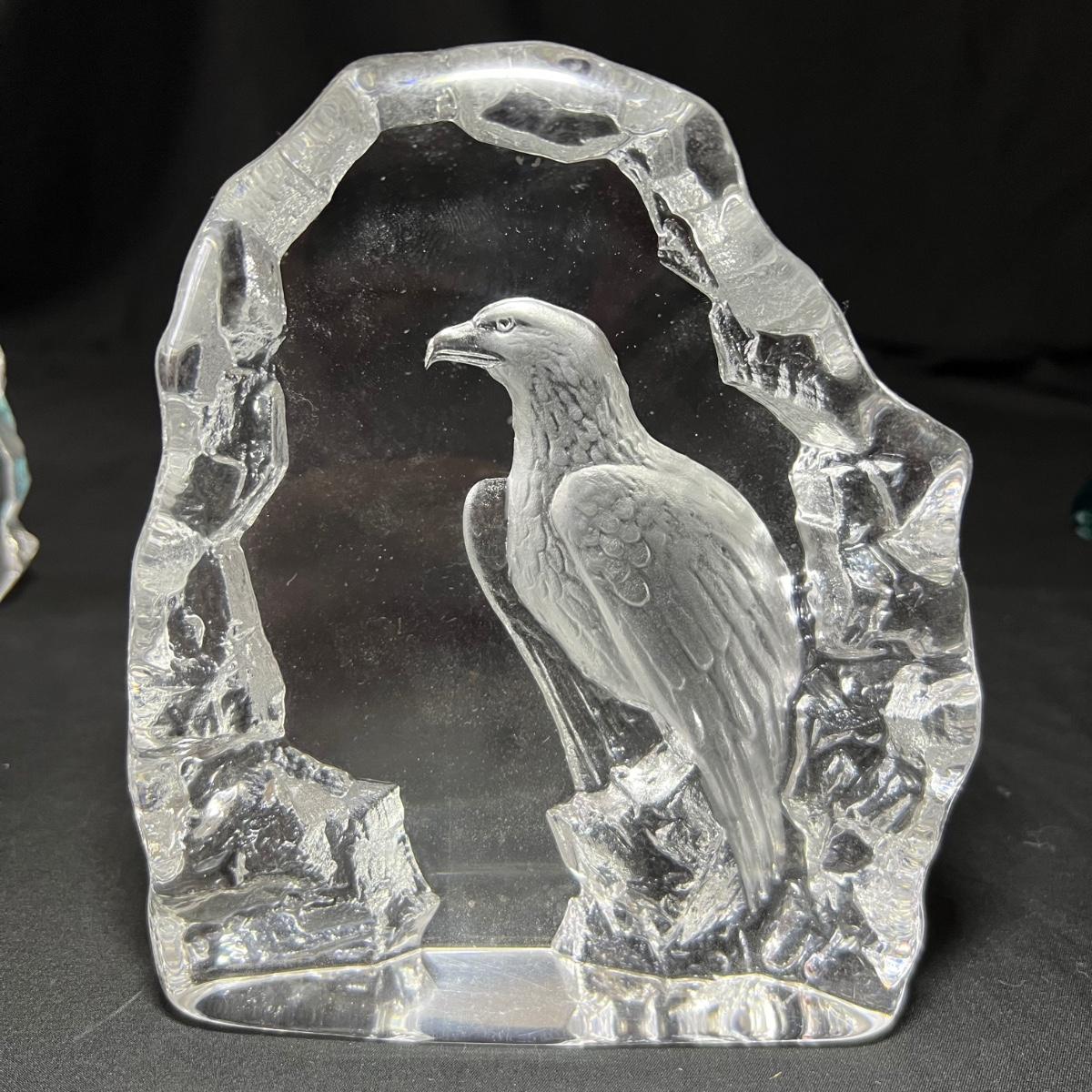 This collection of five glass paperweights includes a blue etched Viking ship that is signed and has its Hovmantorp sticker; the signature is extremely small and hard to read but the words Handmade and Sweden are decipherable. The two birds of prey are possibly lead crystal and Mats Jonasson, but no signatures or stickers; the hawk is the largest item and measures 5” x 2” x 6.5”H. The hedgehog is signed, the fifth paper weight which is a pretty blue color has no markings.