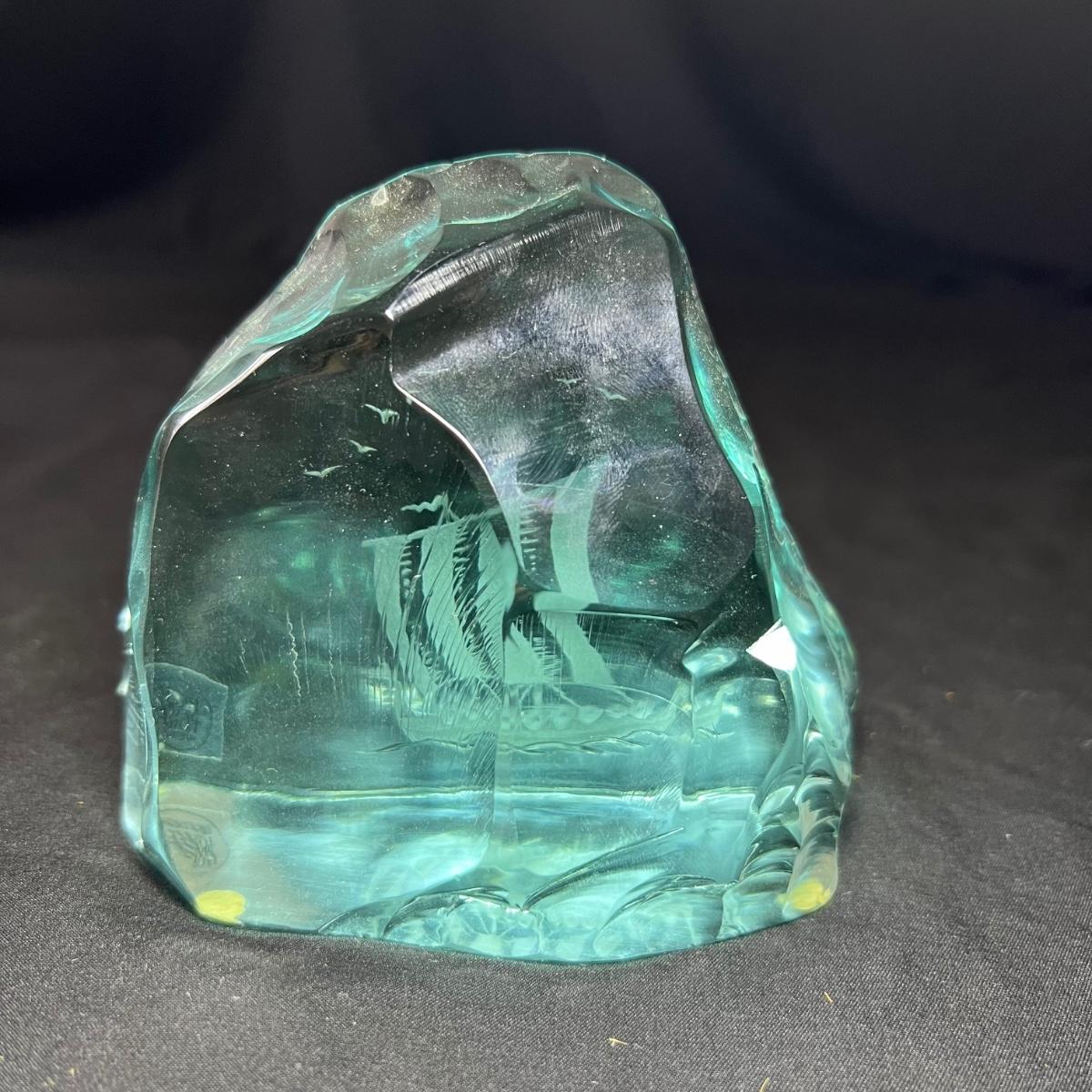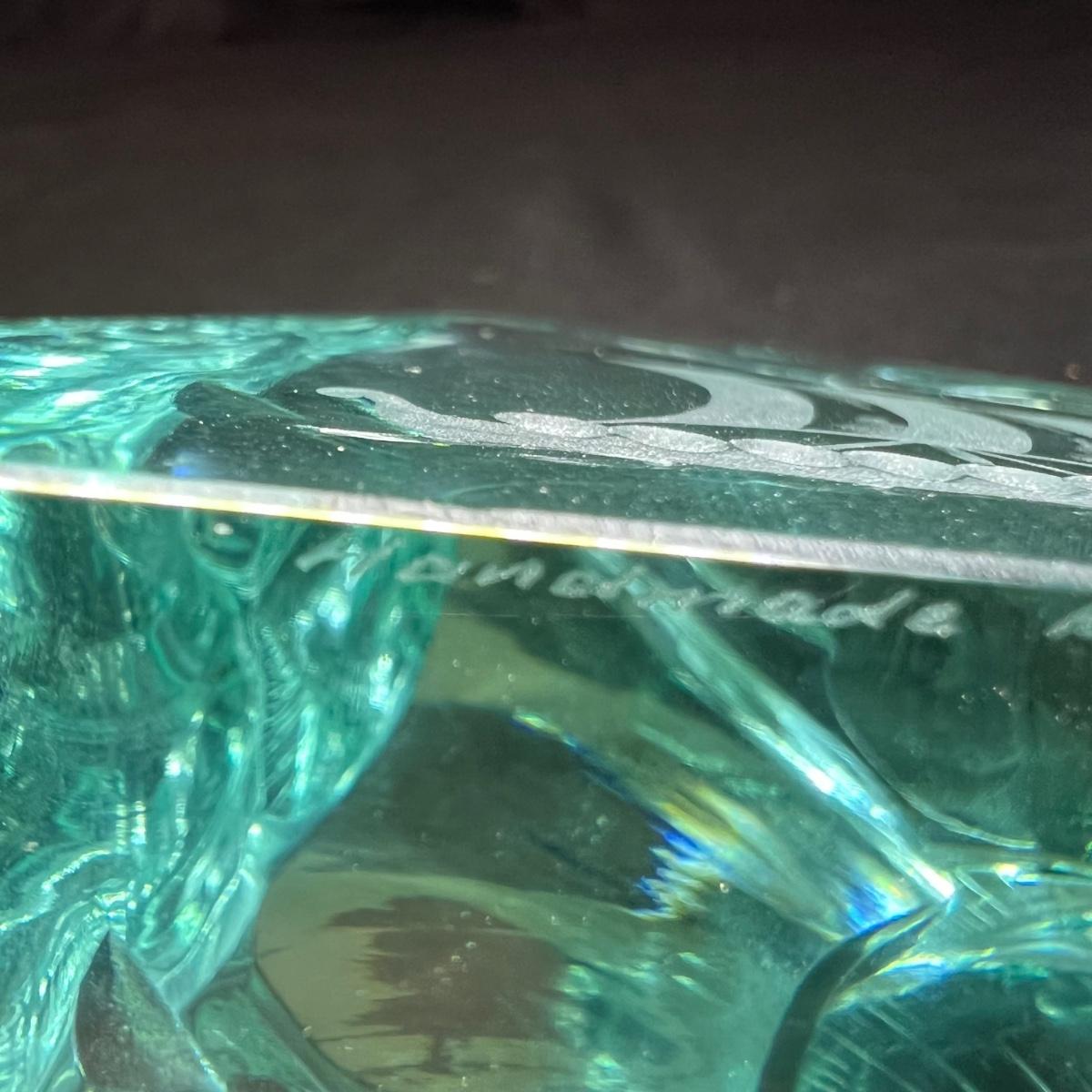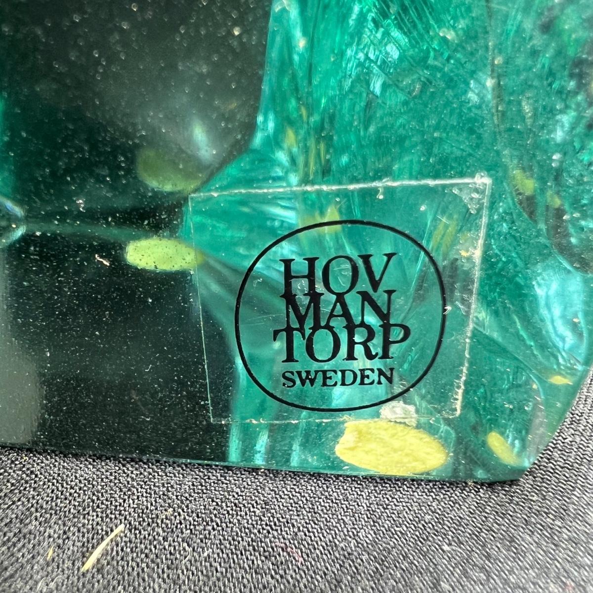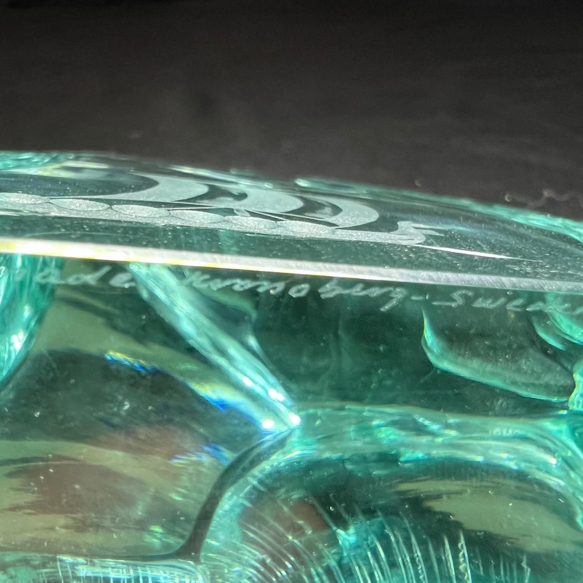 This collection of five glass paperweights includes a blue etched Viking ship that is signed and has its Hovmantorp sticker; the signature is extremely small and hard to read but the words Handmade and Sweden are decipherable. The two birds of prey are possibly lead crystal and Mats Jonasson, but no signatures or stickers; the hawk is the largest item and measures 5” x 2” x 6.5”H. The hedgehog is signed, the fifth paper weight which is a pretty blue color has no markings.
