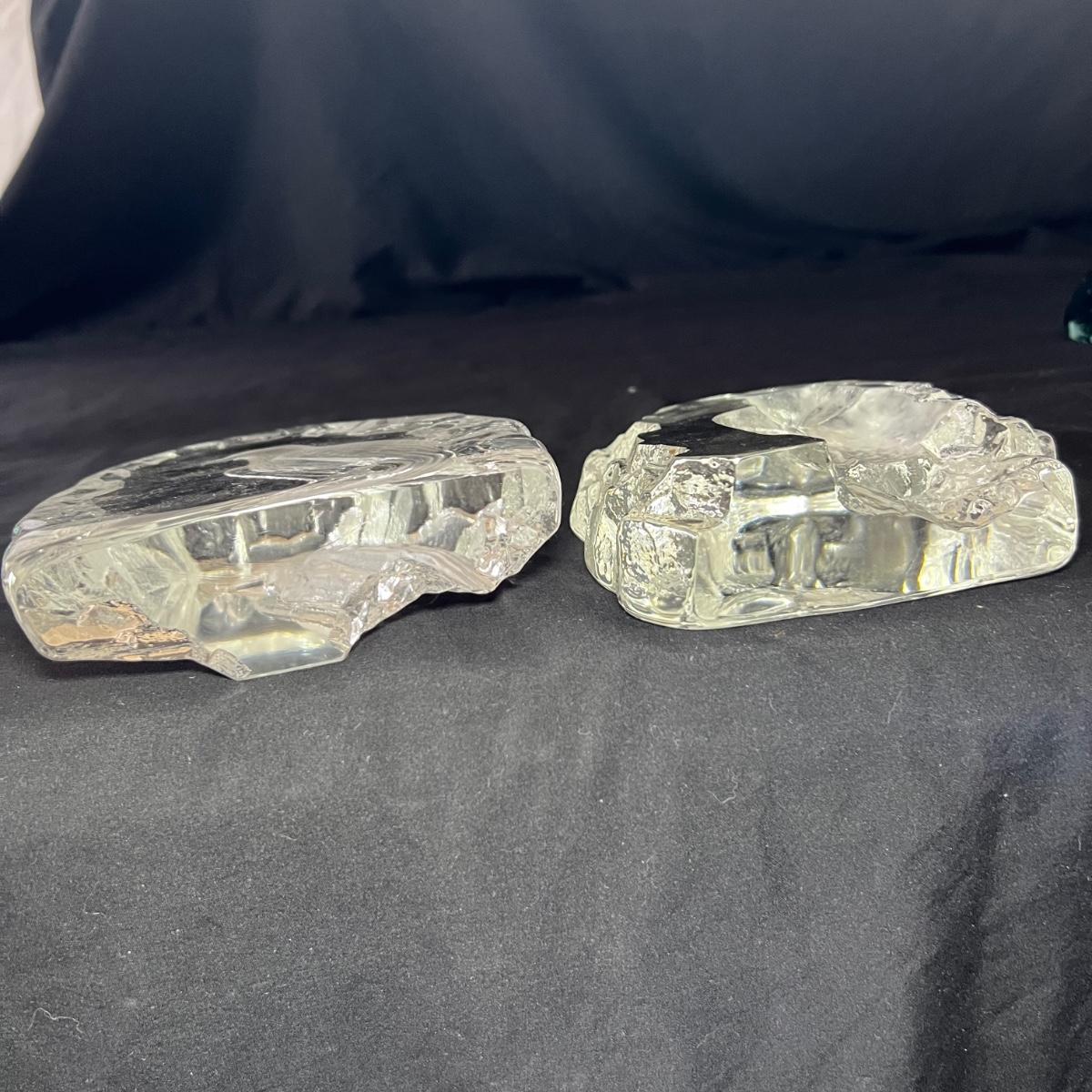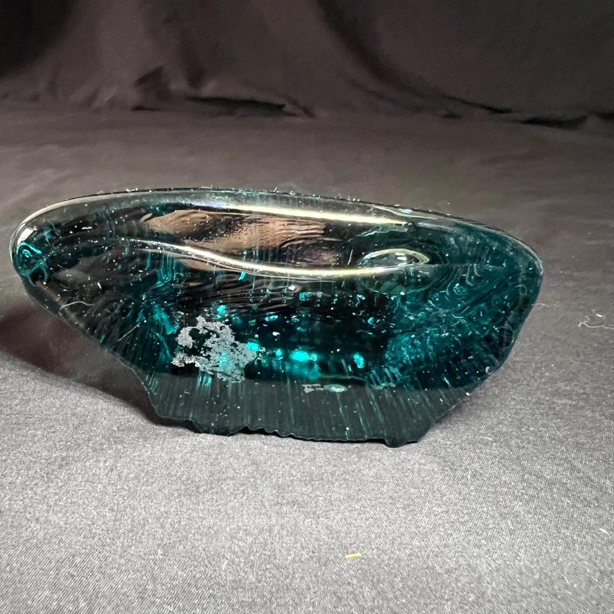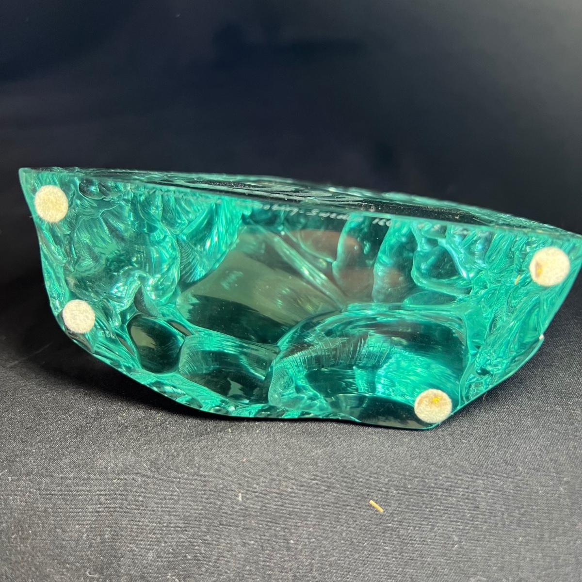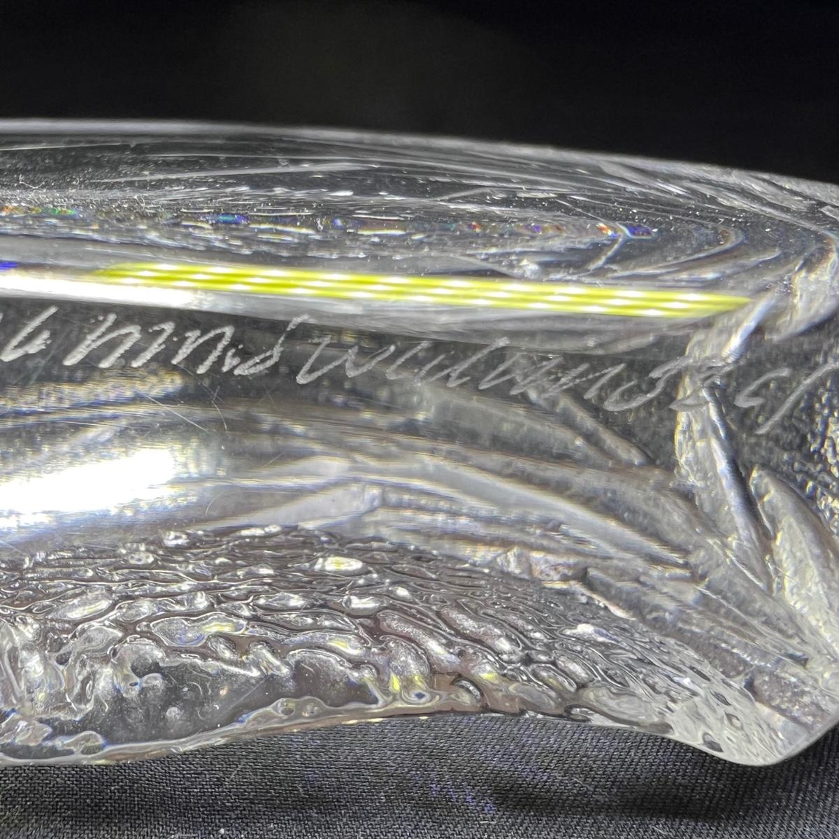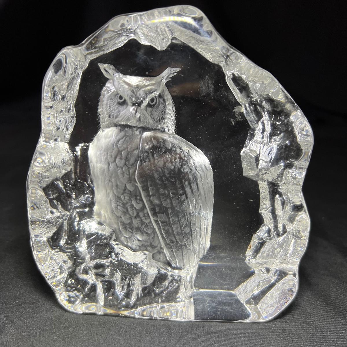 This collection of five glass paperweights includes a blue etched Viking ship that is signed and has its Hovmantorp sticker; the signature is extremely small and hard to read but the words Handmade and Sweden are decipherable. The two birds of prey are possibly lead crystal and Mats Jonasson, but no signatures or stickers; the hawk is the largest item and measures 5” x 2” x 6.5”H. The hedgehog is signed, the fifth paper weight which is a pretty blue color has no markings.