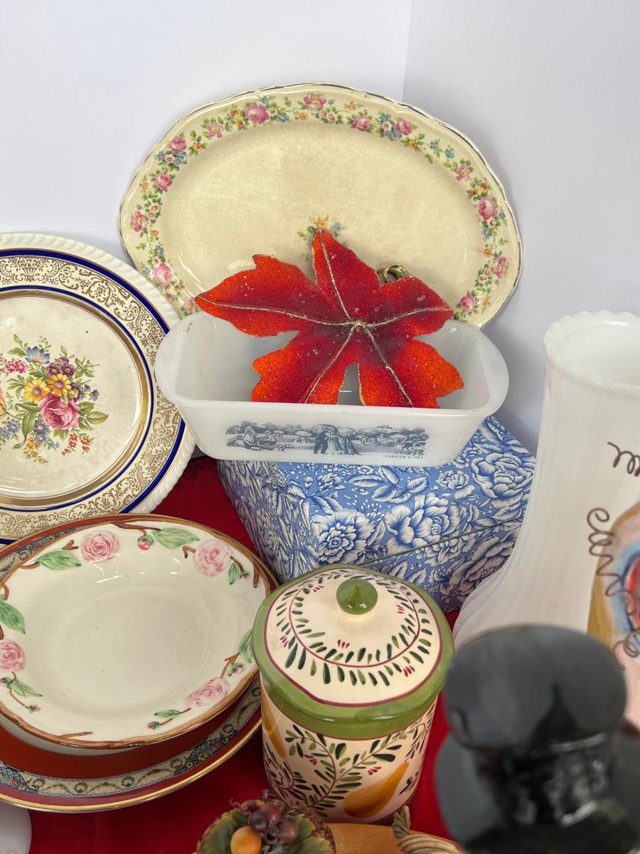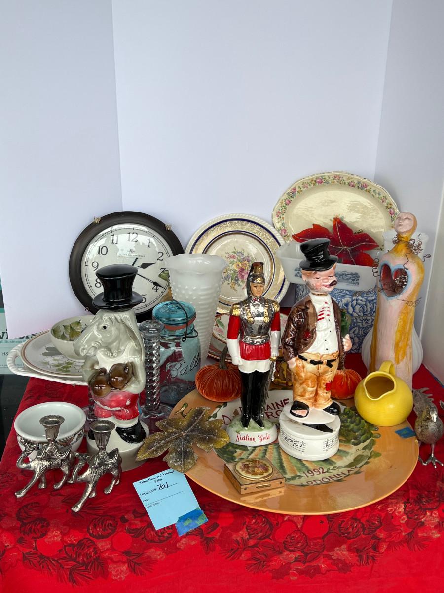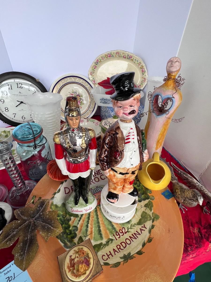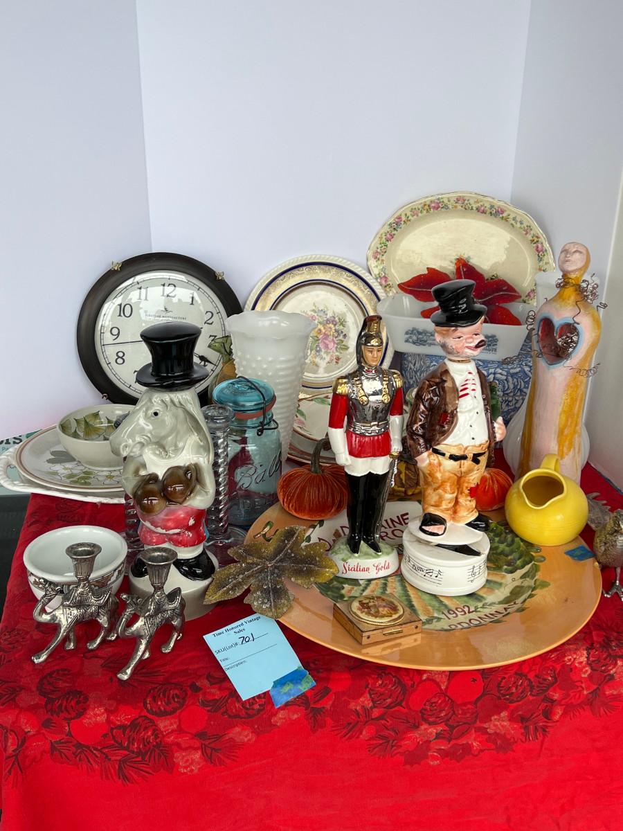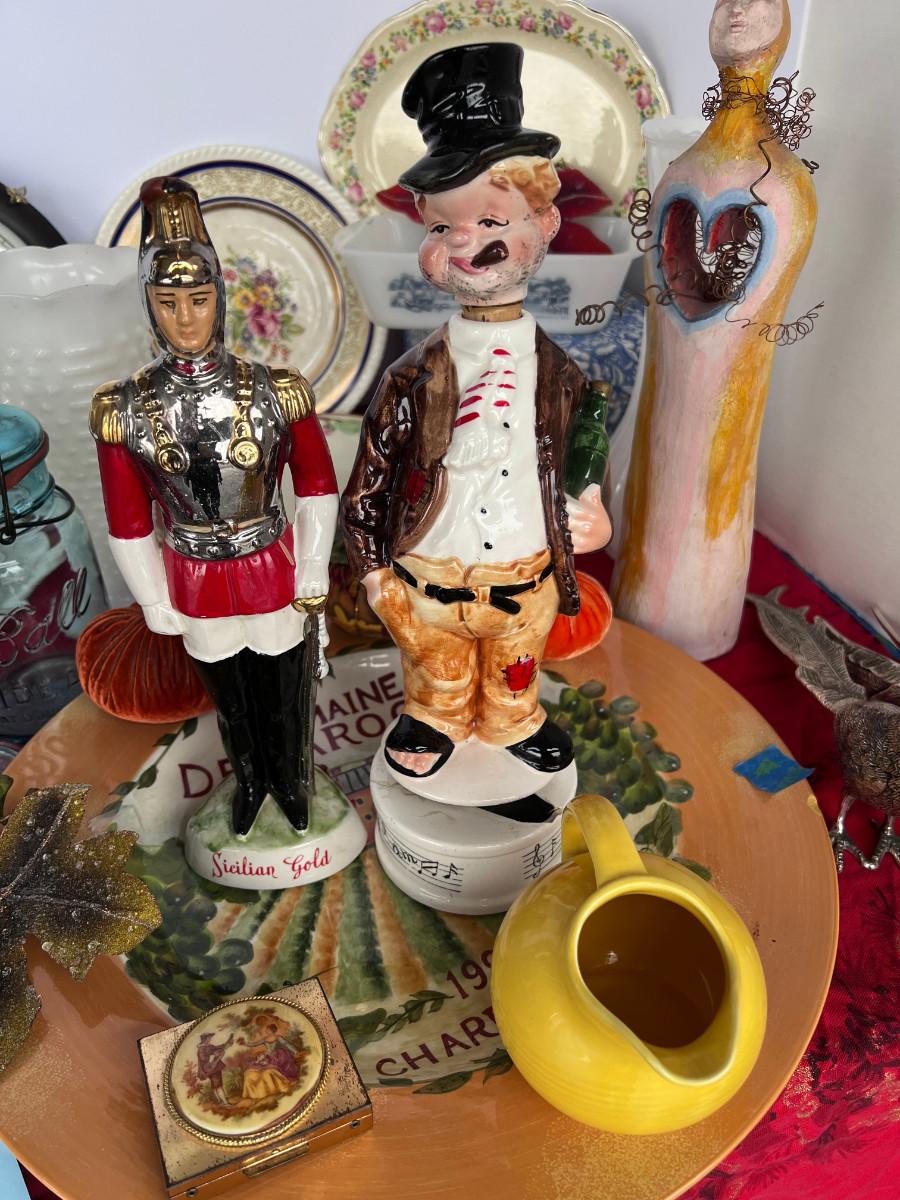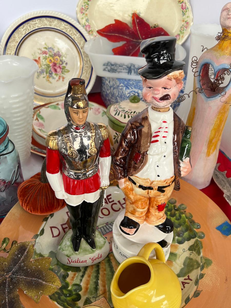 Music box is cracked has a cork head that pulls off, large pasta plate has a chip, Vintage plates, collectibles vintage bottles This lot can be shipped but be aware heavy and breakable so will be double boxed.