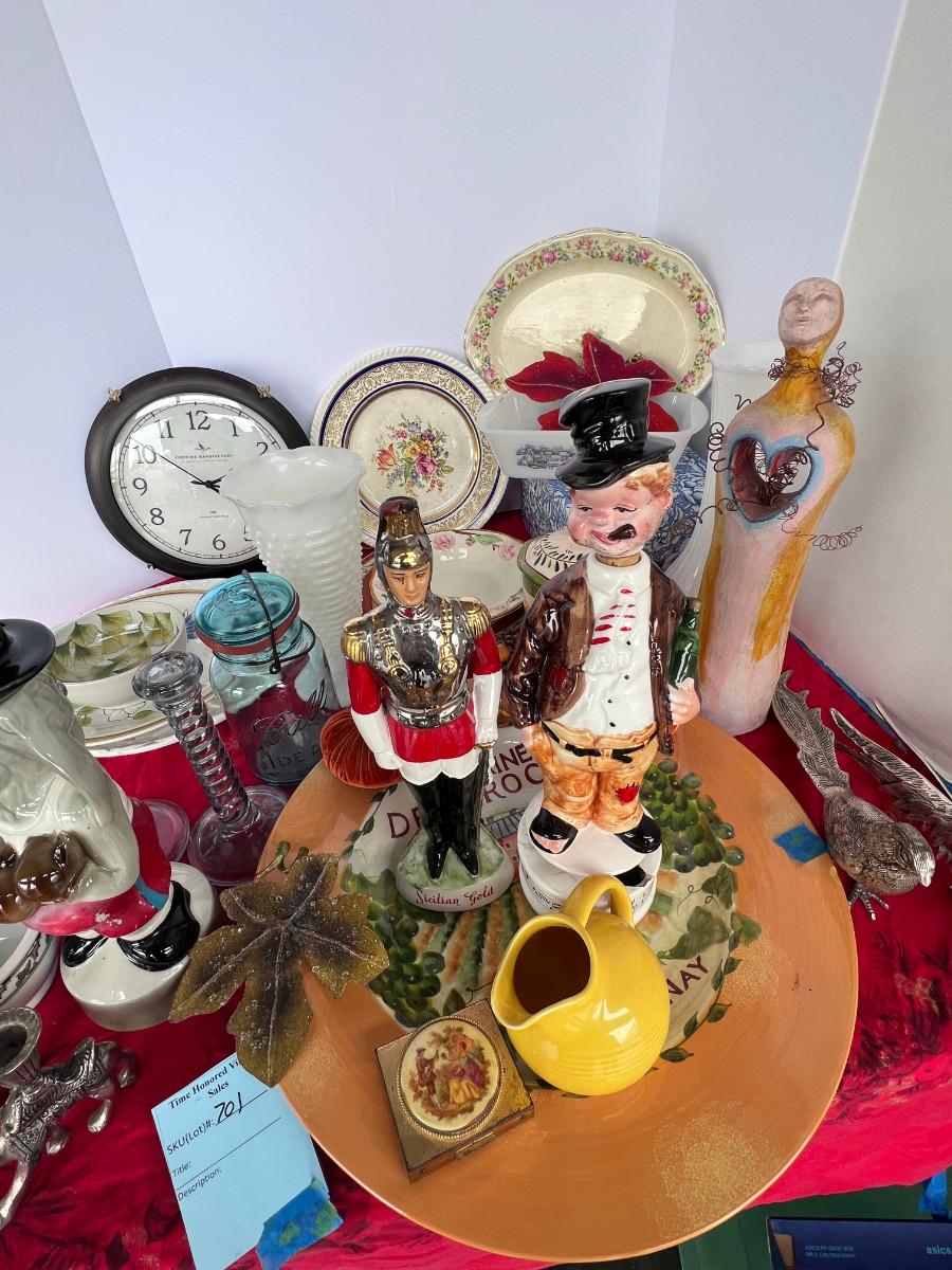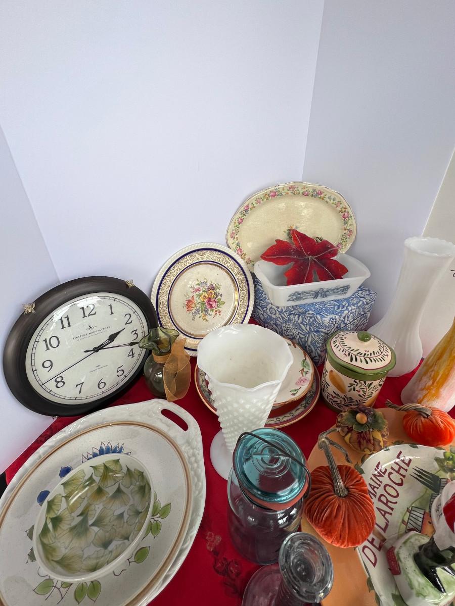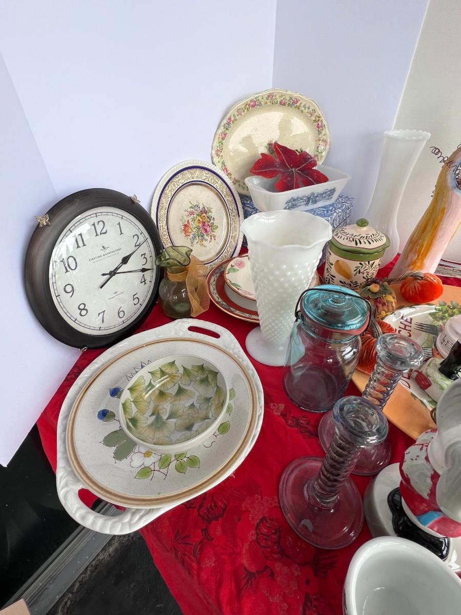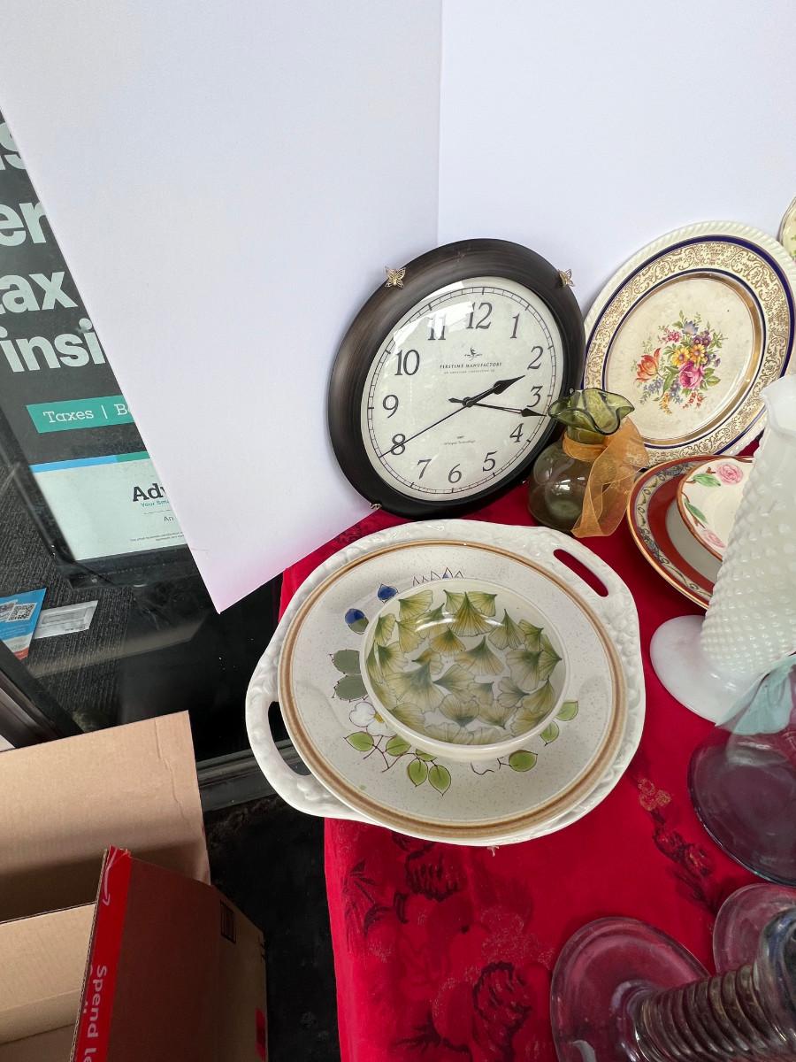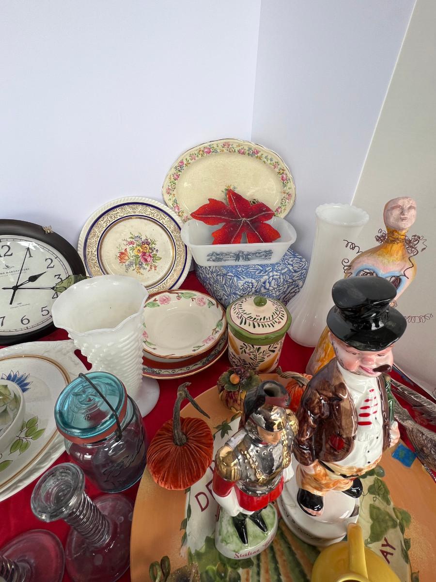 Music box is cracked has a cork head that pulls off, large pasta plate has a chip, Vintage plates, collectibles vintage bottles This lot can be shipped but be aware heavy and breakable so will be double boxed.
