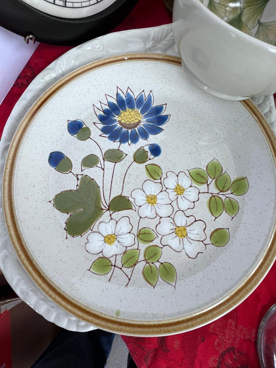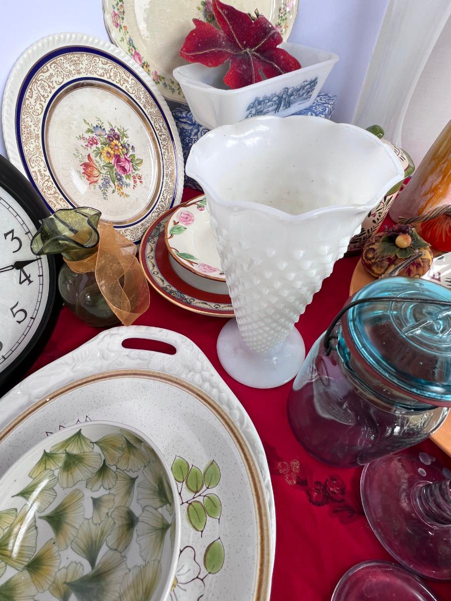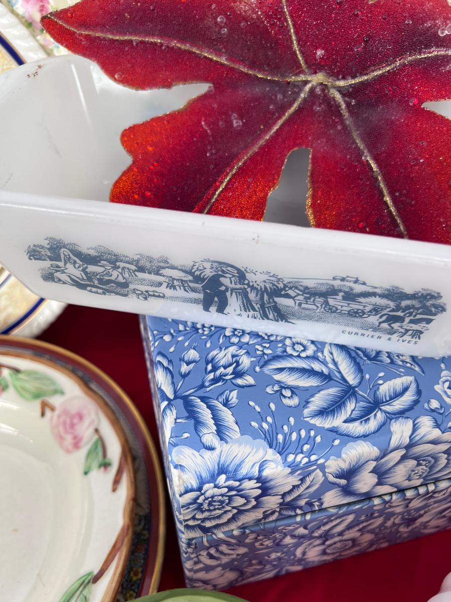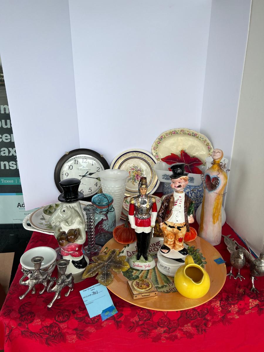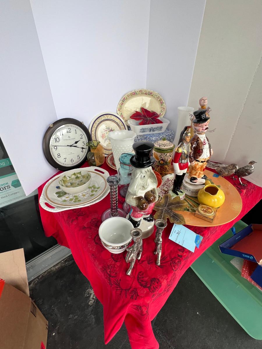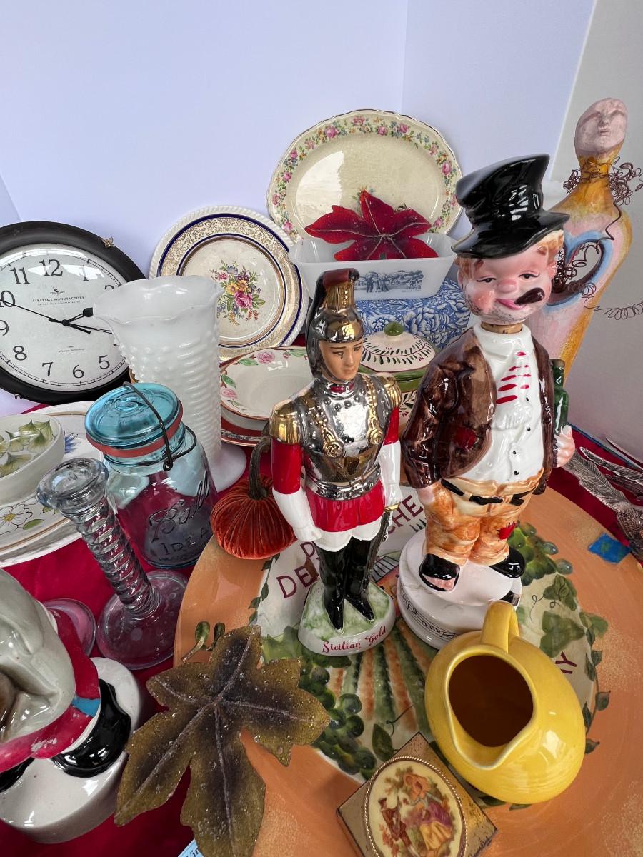 Music box is cracked has a cork head that pulls off, large pasta plate has a chip, Vintage plates, collectibles vintage bottles This lot can be shipped but be aware heavy and breakable so will be double boxed.