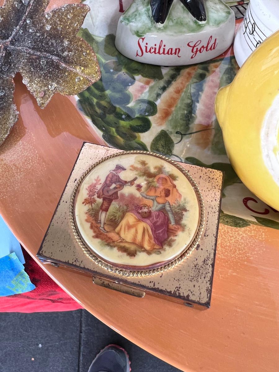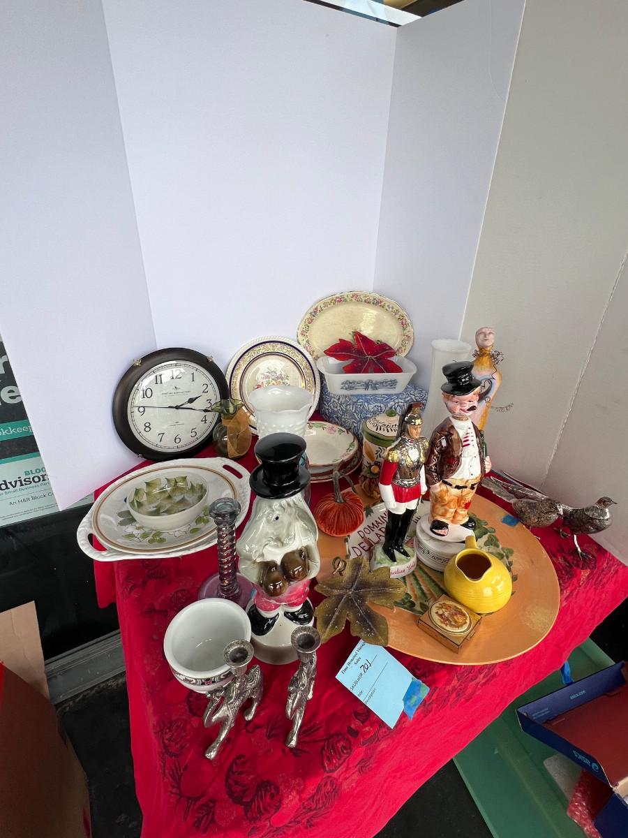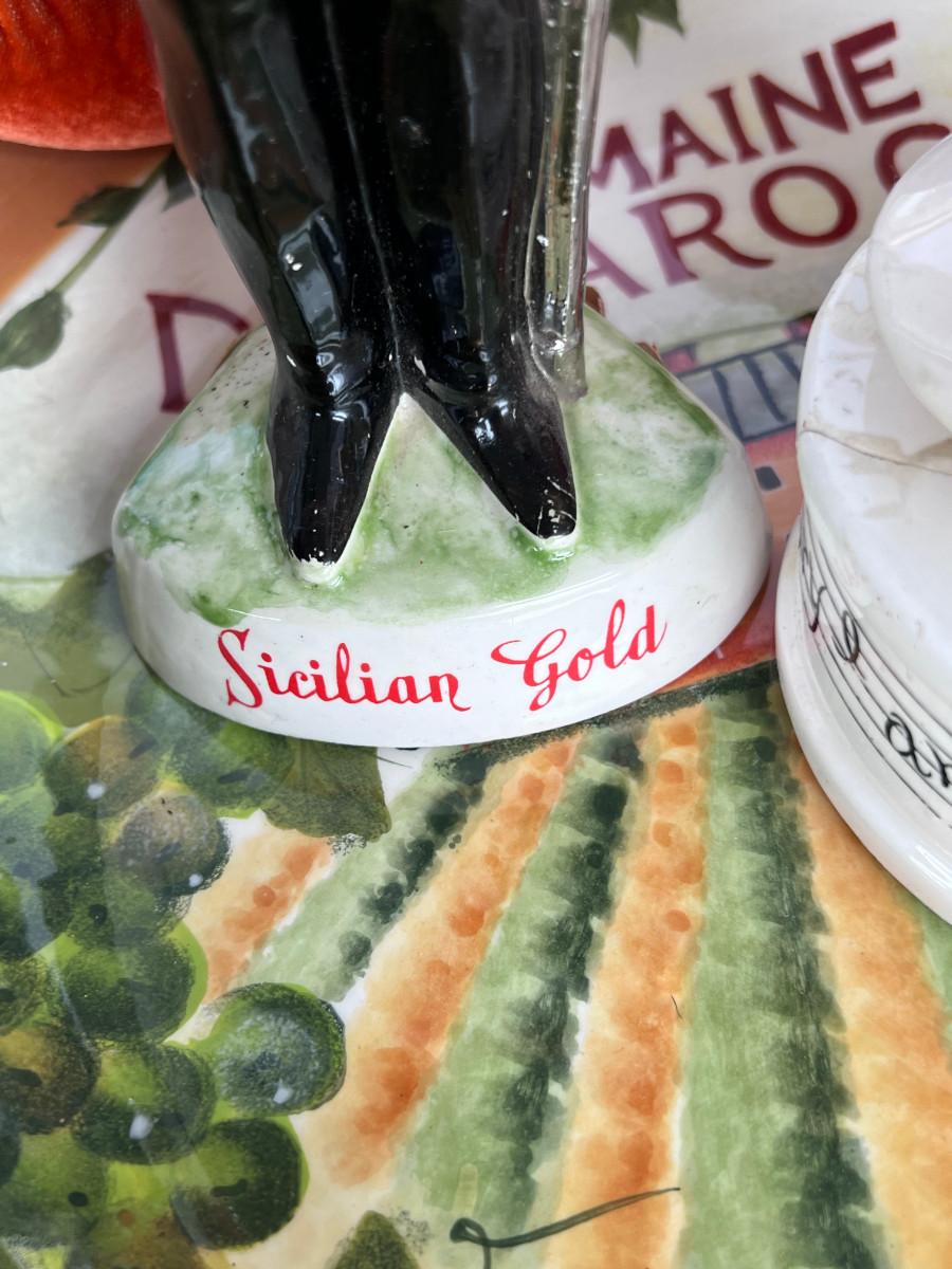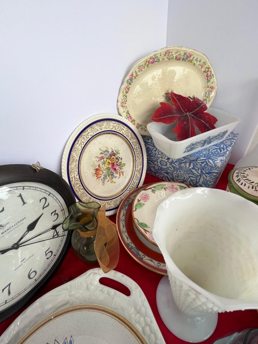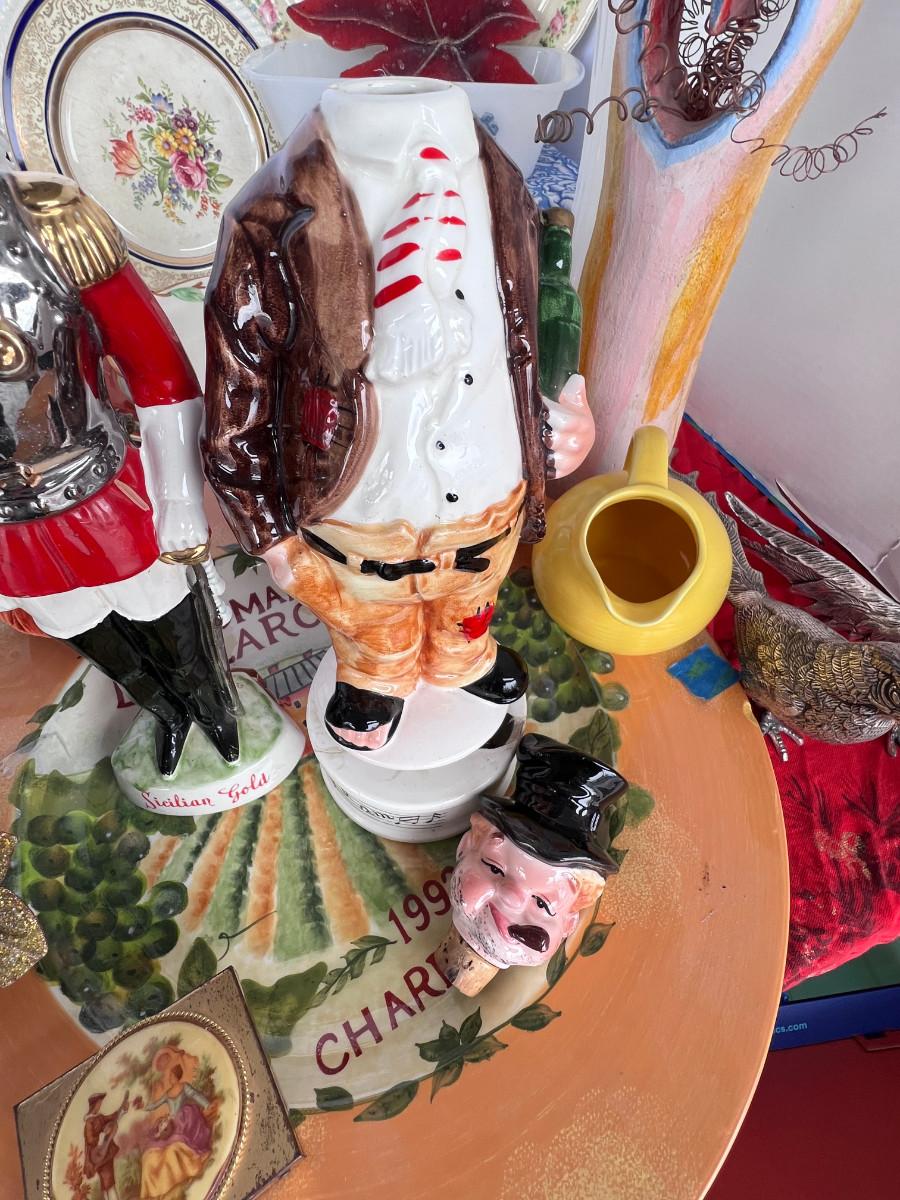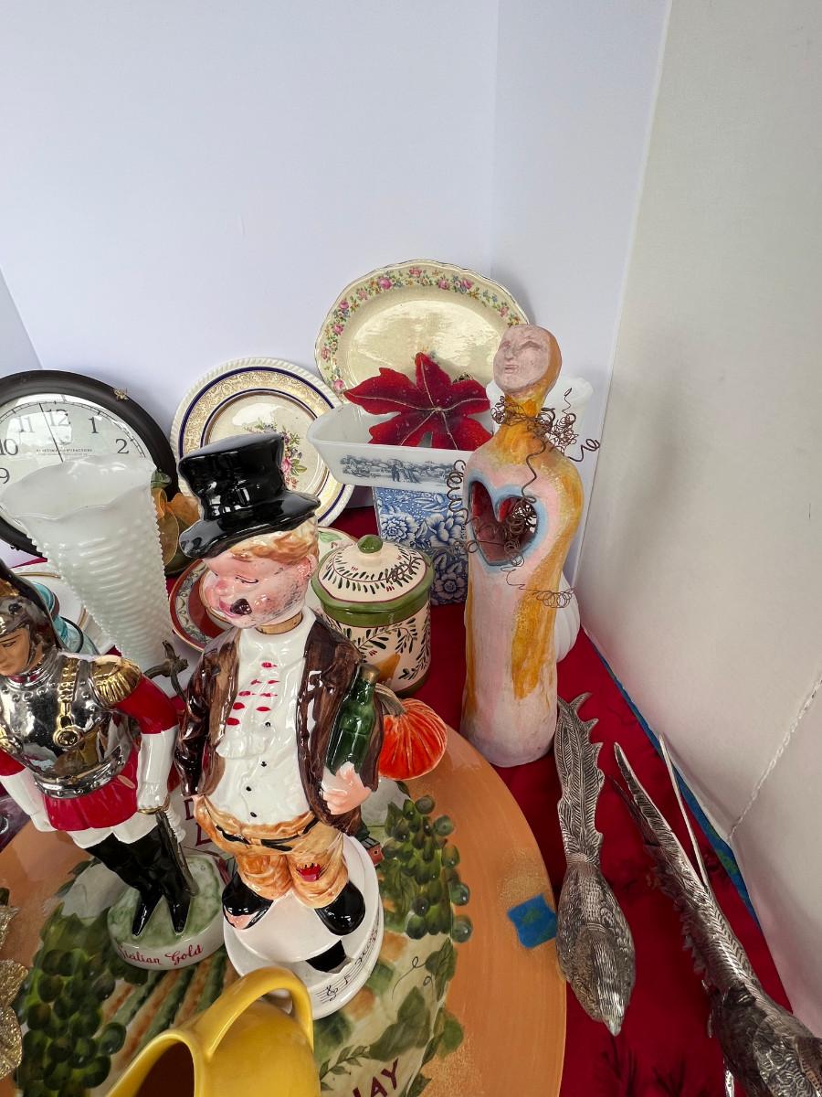 Music box is cracked has a cork head that pulls off, large pasta plate has a chip, Vintage plates, collectibles vintage bottles This lot can be shipped but be aware heavy and breakable so will be double boxed.