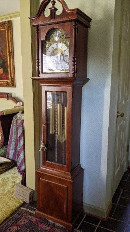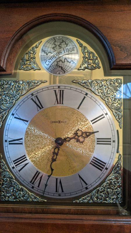 Modern grandfather clock made by Howard Miller is in pristine condition. A retirement gift from Nationwide to Mr. Wilmoth, the owner never wound it! Tempus fugit dial.