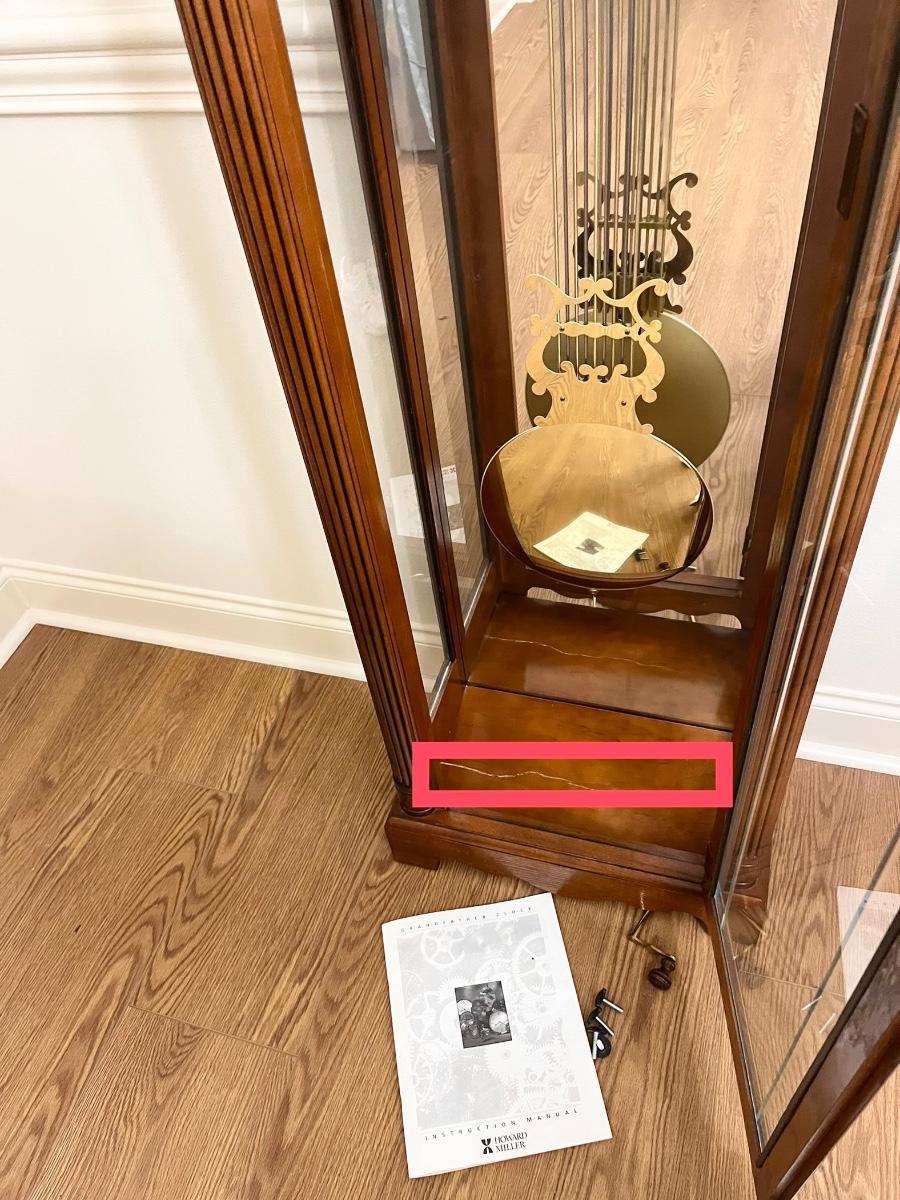 Bottom shelf cracked & broken as seen in picture ~ Keeps time, but does not always chime on the hour. Its fickle, sometimes it don't and sometimes it does.... It does however, chime at 15, 30 and 45.. ~ 78”H x 19” W x 11” D