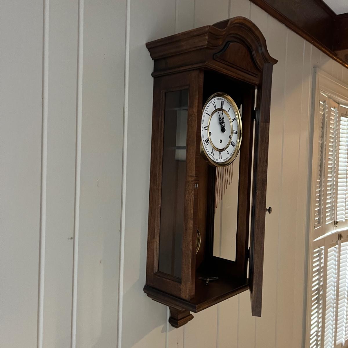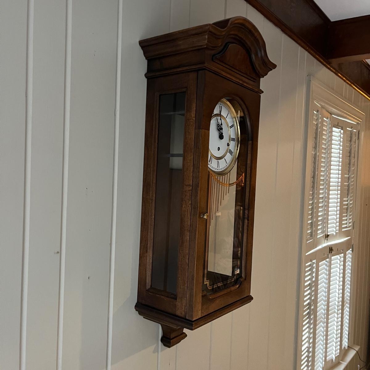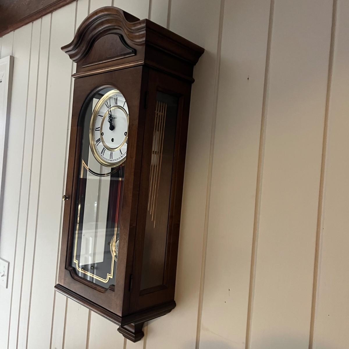 Lot includes a Howard Miller wall mount clock with key. Clock is in a solid wood and glass case. Case measures 13” x 8” x 33”H. Clock is currently working on wall and keeping time, though may need recalibrated after moving it. Clock will need to be removed from wall by winning bidder.