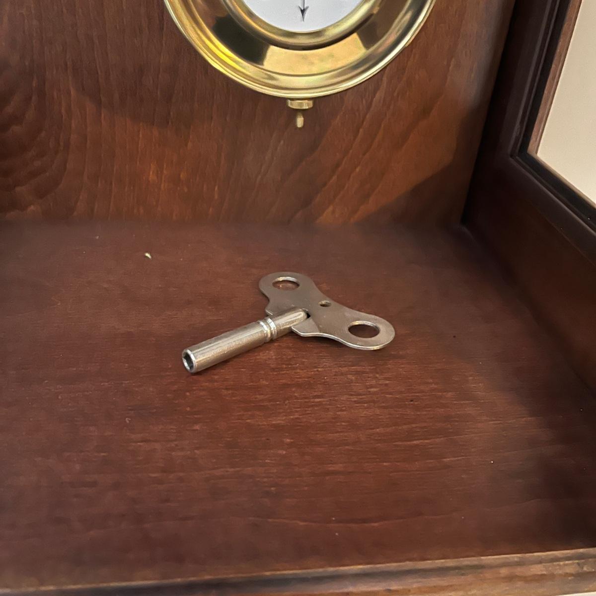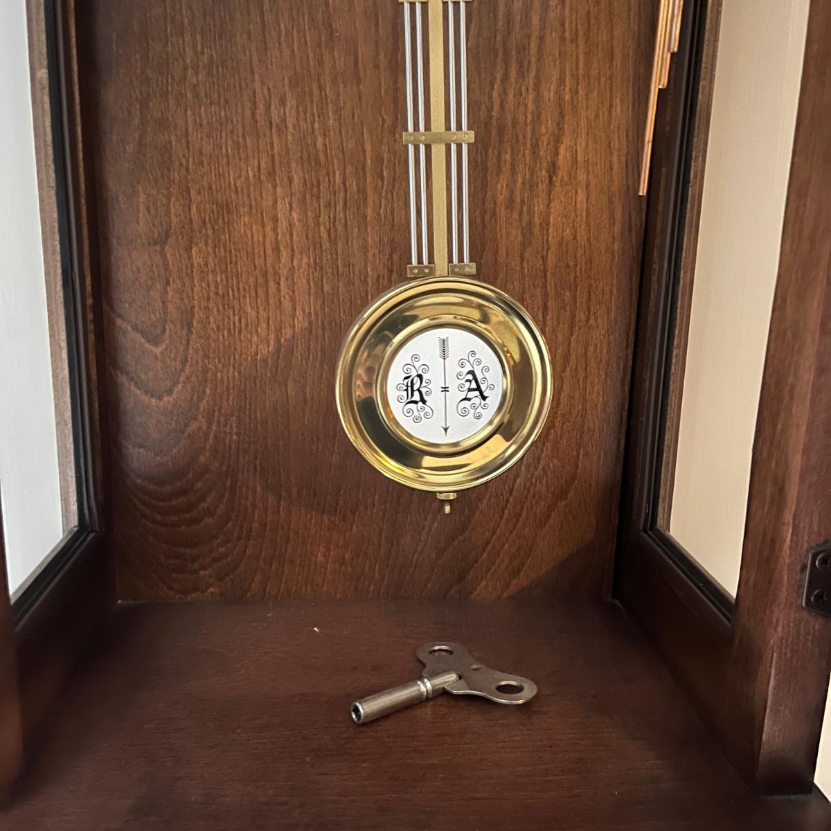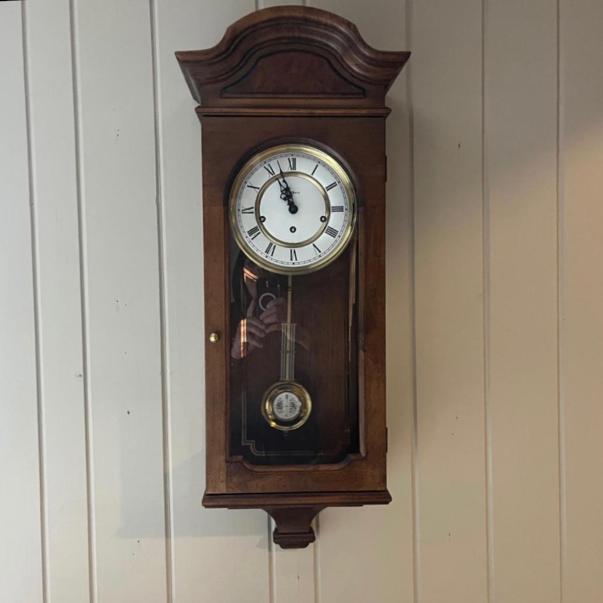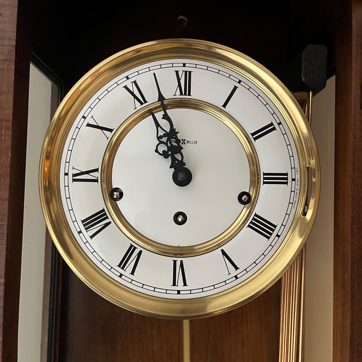 Lot includes a Howard Miller wall mount clock with key. Clock is in a solid wood and glass case. Case measures 13” x 8” x 33”H. Clock is currently working on wall and keeping time, though may need recalibrated after moving it. Clock will need to be removed from wall by winning bidder.