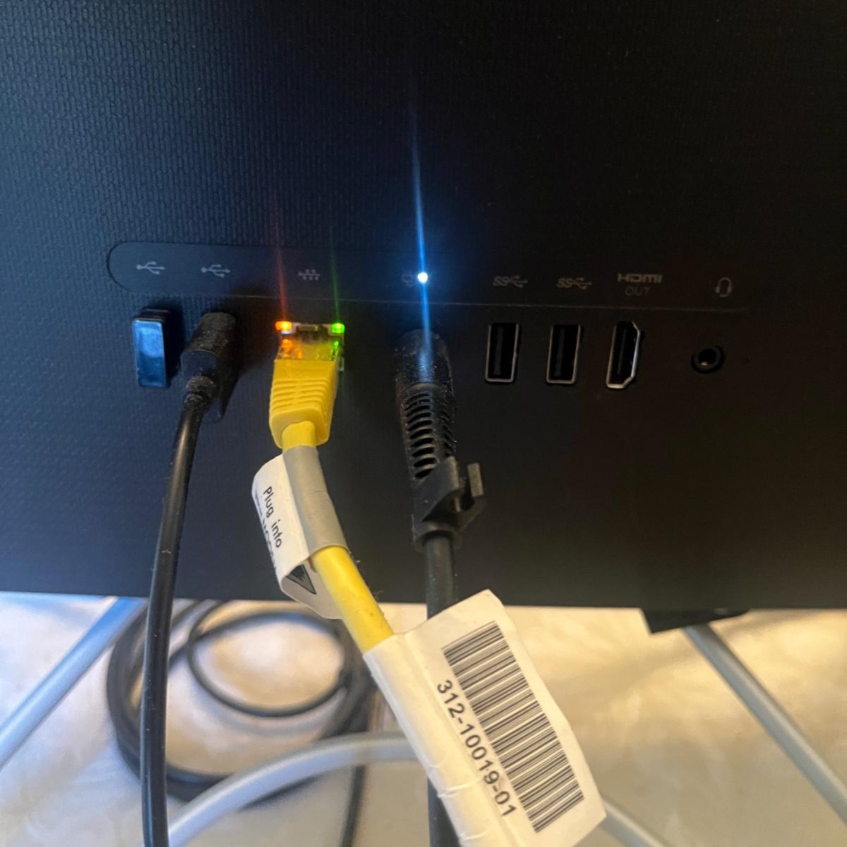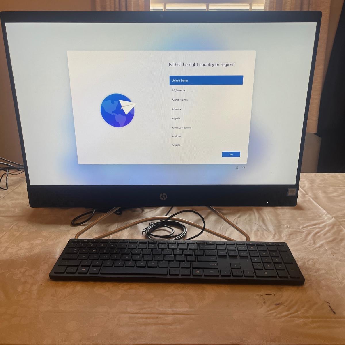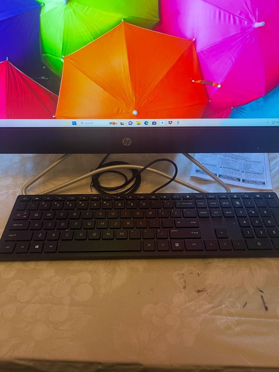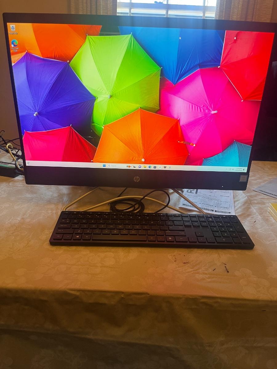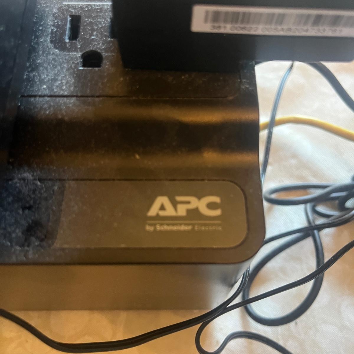Lot features a HP all in one computer with 24” screen, wireless mouse and USB keyboard. Lot also includes an APC UPS battery backup and a Linksys router. All items powered on when plugged in.