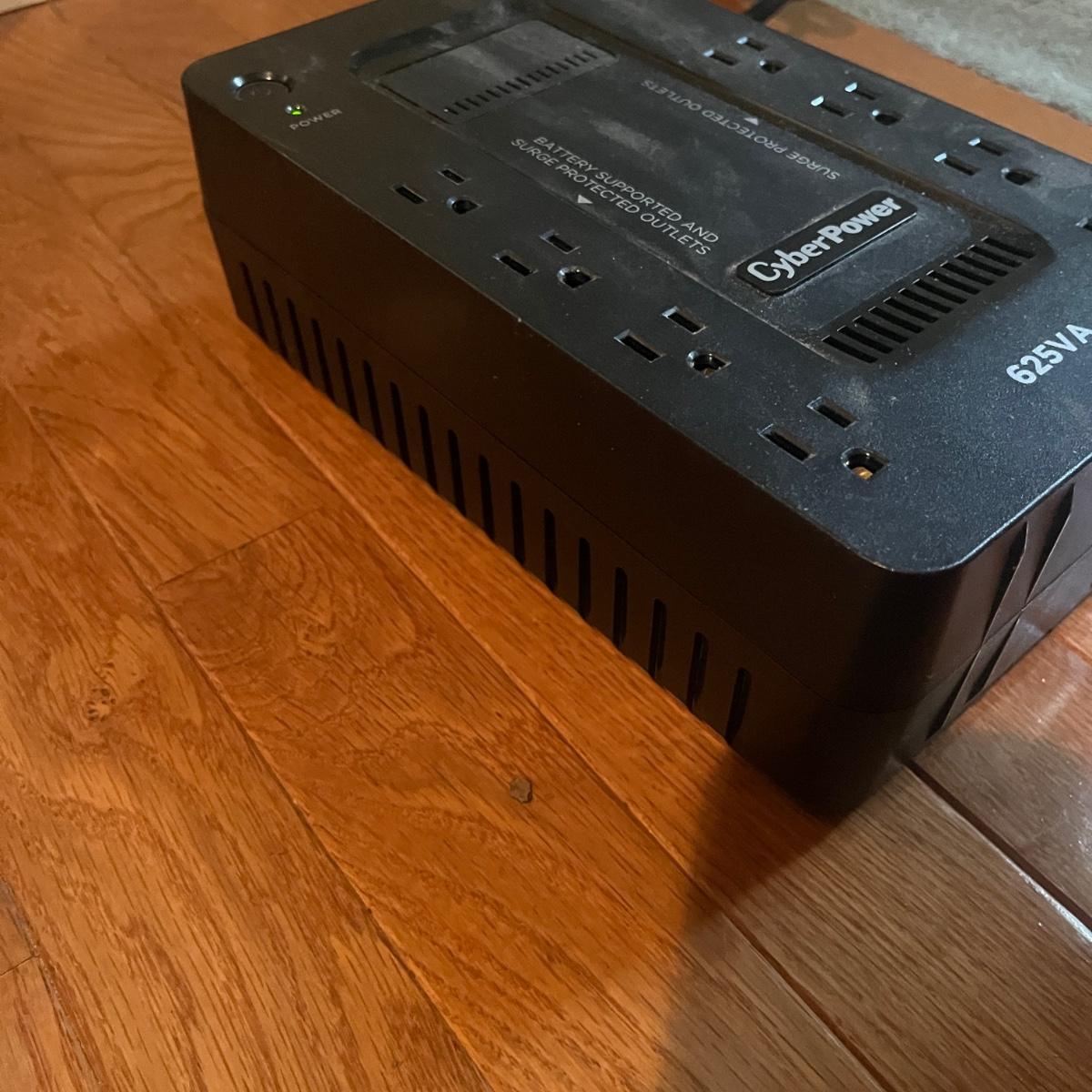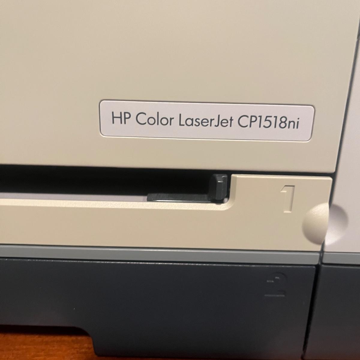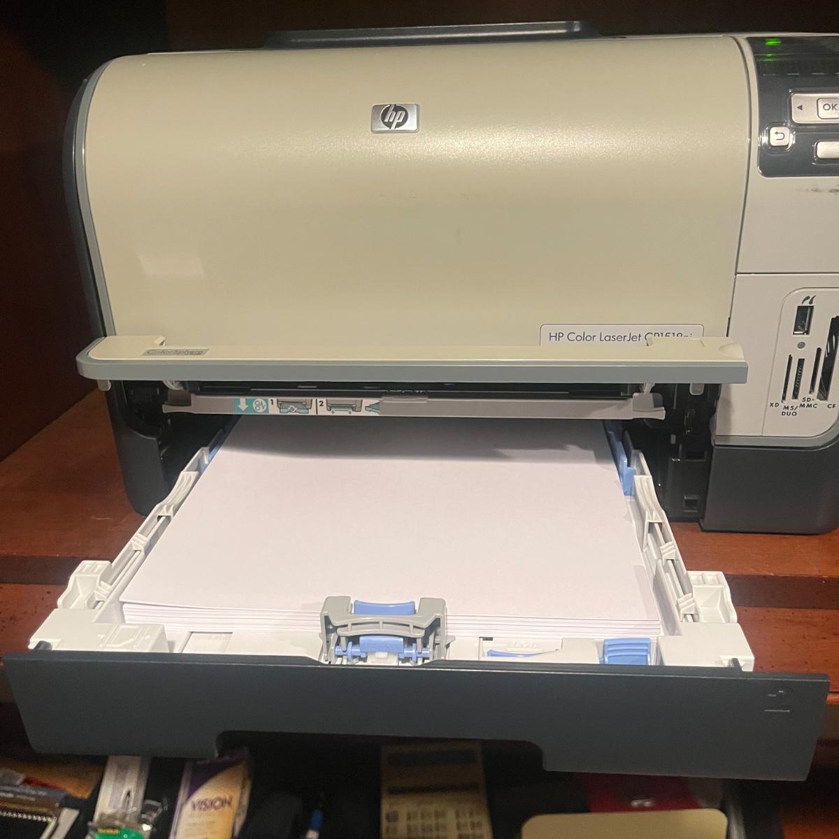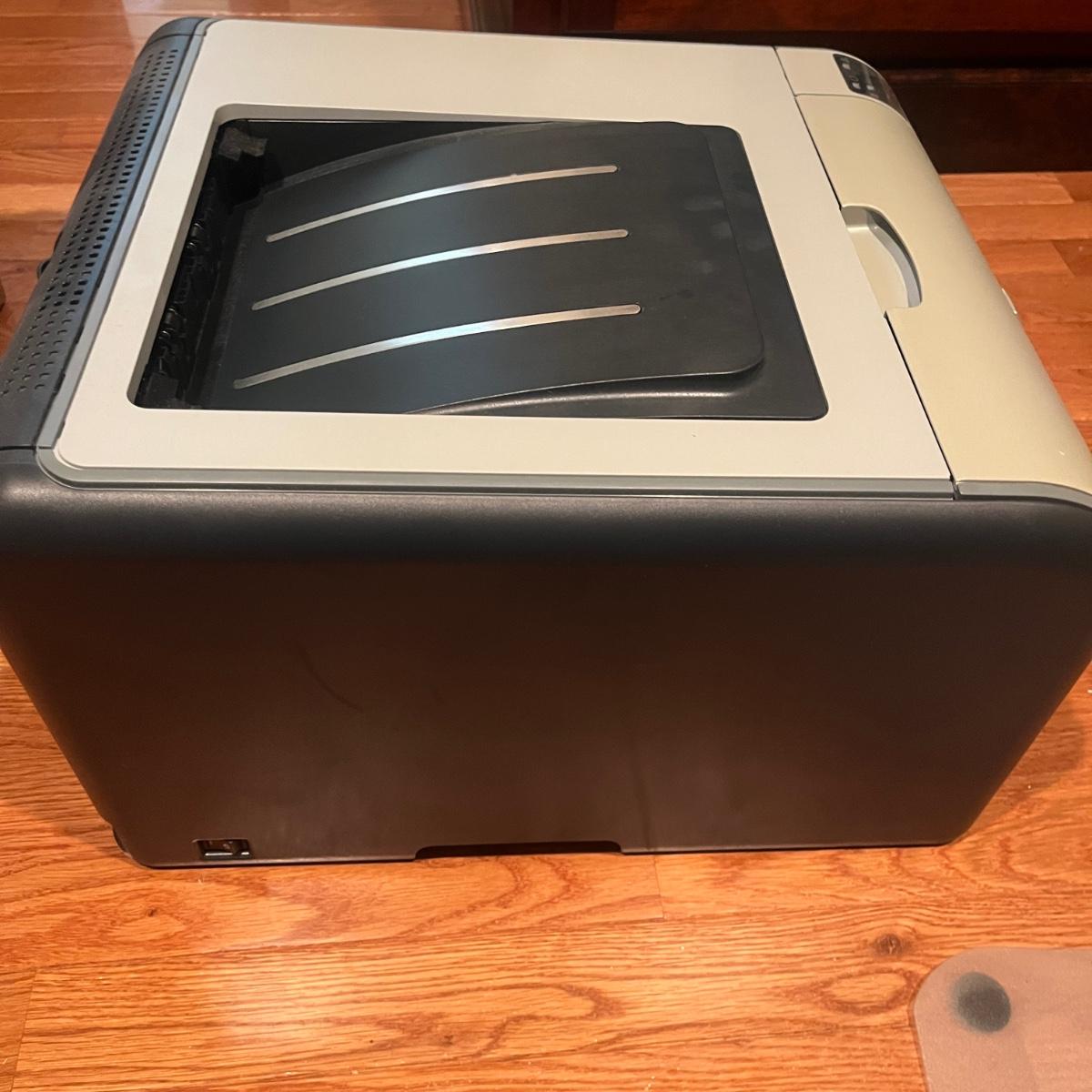Lot includes a HP color laserjet printer, Cyberpower surge protector battery backup, assortment of paper and ink. Printer and UPS powered on when plugged in. Printer measures 15” x 18” x 10”H.