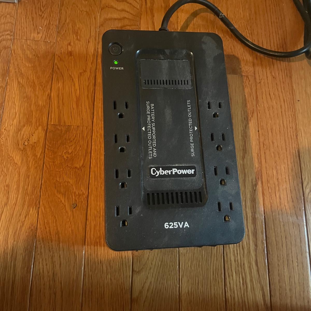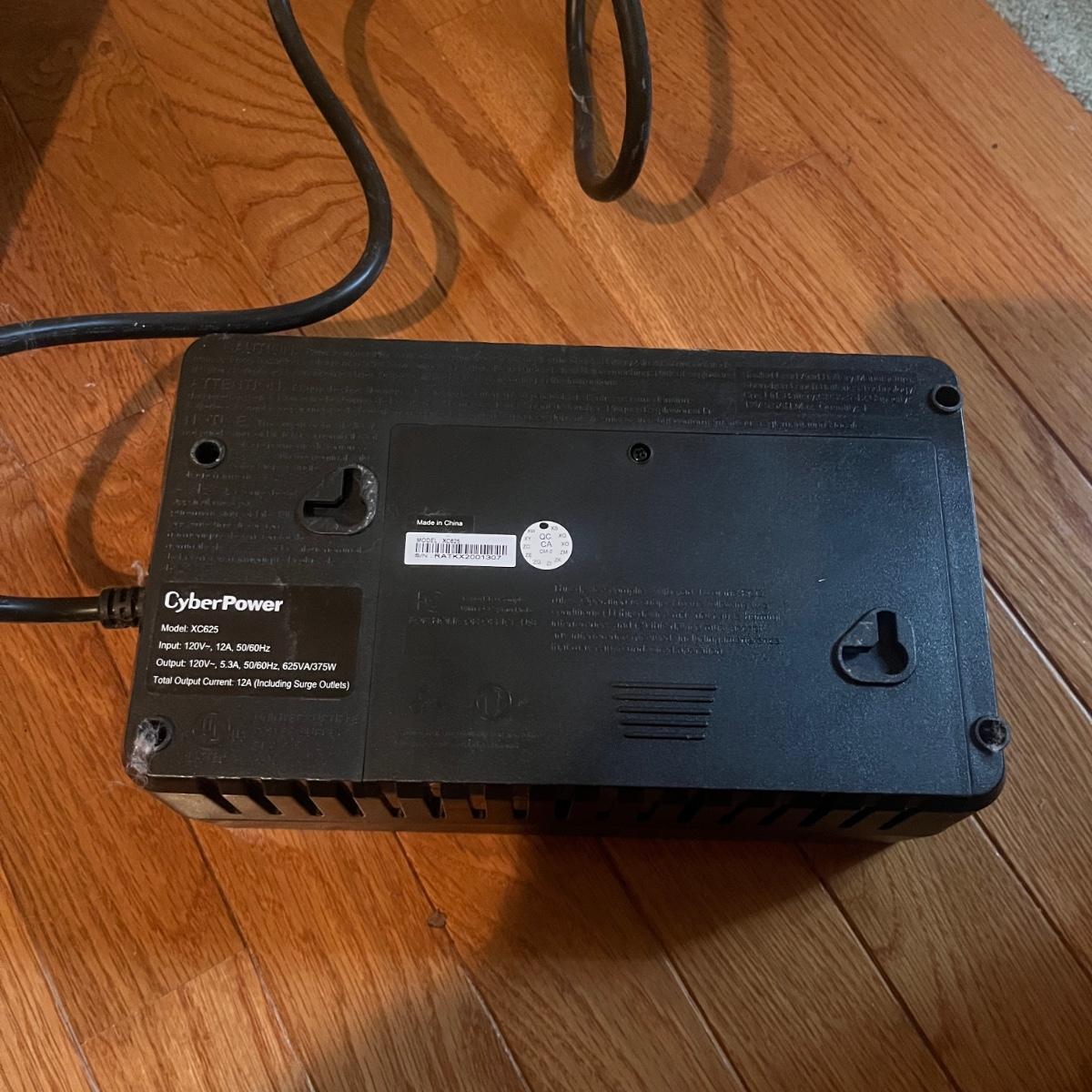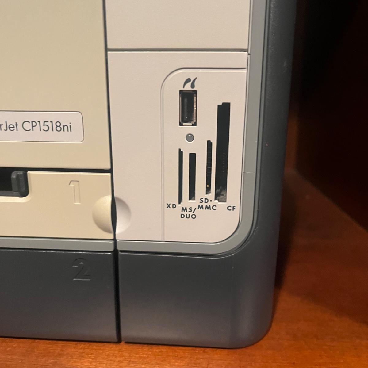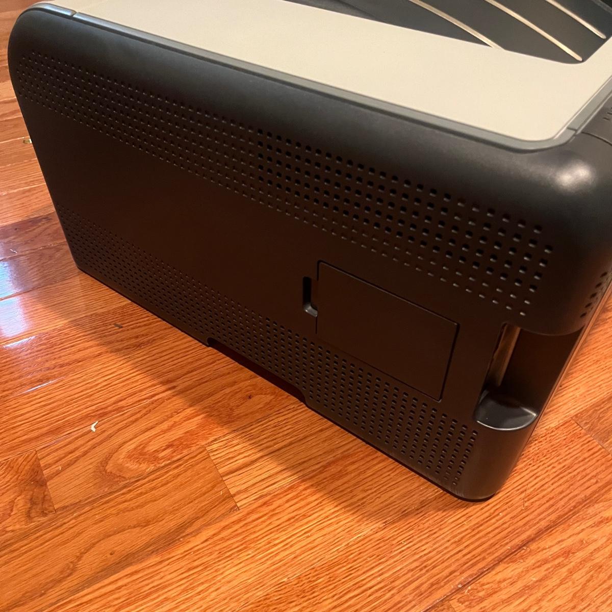 Lot includes a HP color laserjet printer, Cyberpower surge protector battery backup, assortment of paper and ink. Printer and UPS powered on when plugged in. Printer measures 15” x 18” x 10”H.