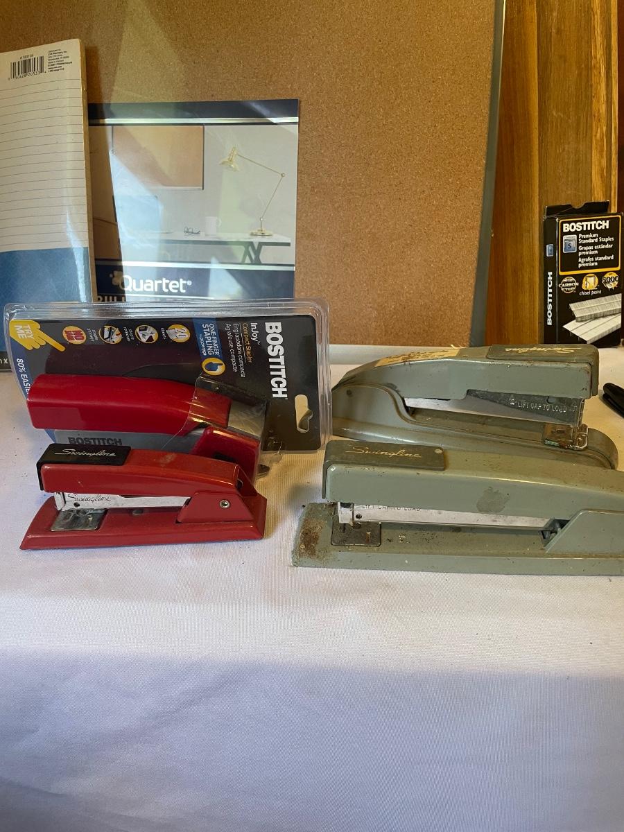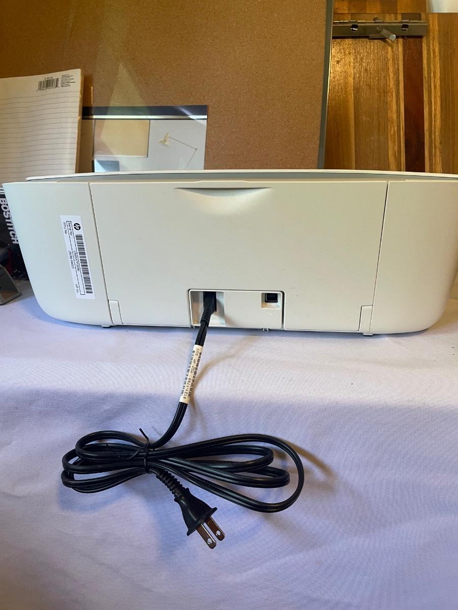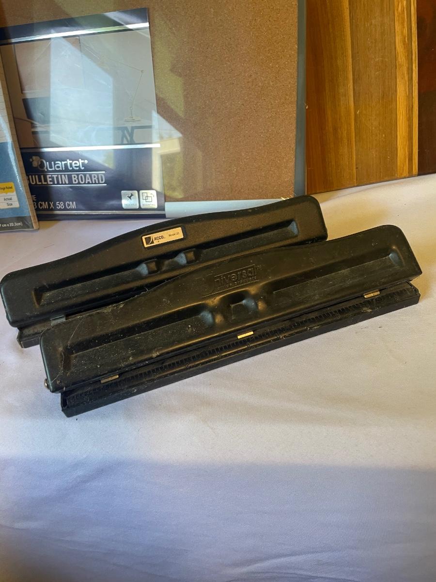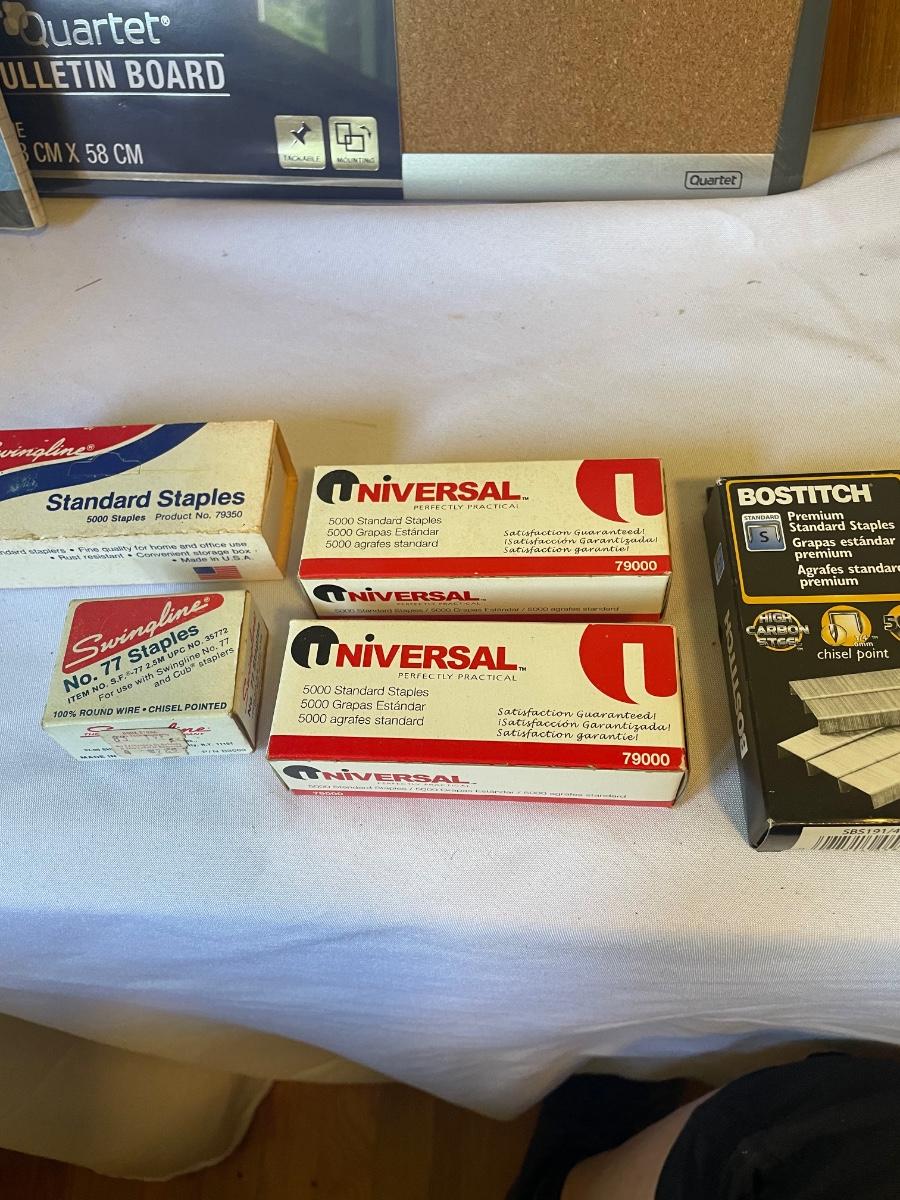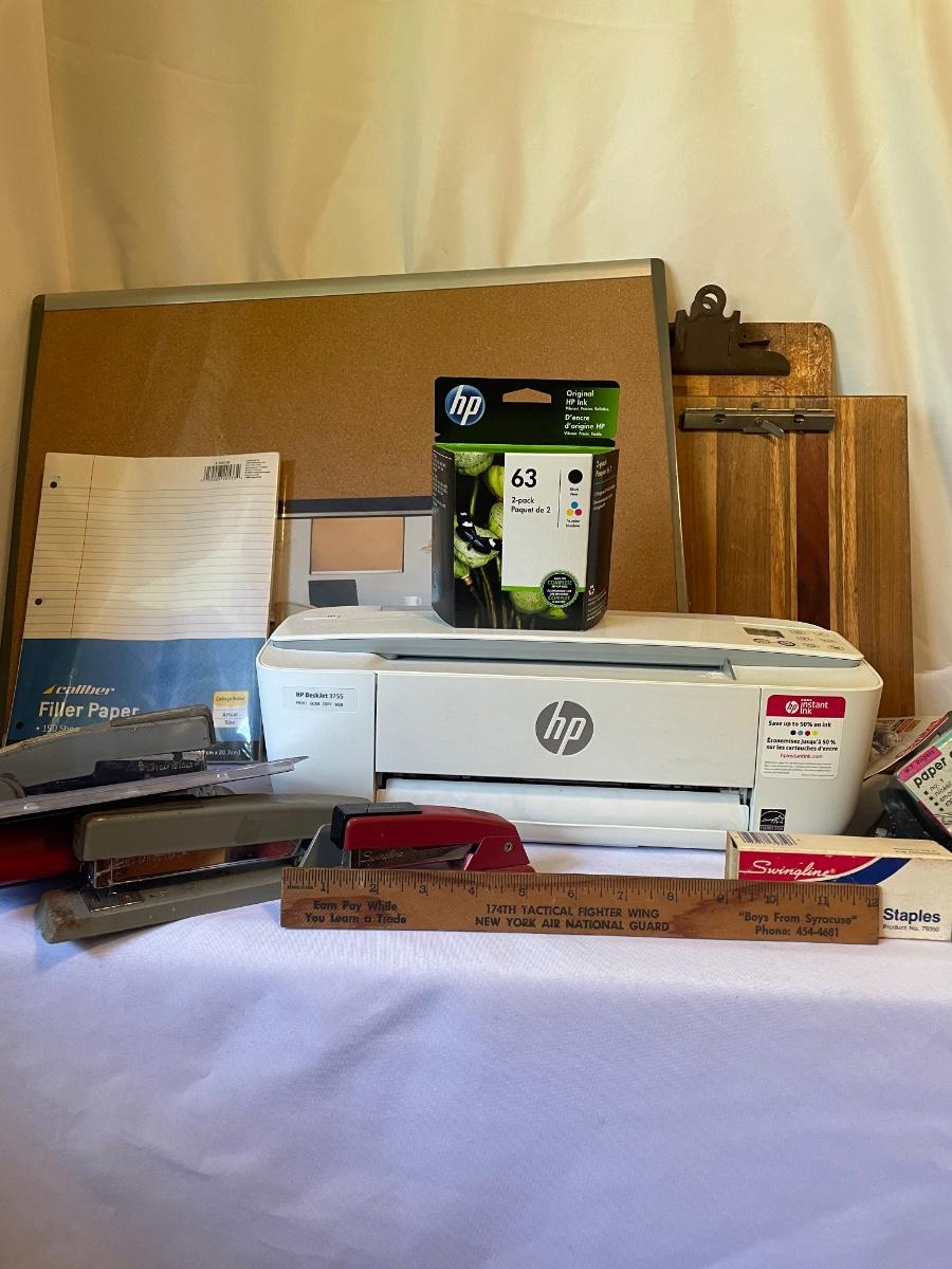 The printer powered on when plugged in and comes with a sealed 2 pack ink. Lot also includes staplers, paper hole punches, 2 wood clipboards, a new bulletin board and more.