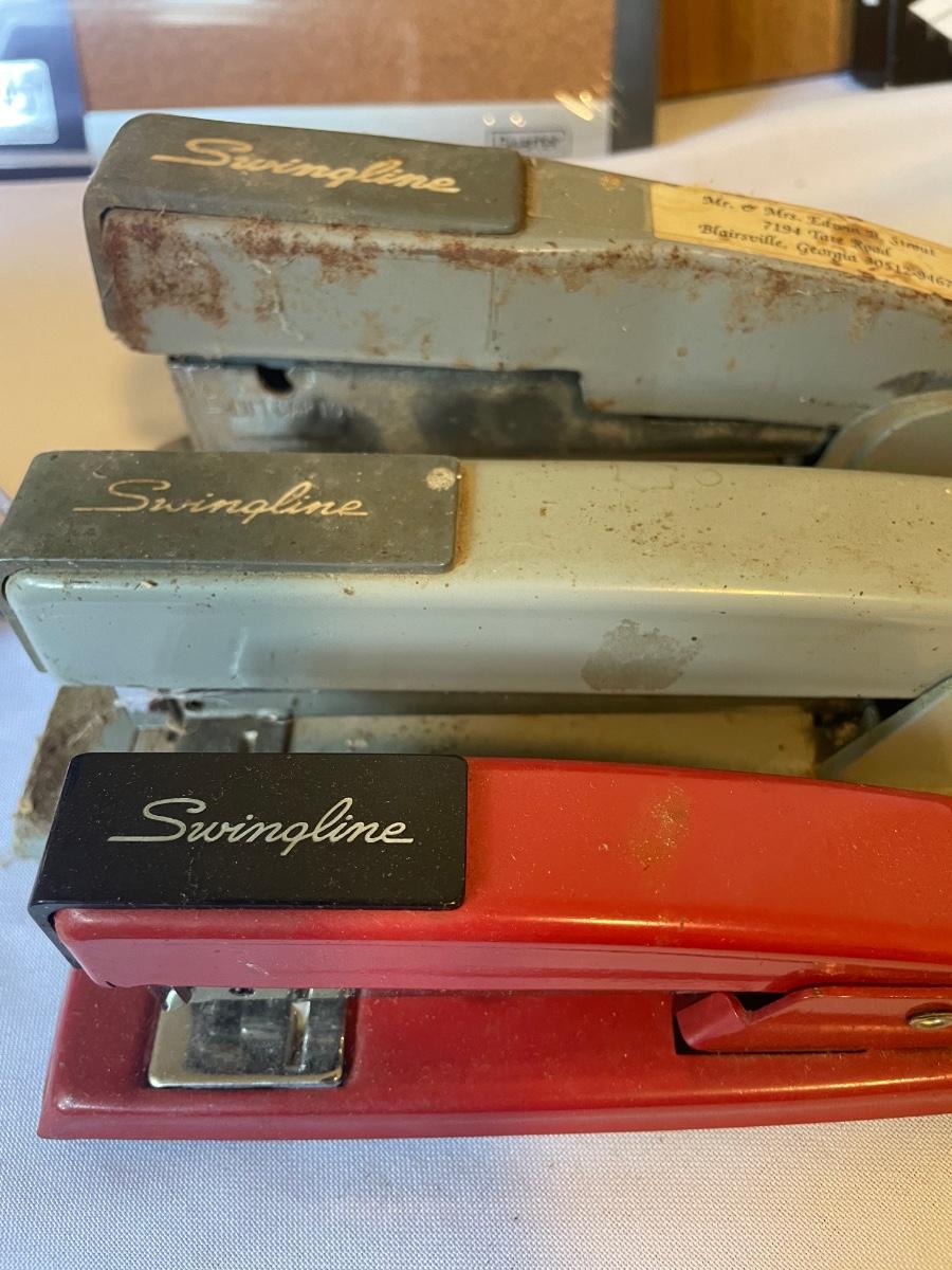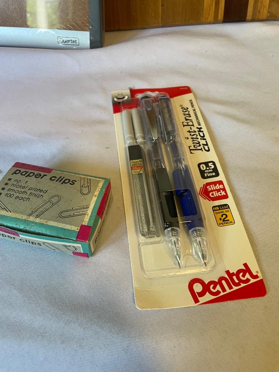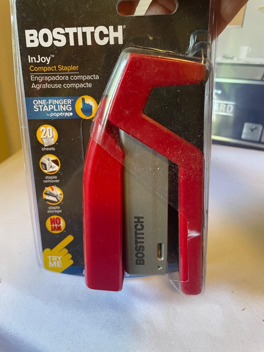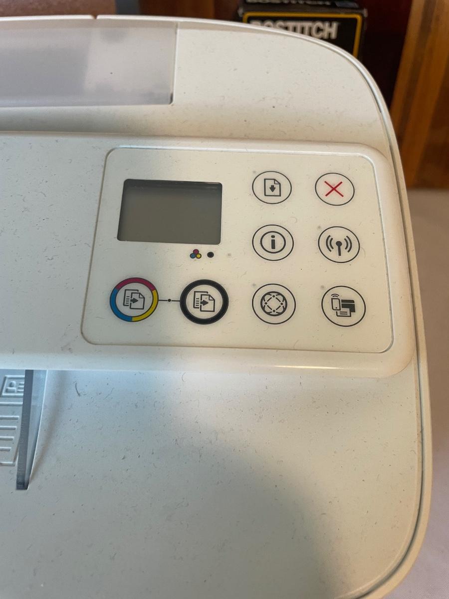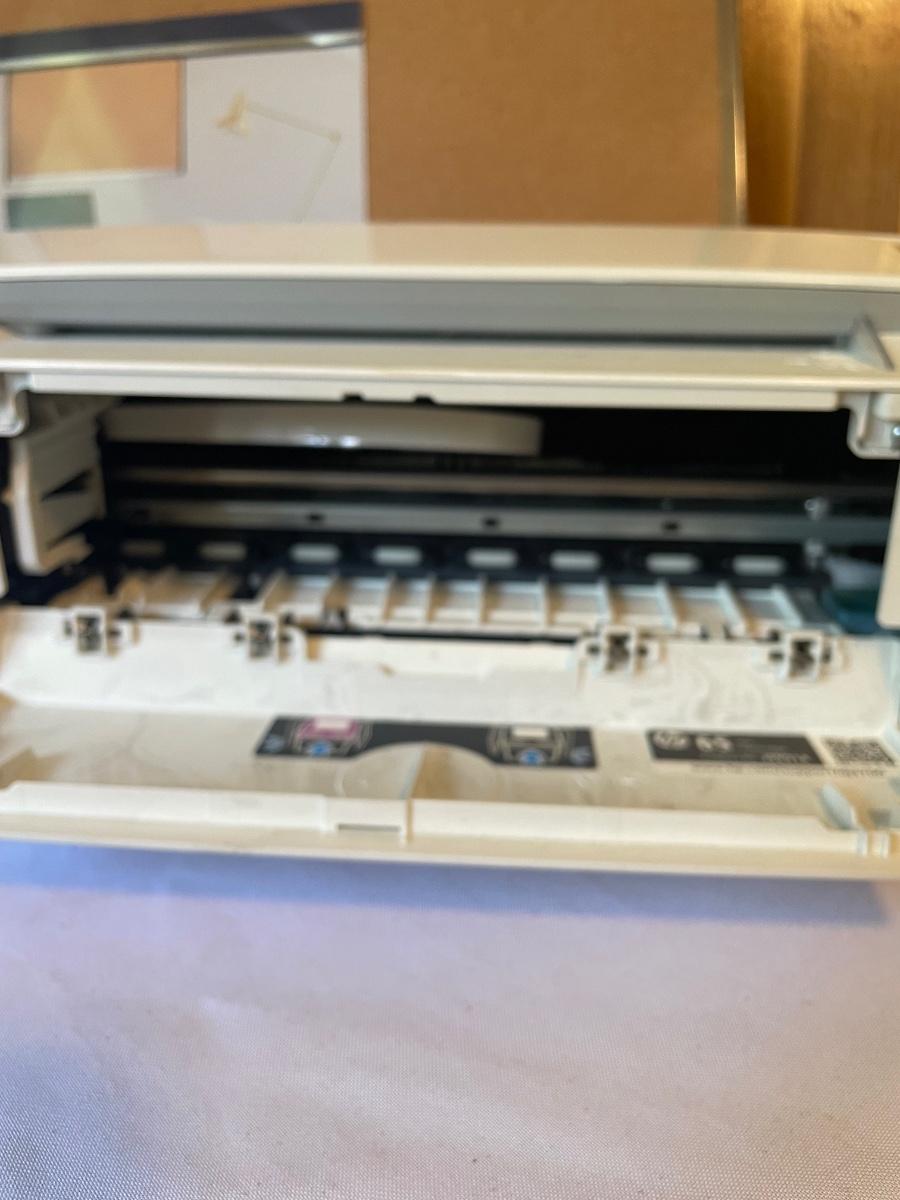 The printer powered on when plugged in and comes with a sealed 2 pack ink. Lot also includes staplers, paper hole punches, 2 wood clipboards, a new bulletin board and more.