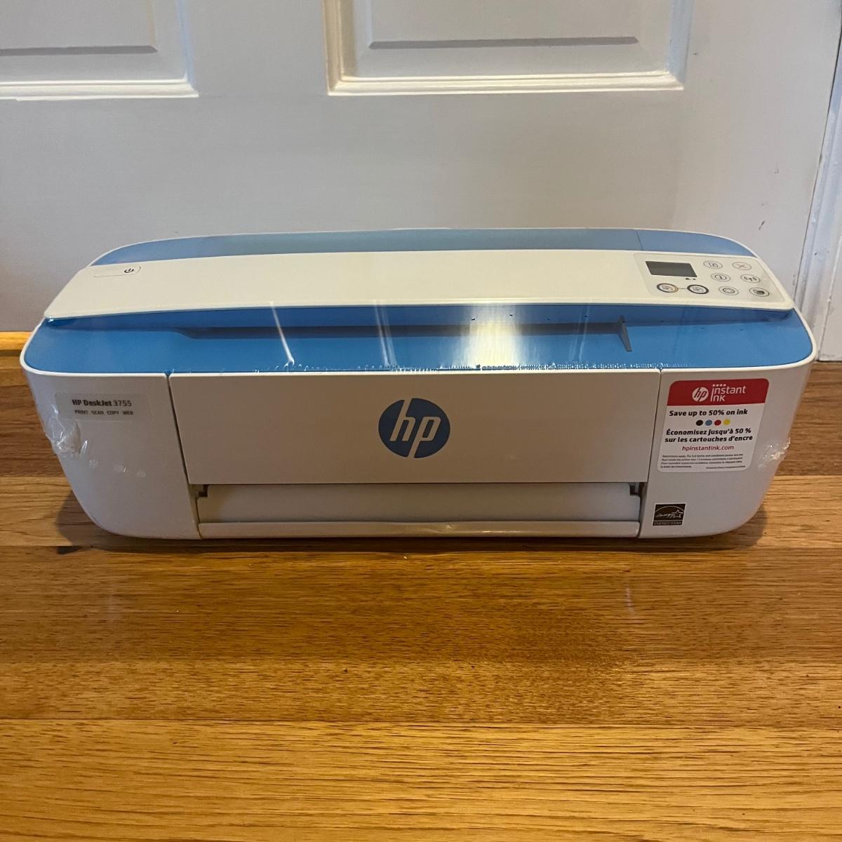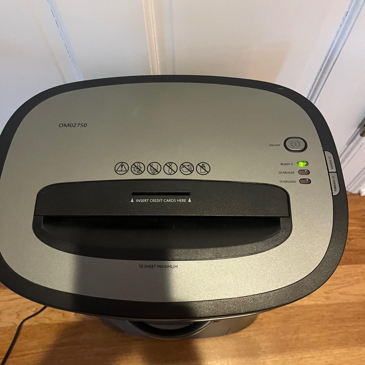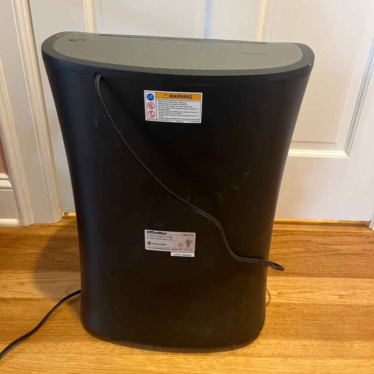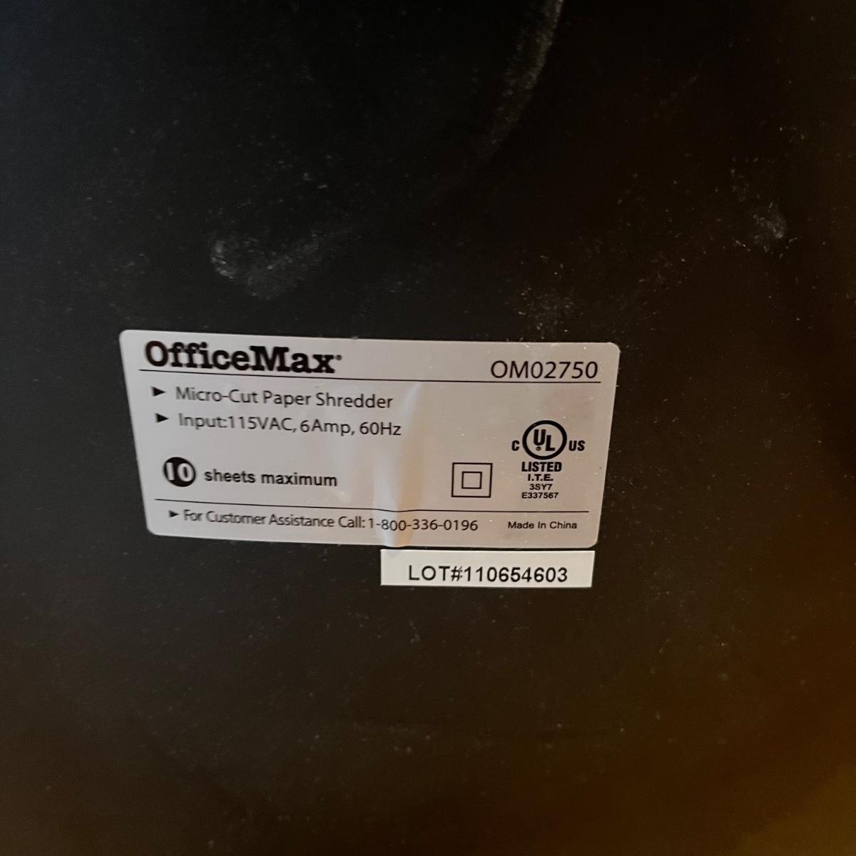 Lot includes an Office Max shredder model # OM02750 and a HP 3755 Deskjet printer. Shredder powered on when plugged in and printer is sealed in plastic so it was not tested. Shredder measures 14.5” x 11.5” x 19.5”H.