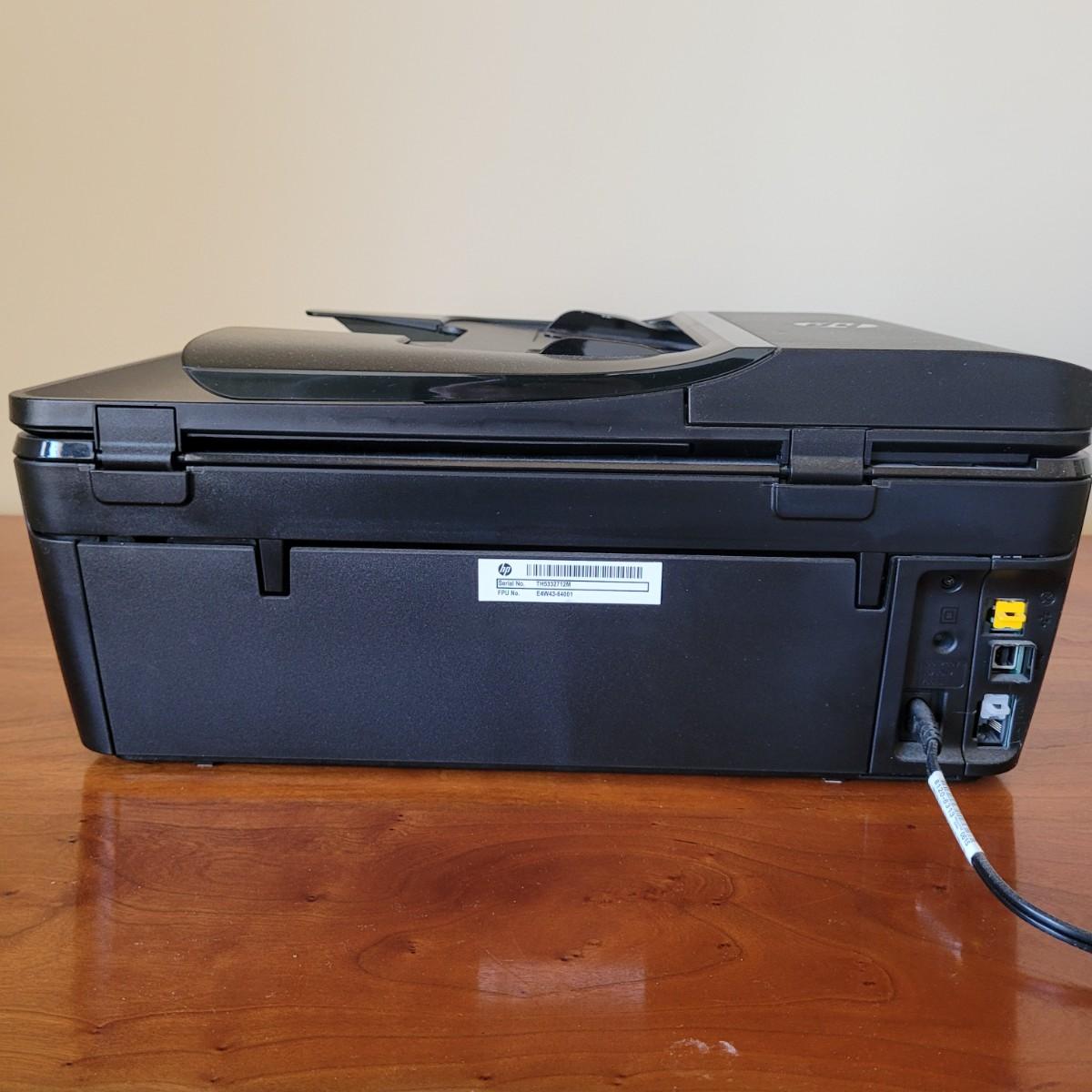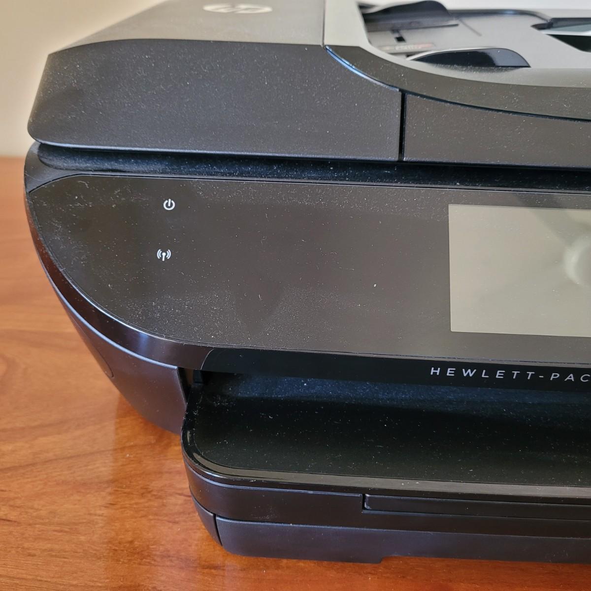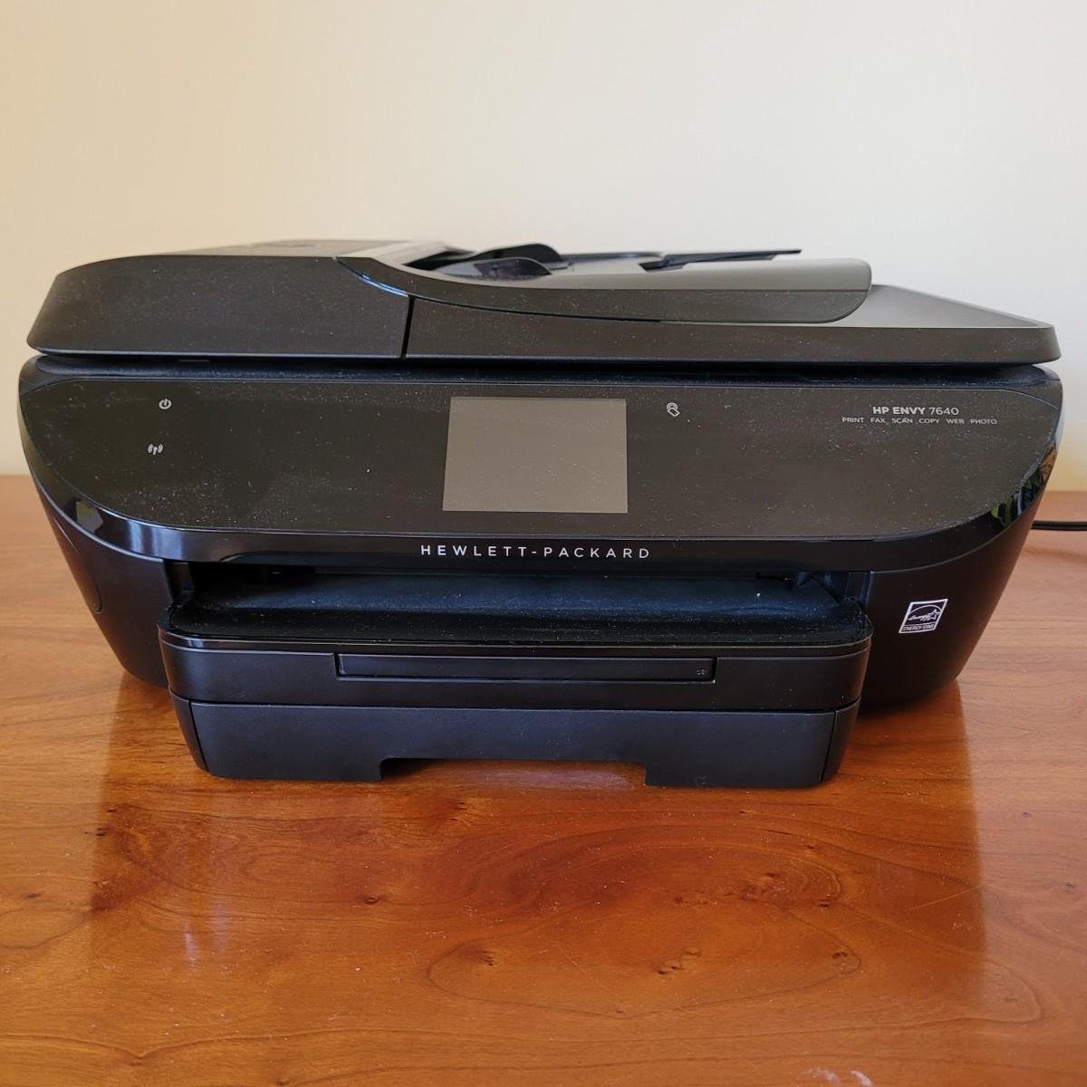 This lot includes an HP brand Envy 7640 printer, Scanner, copier. The printer itself powered on when plugged in and includes some paper in the tray. It measures 18" x 16" x 7"H. Also included are two extra ink cartridges (tricolor and black). Power cord included.