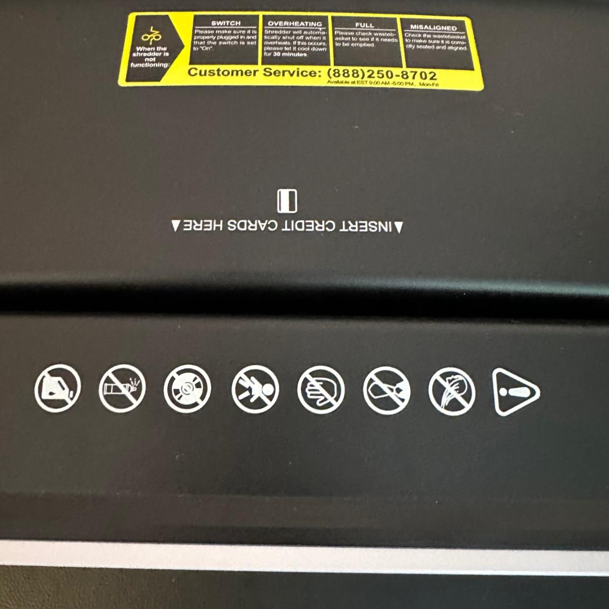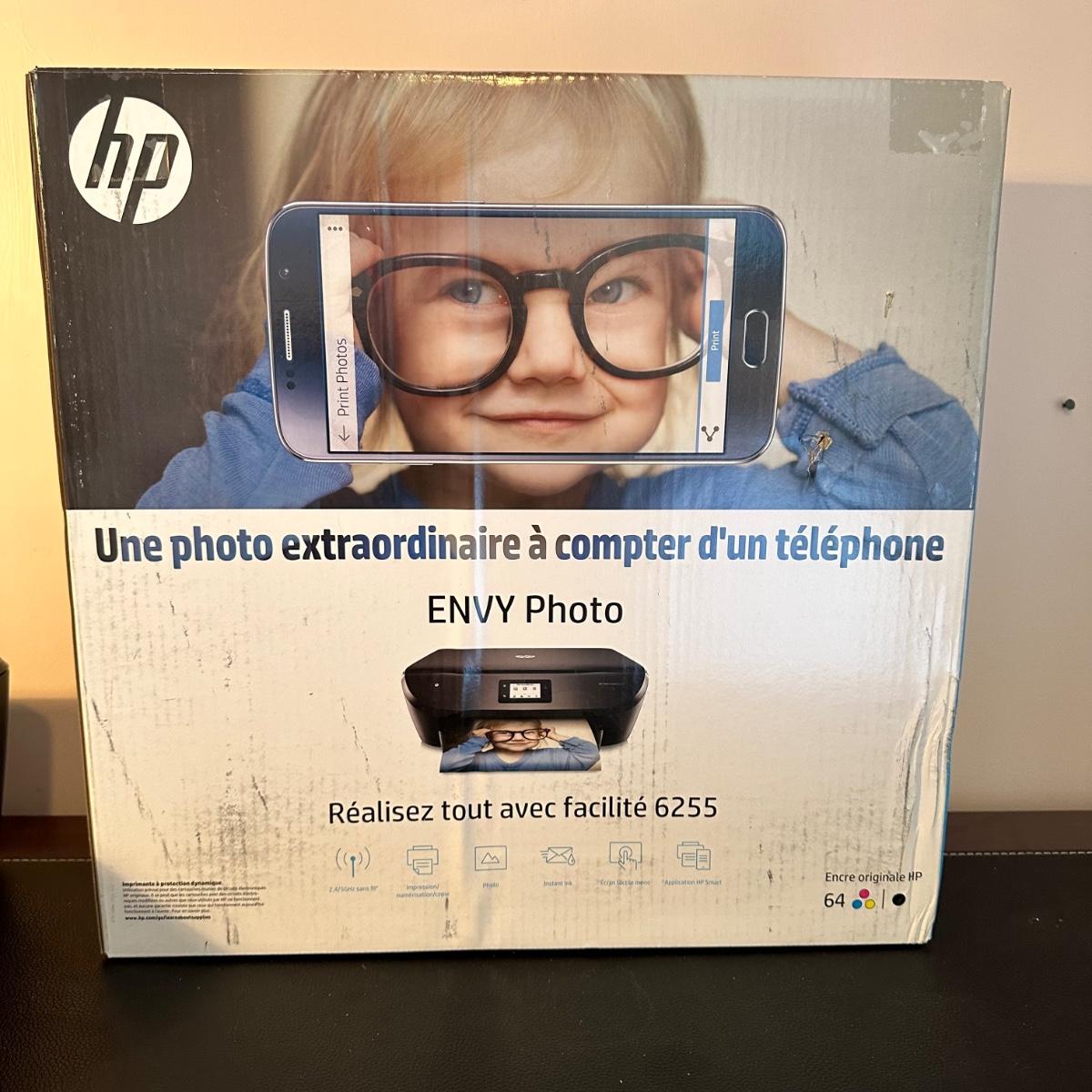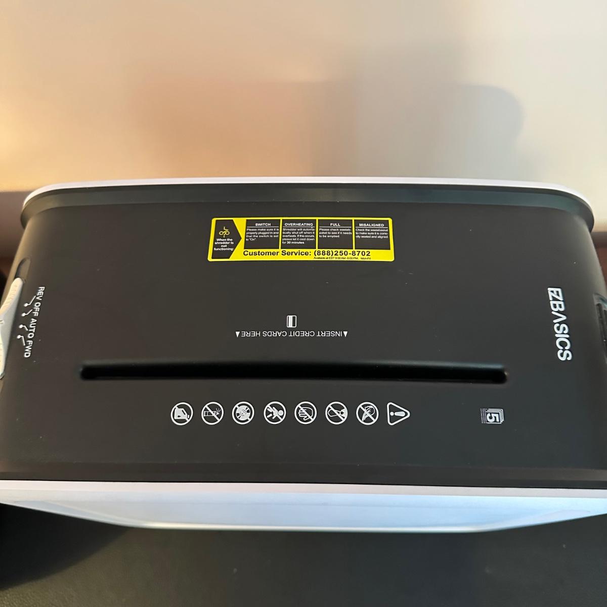 HP Envy Photo 6255 printer with original box and one pack of 20LB/500 sheet copy paper. Includes USB cable. EZBASICS E01C paper shredder with user guide. Both power on when plugged in. Local pickup only.