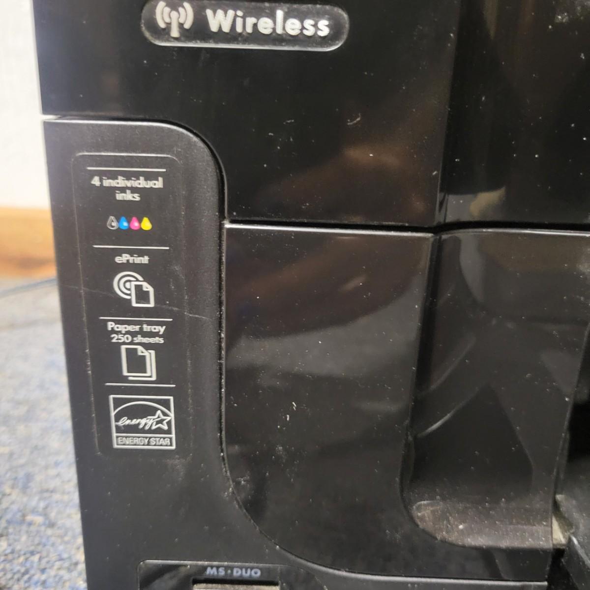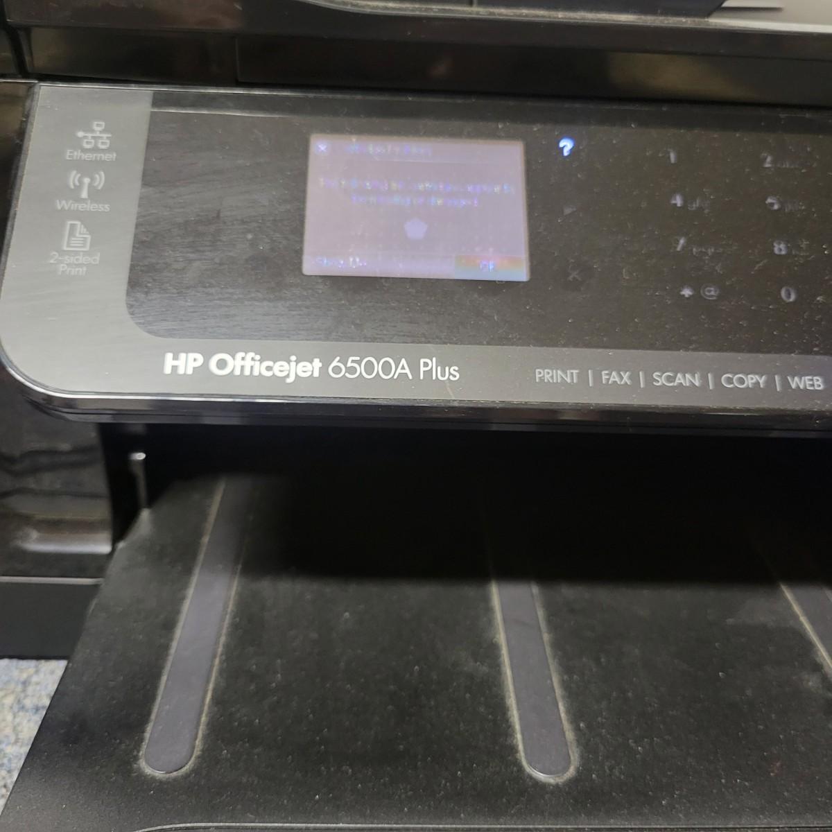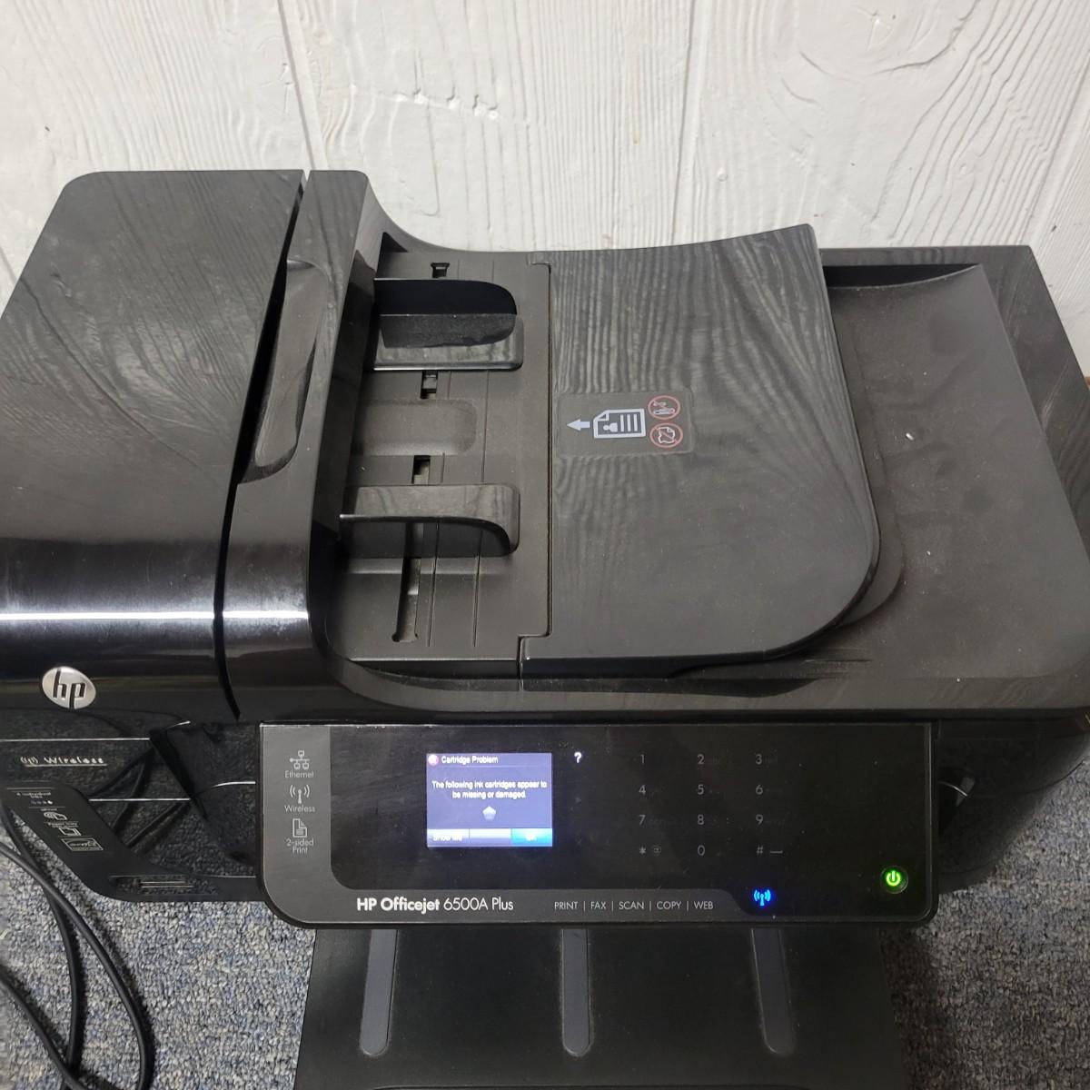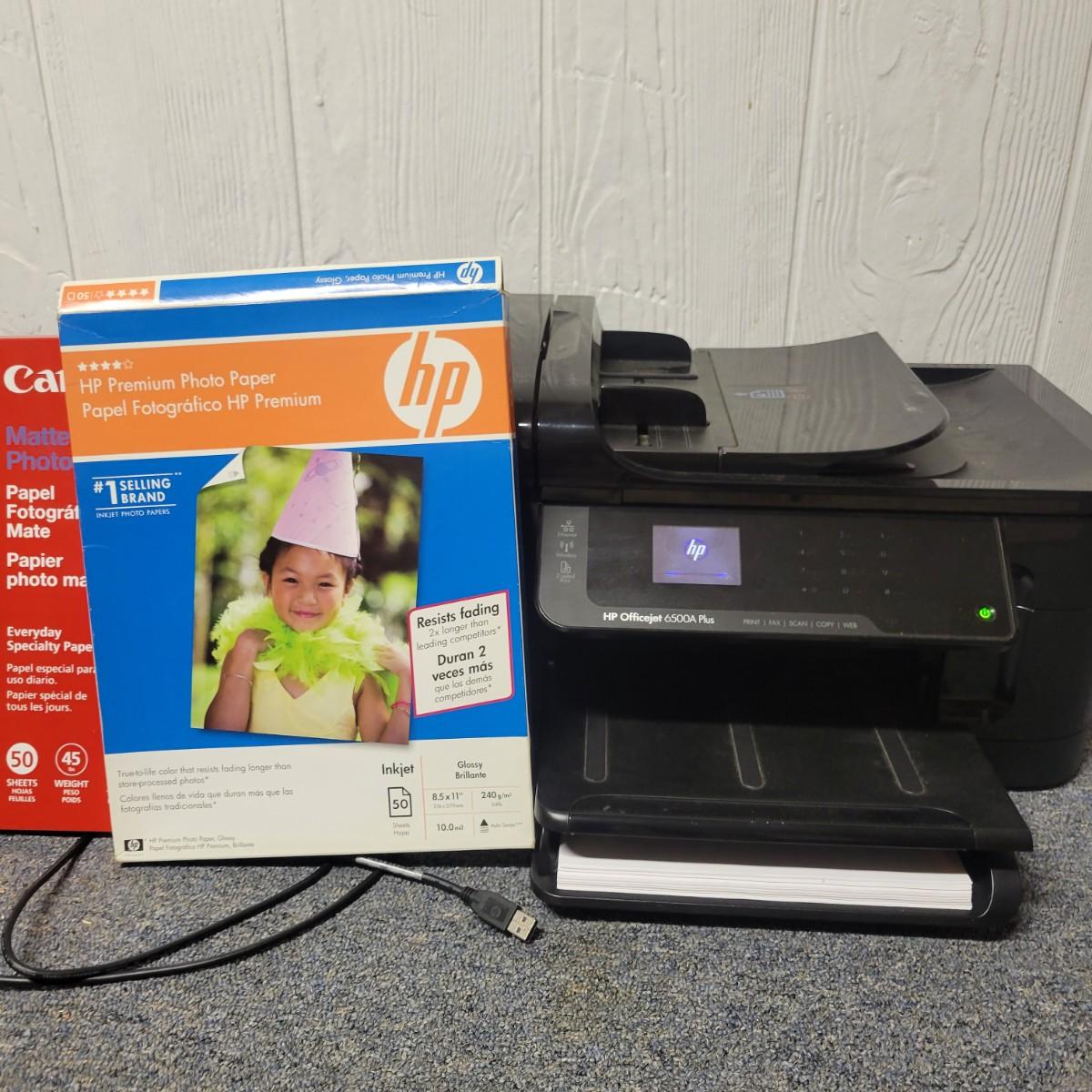 An Hewitt Packer Officejet 6500A Plus printer in good condition with no noticeable defects. Unit was powered on and works. Lot includes a USB cable and two packages of photo paper. The box of Cannon photo paper appears to be full and the HP package is about half full. Local pickup only