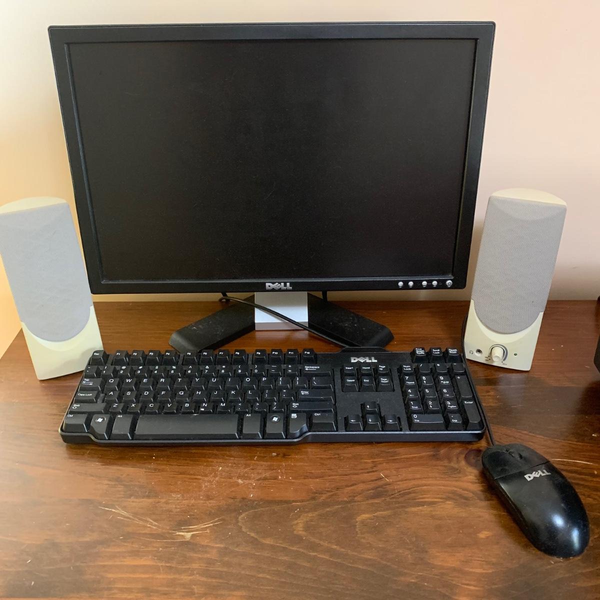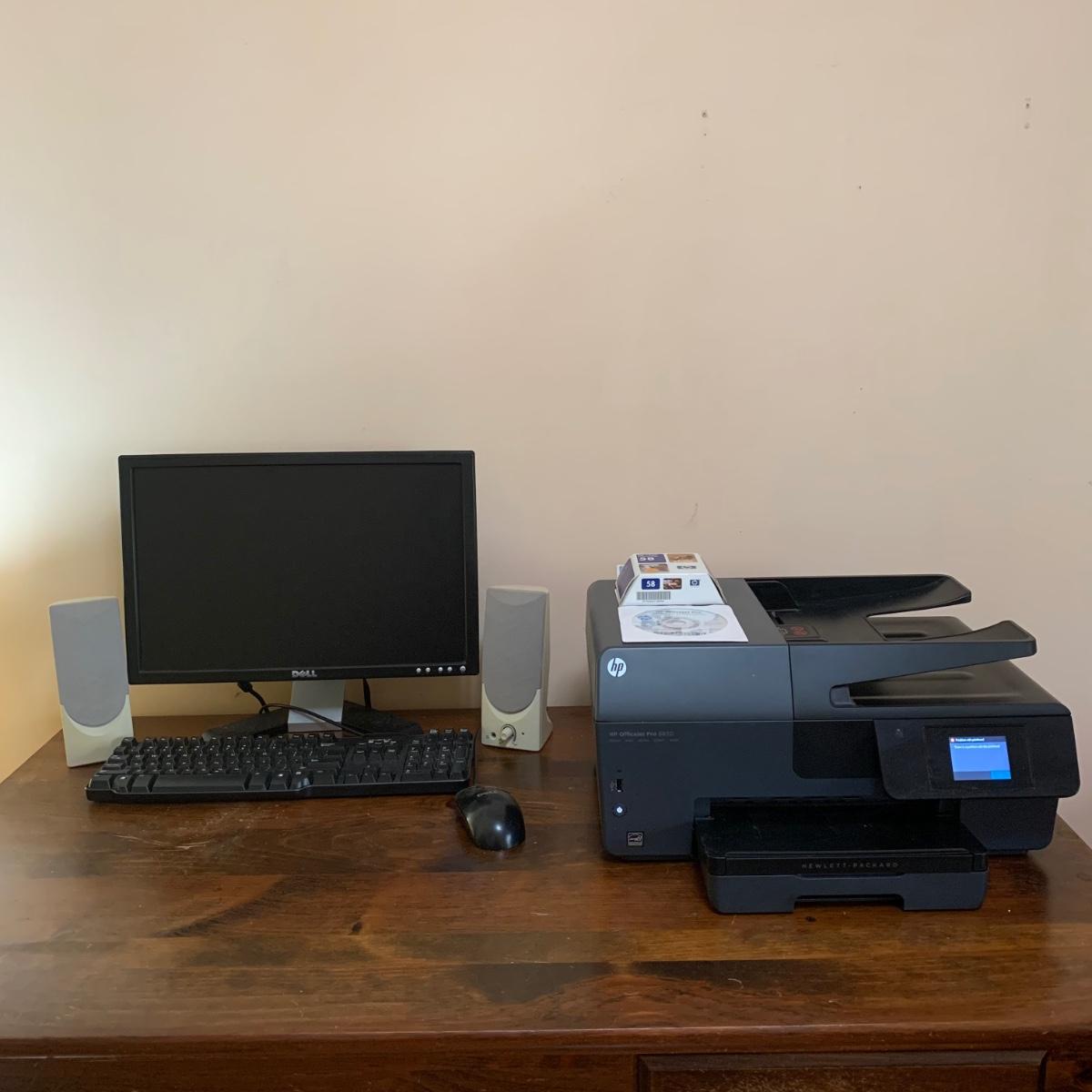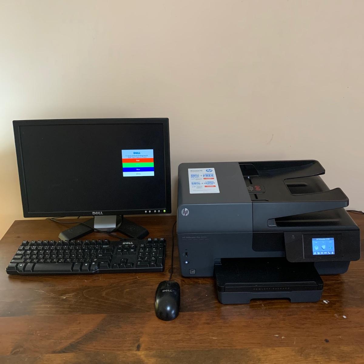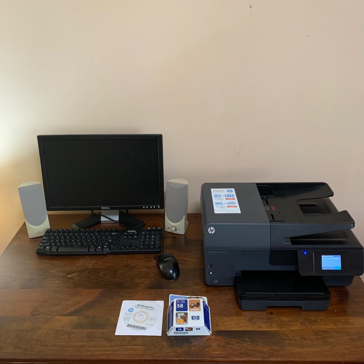 This lot includes a HP Officejet 6830 printer, 19” Dell Monitor, Dell Keyboard, Dell mouse, speakers, and Belkin power strip. All items power on, are in good condition, and come with power adapters. Printer head will likely need to be cleaned due to message on printer display, see photos for details. Lot does not include CPU.