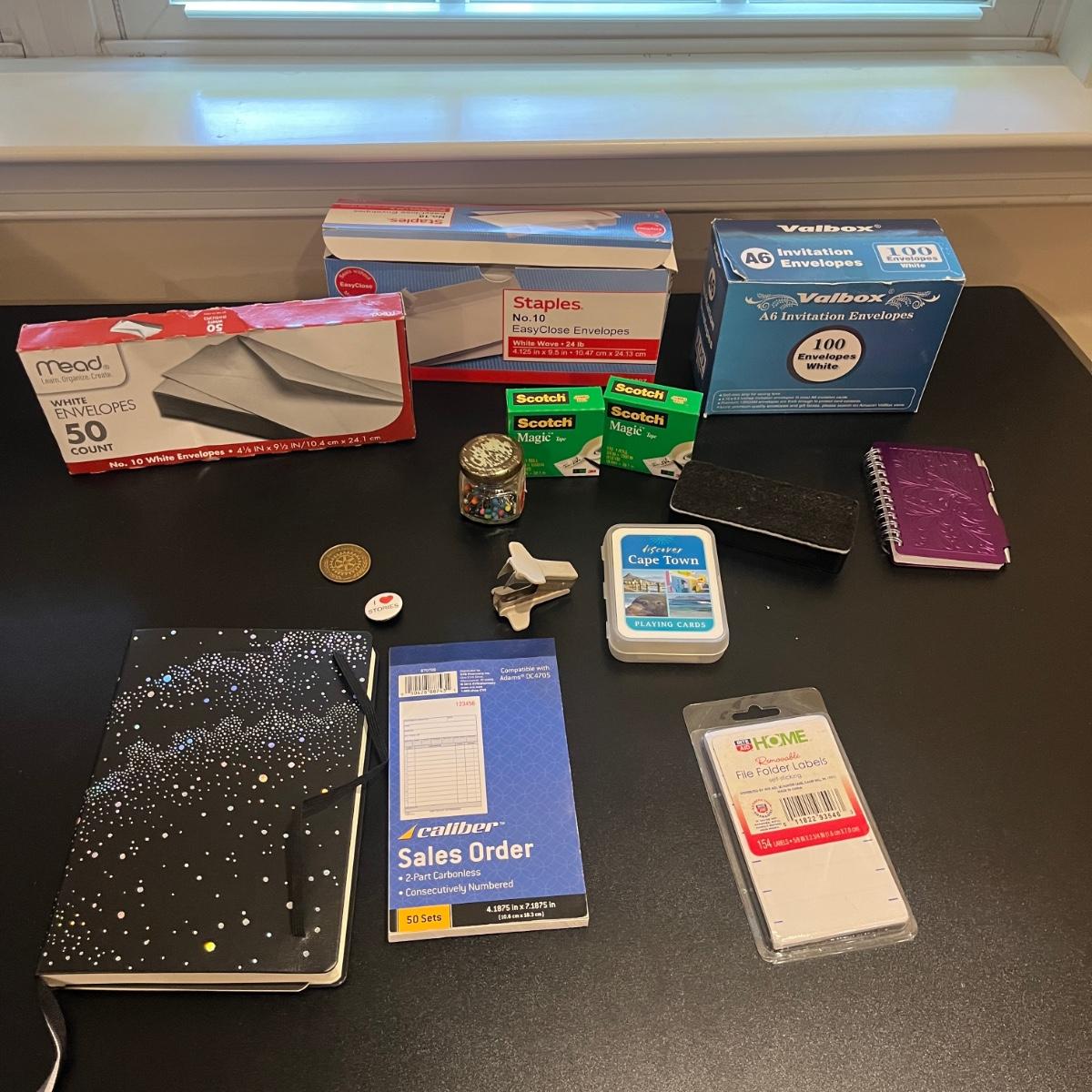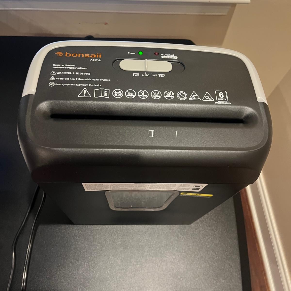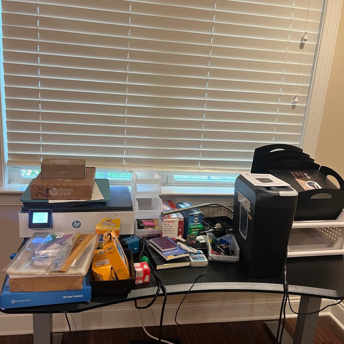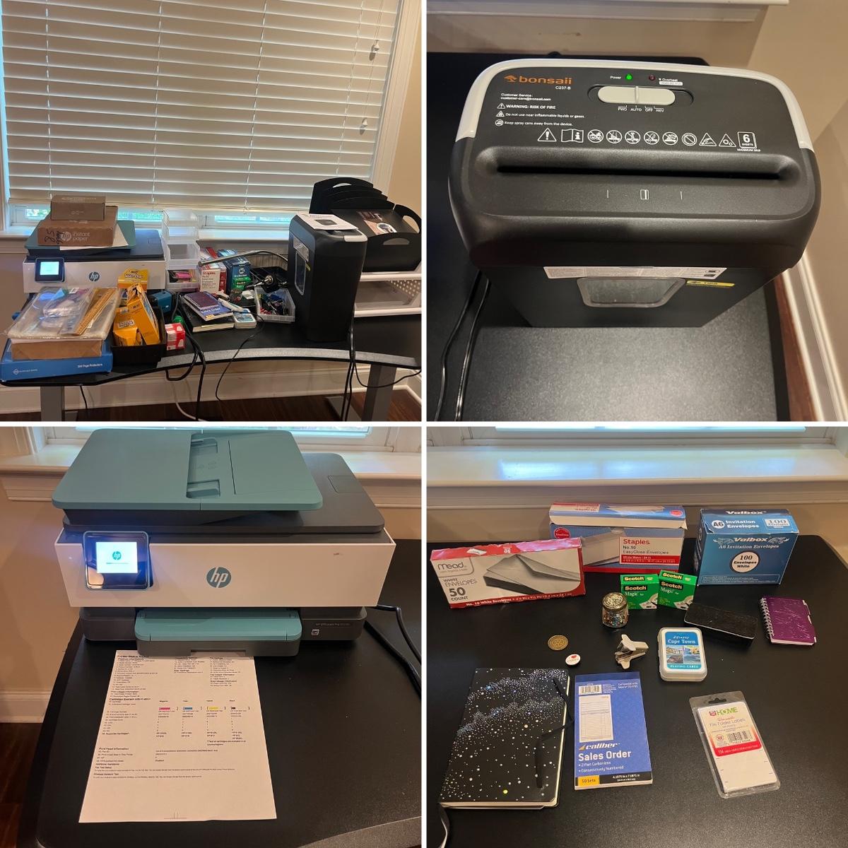 Lot includes a Bonsaii shredder, HP Officejet Pro 8028E printer with ink and paper, Studio Designs clamp light, plastic bins, pens, envelopes, file holders, rulers and more. Printer measures 18” x 20” x 10”H.